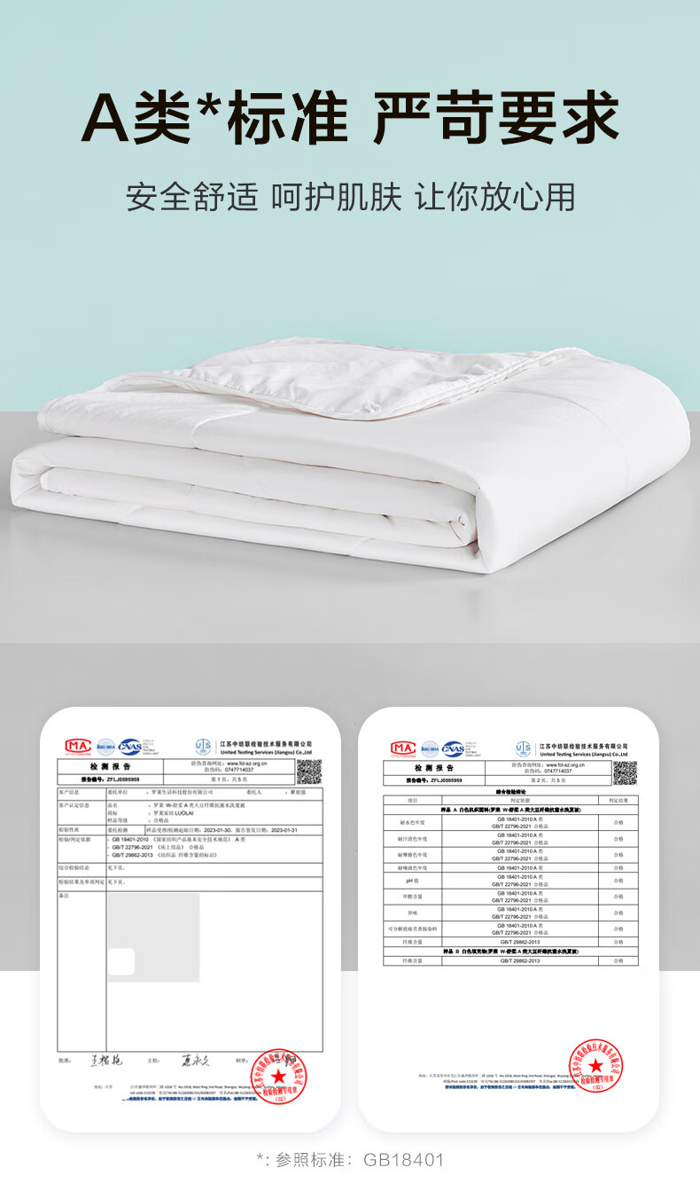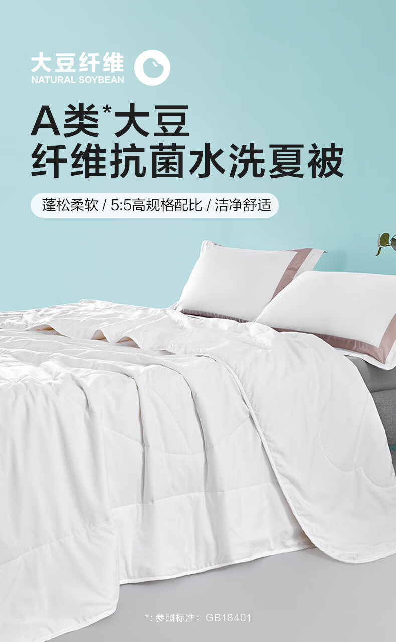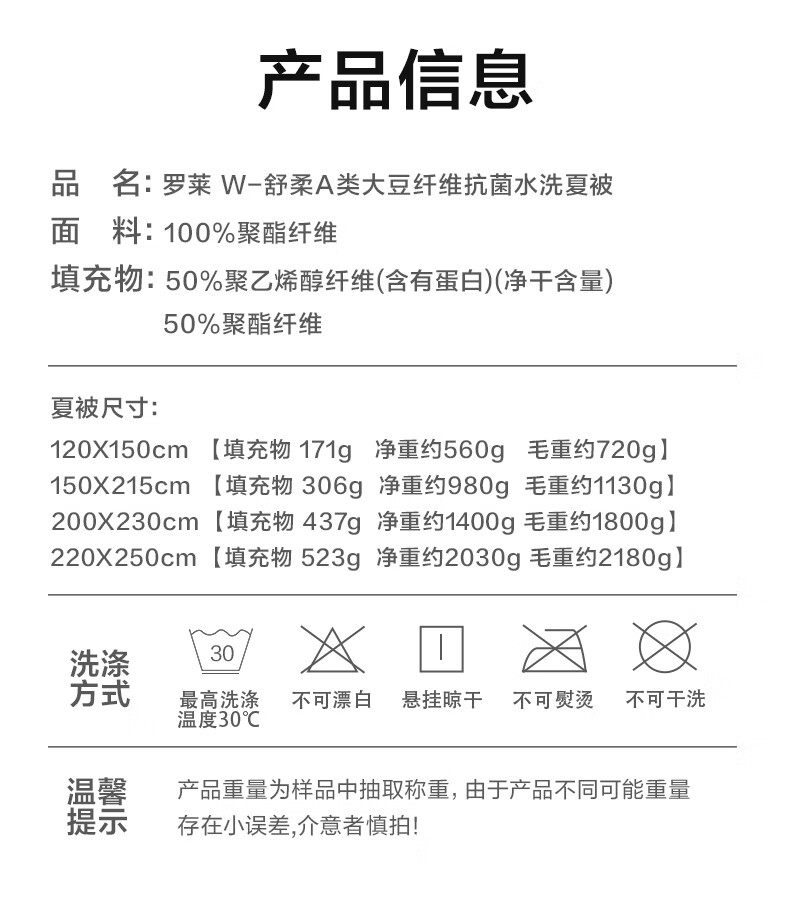 罗莱家纺A类50大豆被抗菌可机洗水洗夏被空调被 舒柔A类大豆纤维抗菌水洗夏被 120cm*150cm