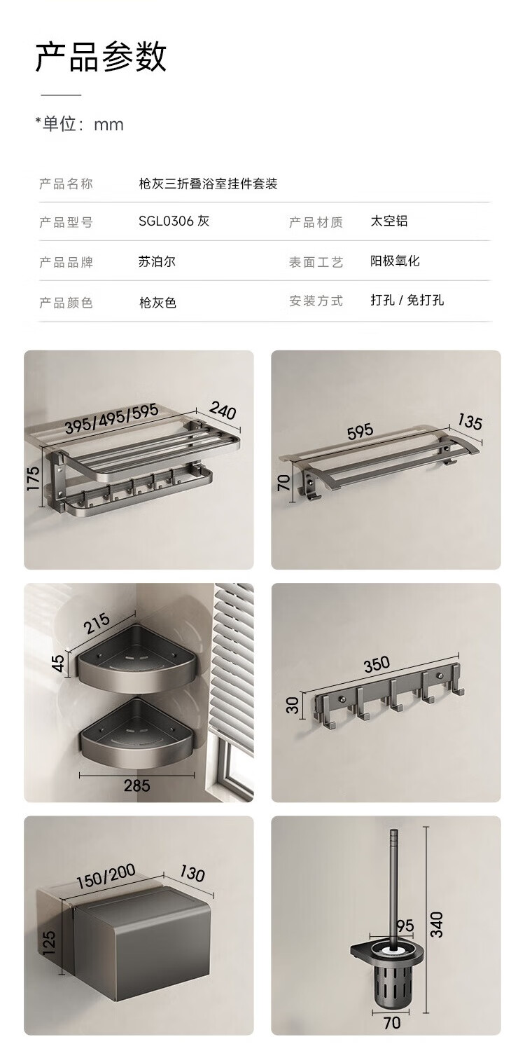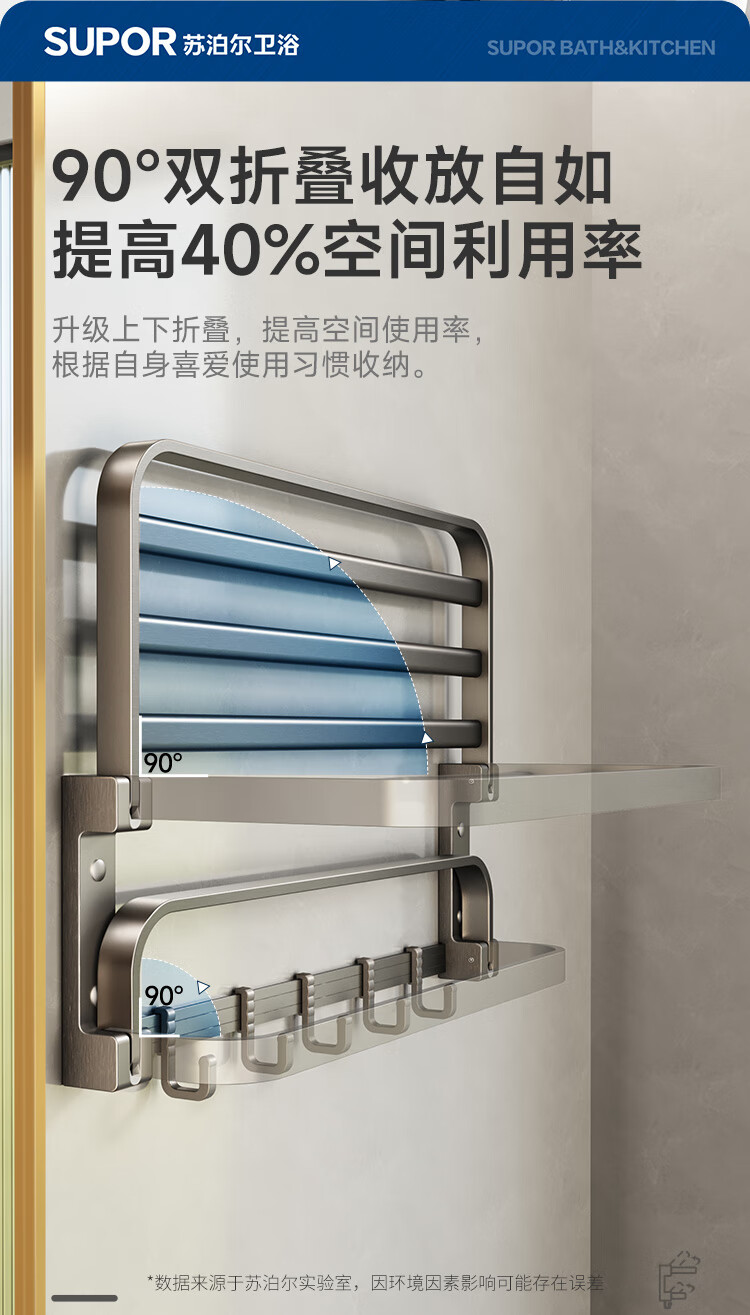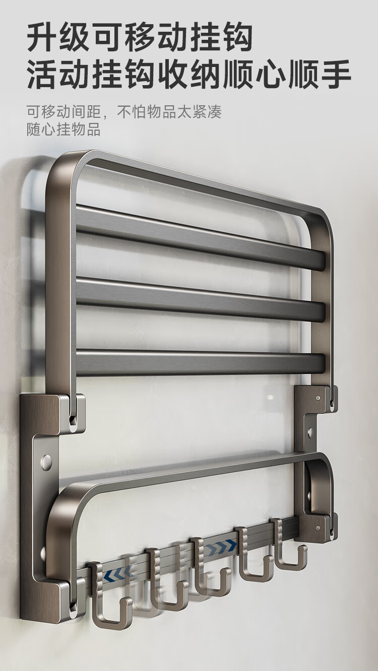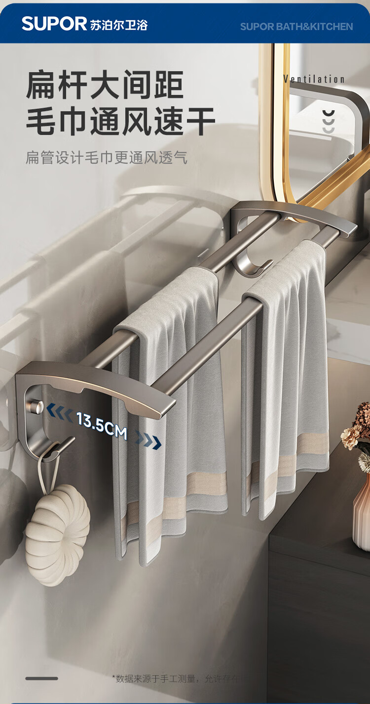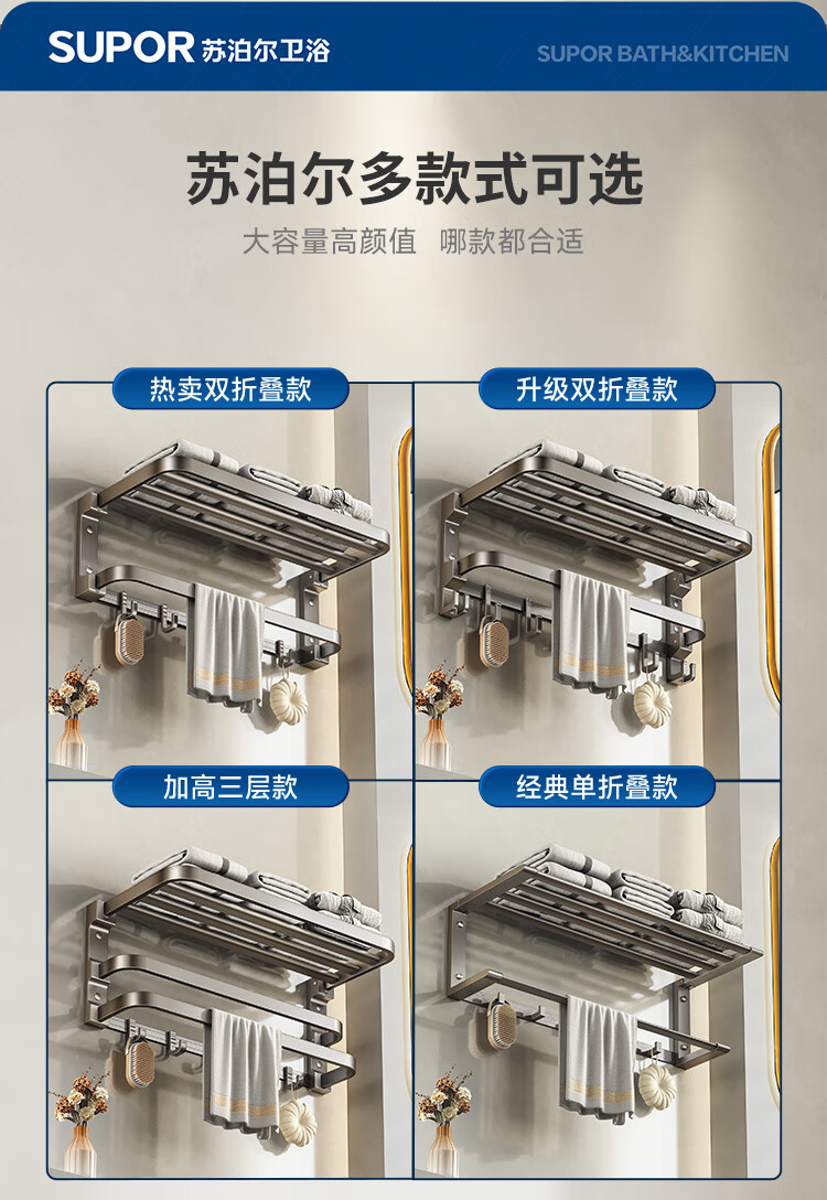 苏泊尔枪灰太空铝毛巾架浴室壁挂式免打孔卫生间置物架厕所洗手间浴巾架 枪灰双折叠三件套