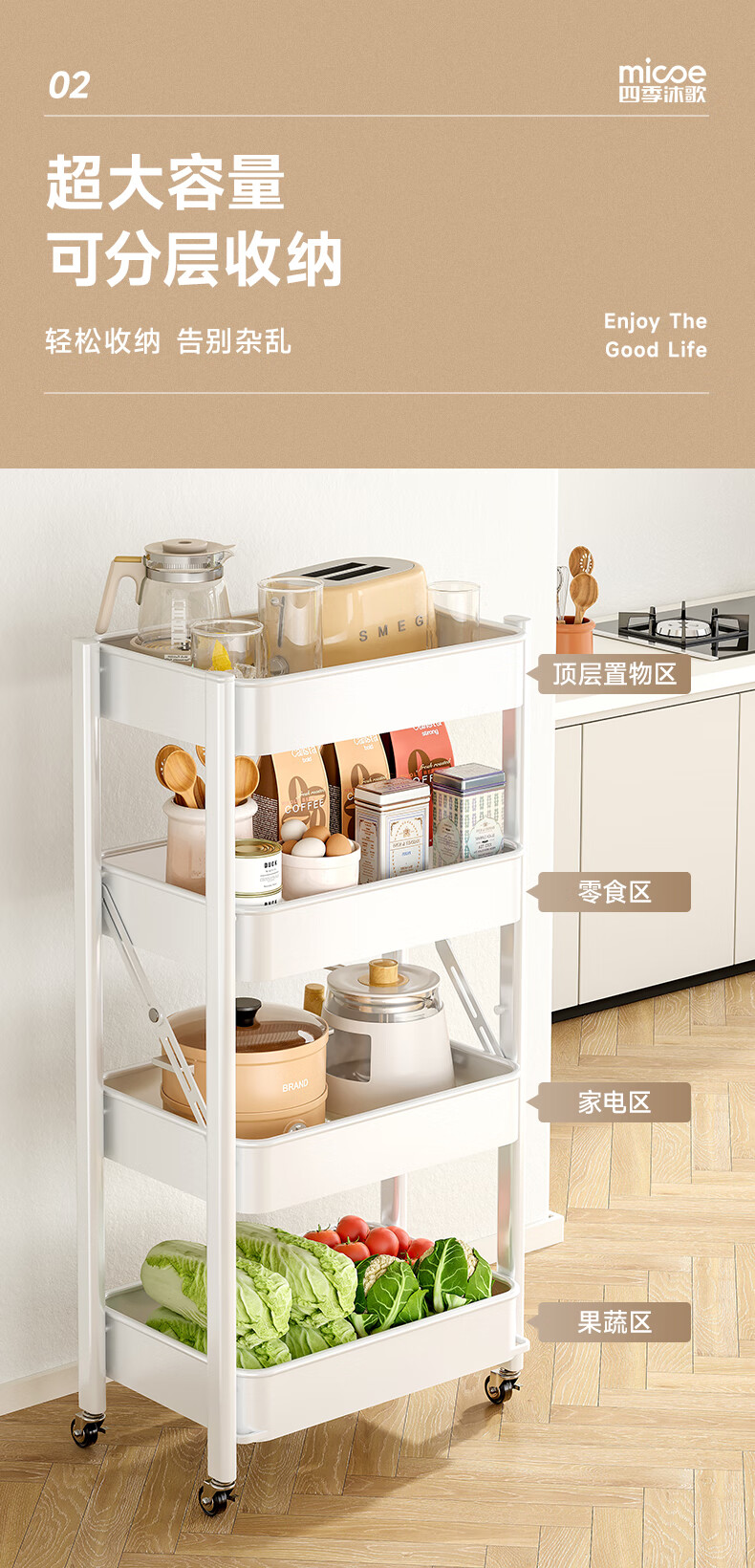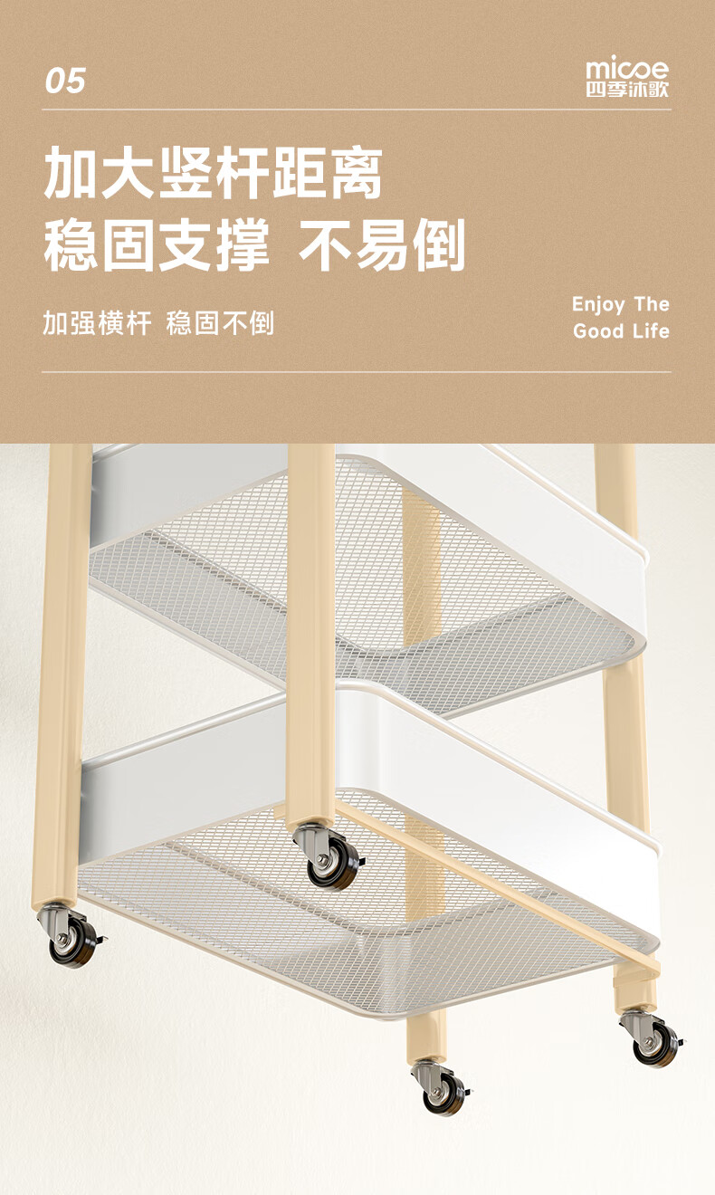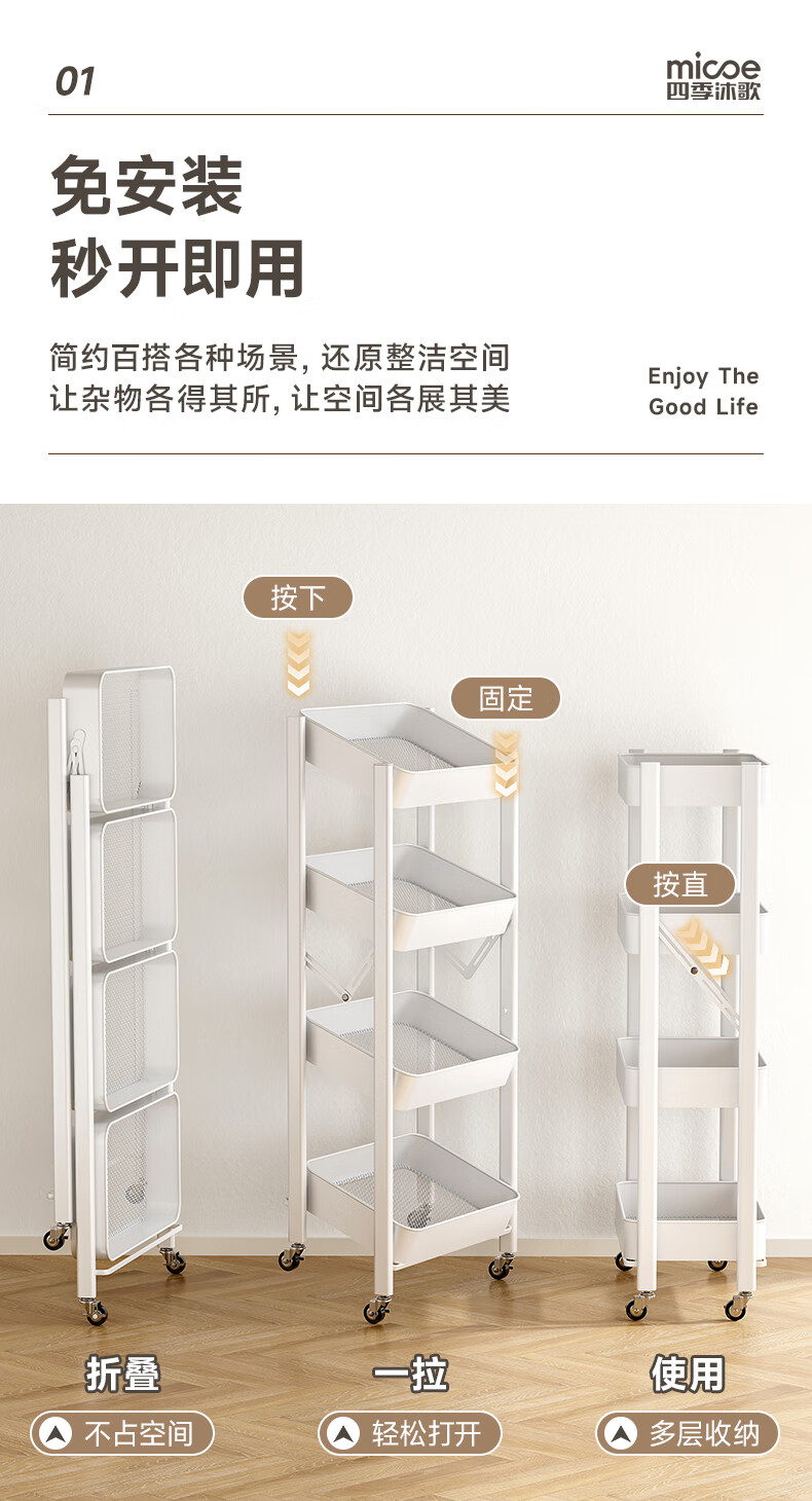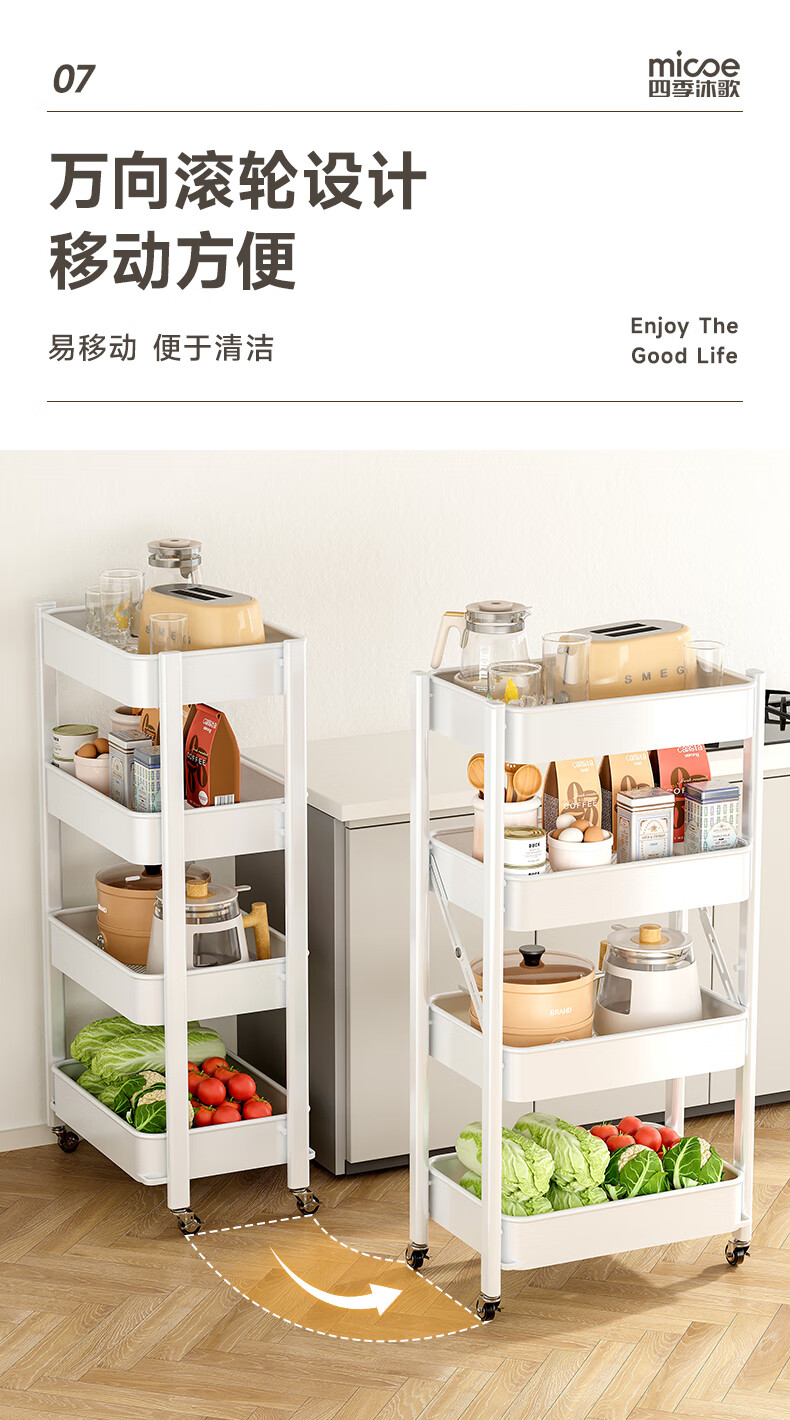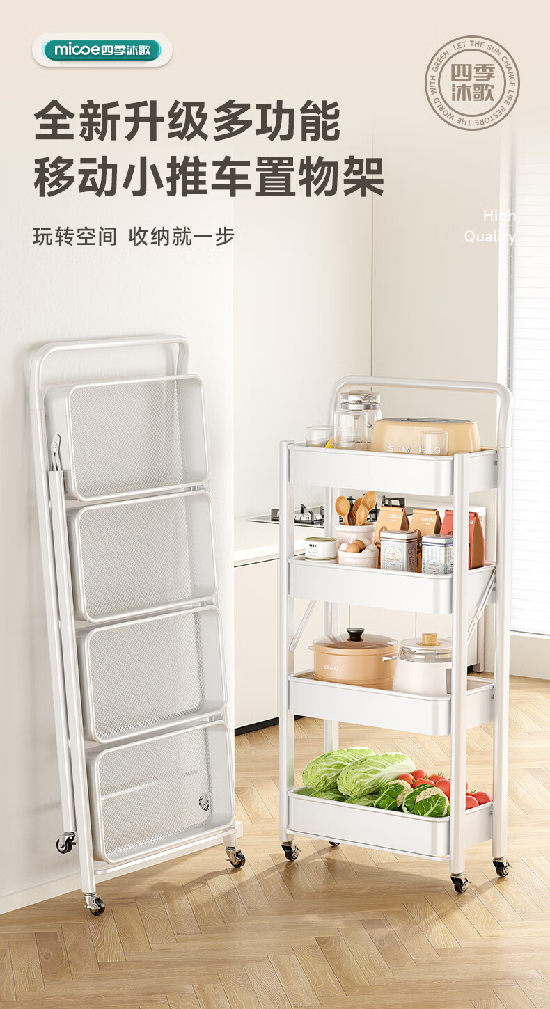 四季沐歌厨房置物架落地折叠小推车置物架免安装零食收纳储物移动果蔬菜篮 3层耀黑【可折叠】常规款