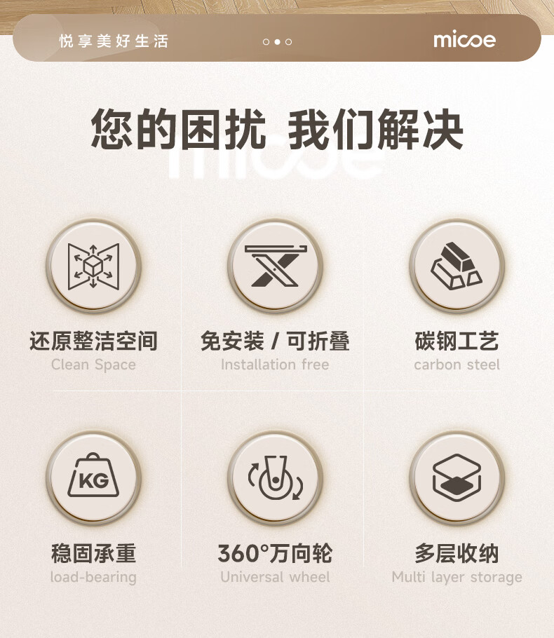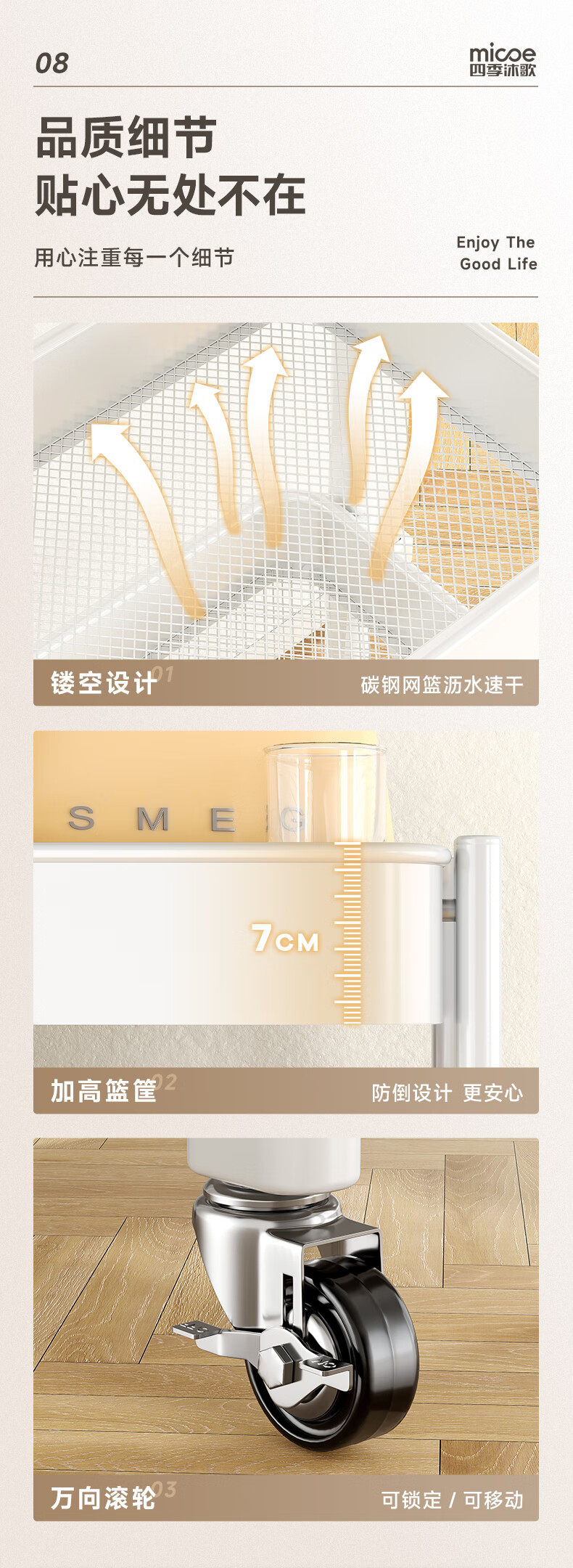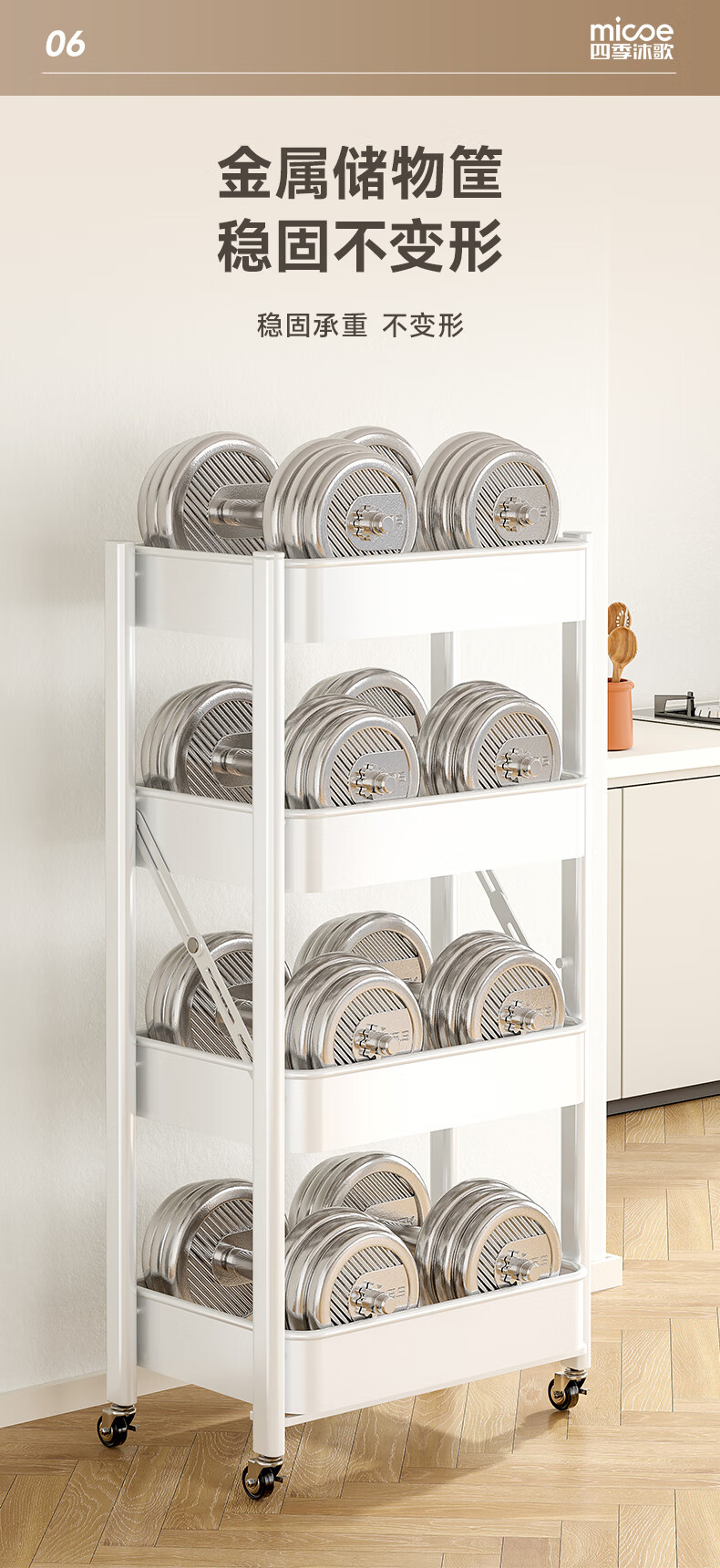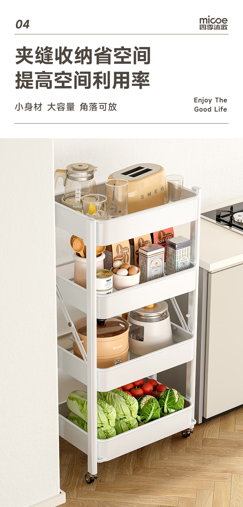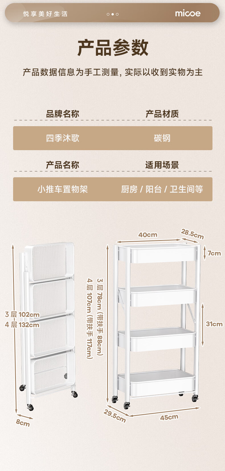 四季沐歌厨房置物架落地折叠小推车置物架免安装零食收纳储物移动果蔬菜篮 3层耀黑【可折叠】常规款