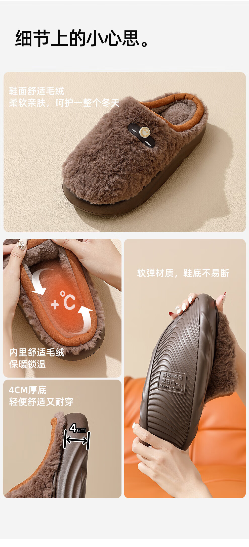 FZT轻奢毛绒保暖棉拖鞋女秋冬居家软弹舒适亲肤毛绒防滑耐磨厚底拖鞋 咖色 44-45 适合43-44