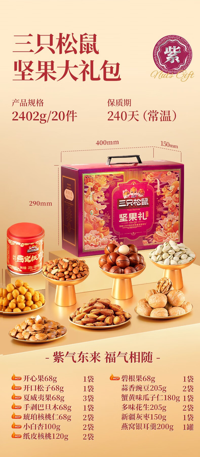 三只松鼠坚果零食礼盒2422g/20件混发 松子开心果送礼长辈干果礼盒礼包