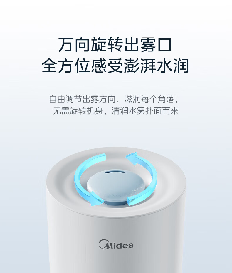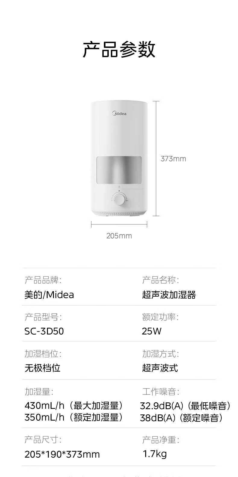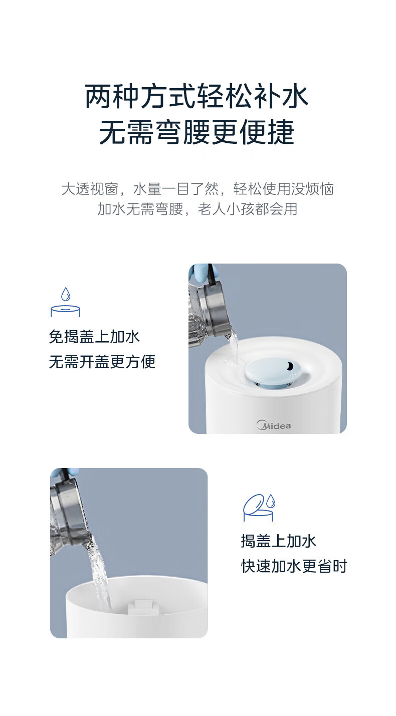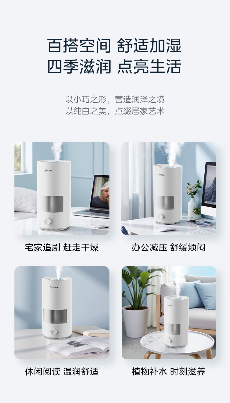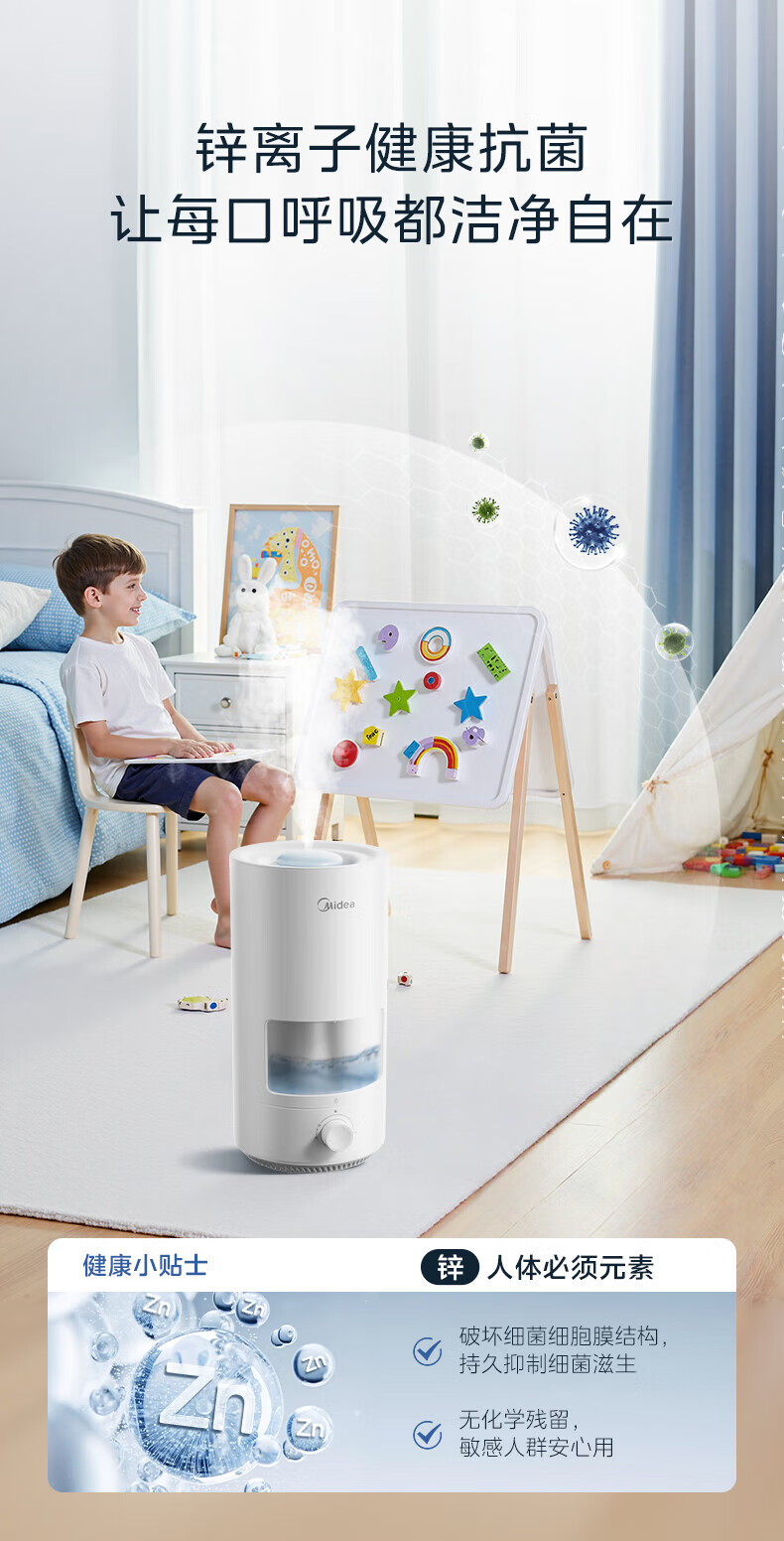 美的(Midea)空气加湿器大雾量家用空调伴侣卧室补水仪小型净化除菌喷雾器宿舍实用超声波雾化器 礼物SC-3D50 【锌离子抗菌】