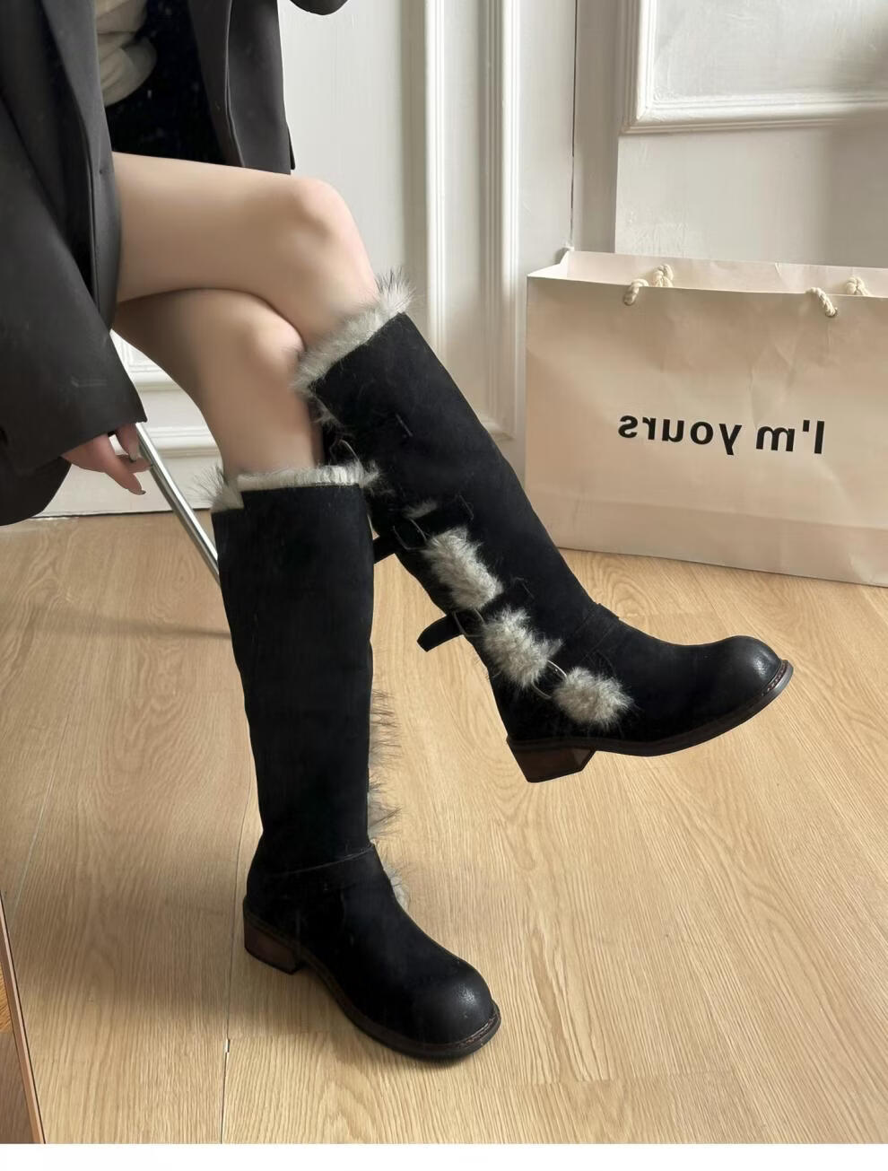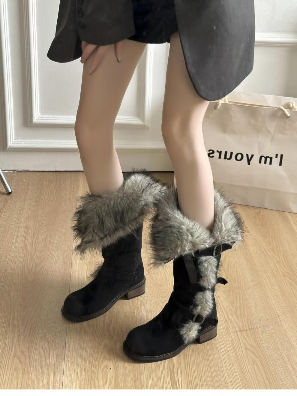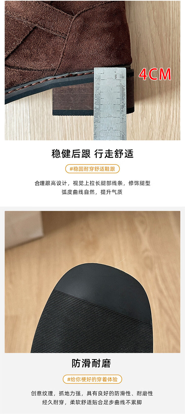 达芙妮短靴女秋季法式高跟瘦瘦靴黑色复古绒面靴子女 黑色 36