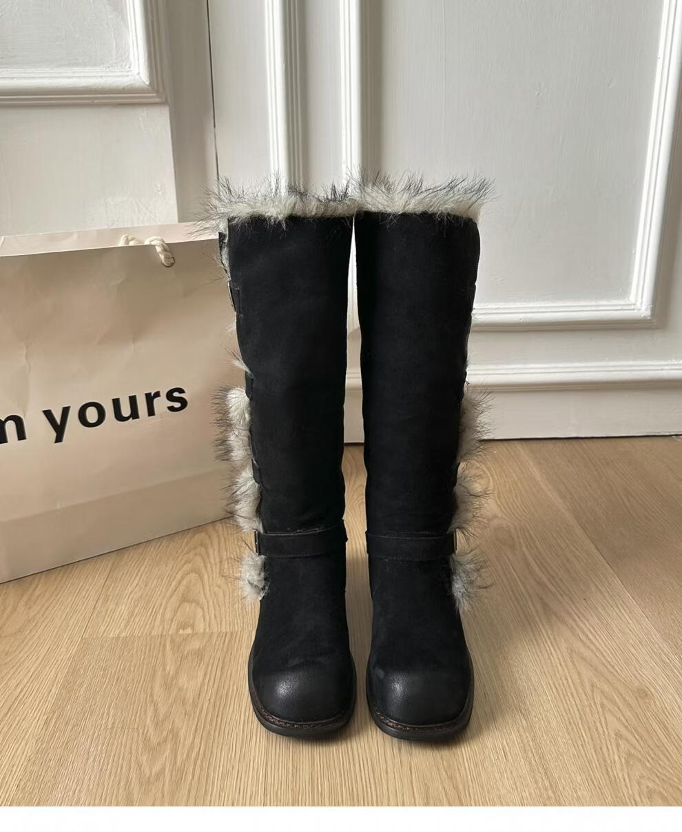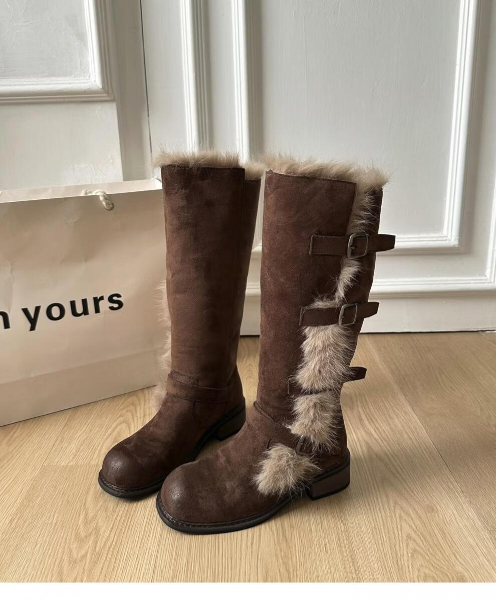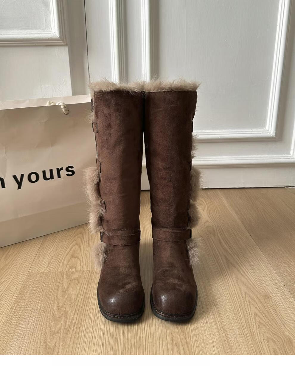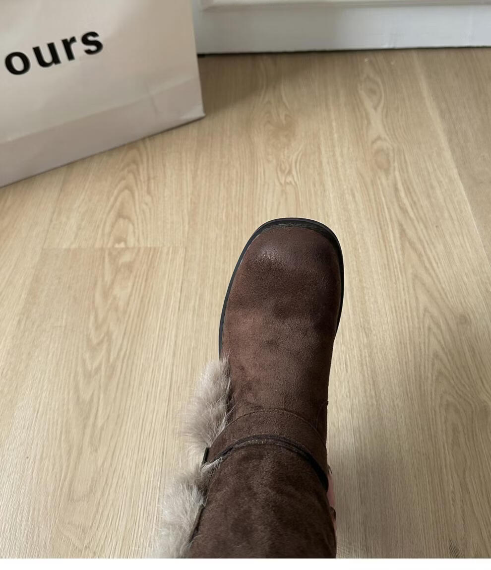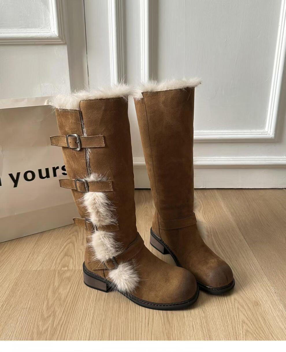 稻草人(MEXICAN)翻毛口雪地靴女长靴2026冬季新款俄式高筒皮带扣加厚绒保暖棉鞋子 焦糖色 【普通版】 35