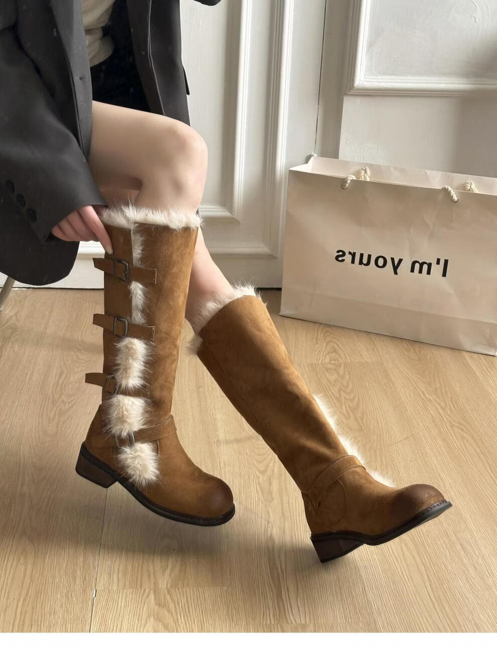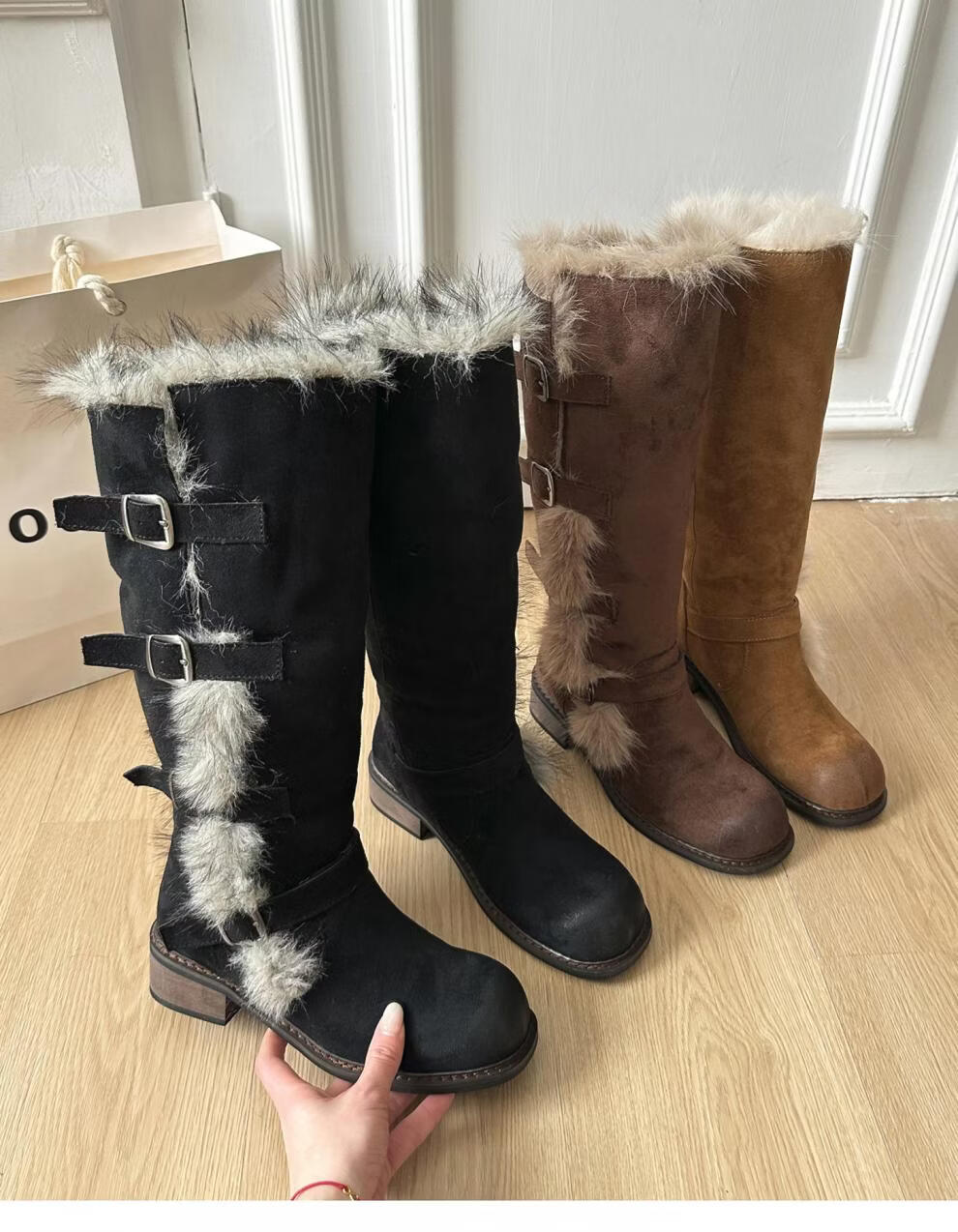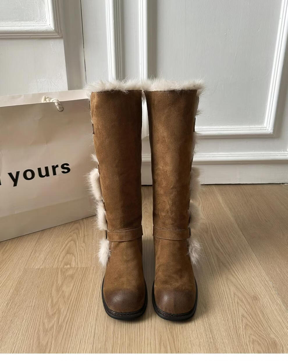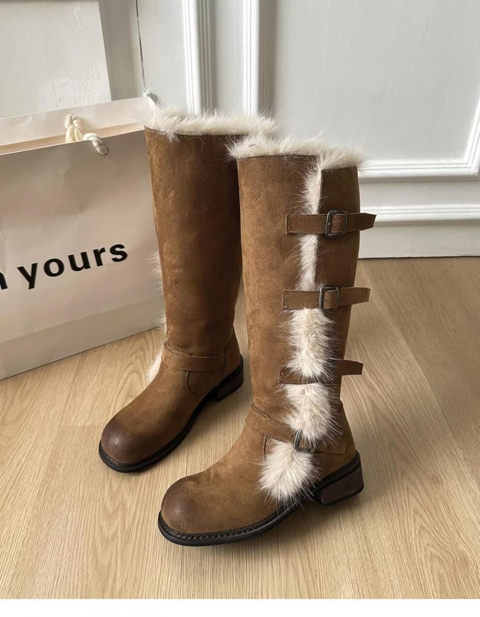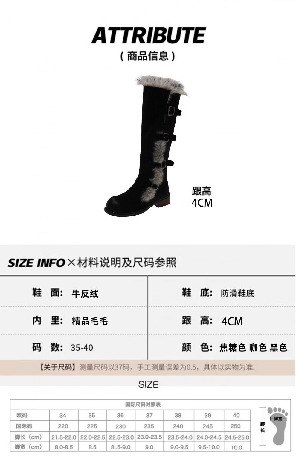 稻草人(MEXICAN)翻毛口雪地靴女长靴2026冬季新款俄式高筒皮带扣加厚绒保暖棉鞋子 焦糖色 【普通版】 35