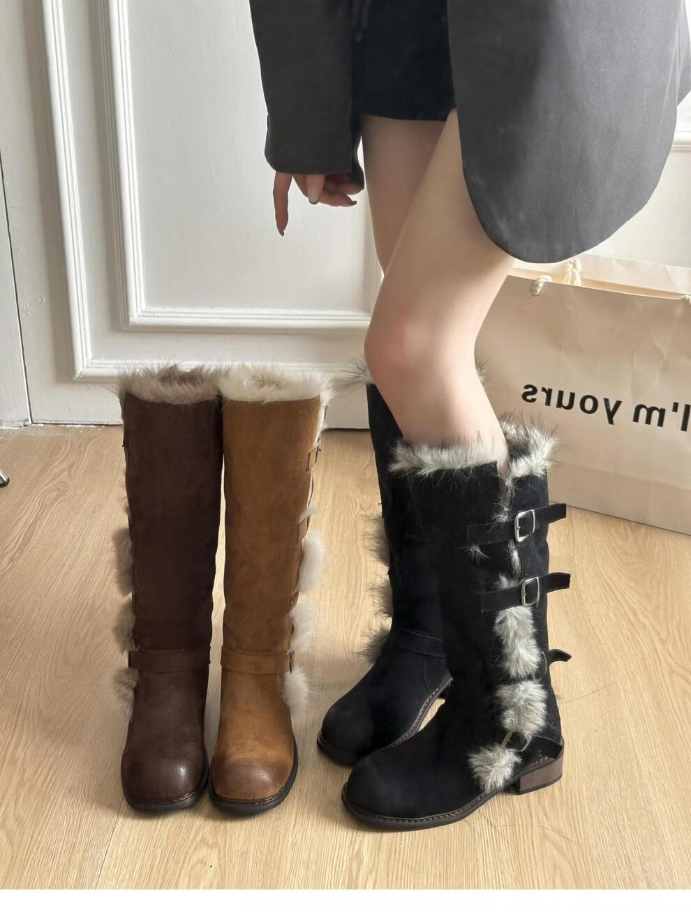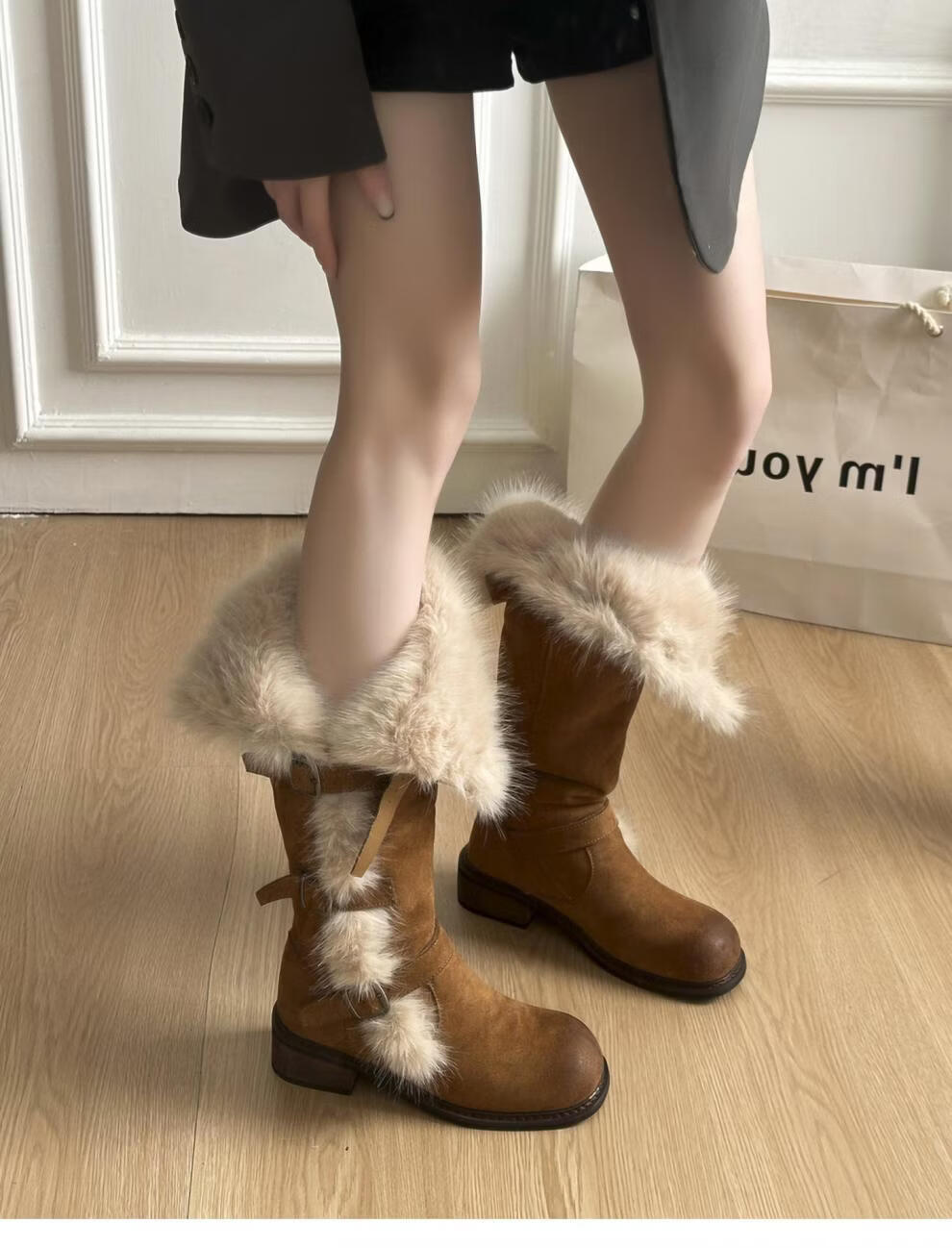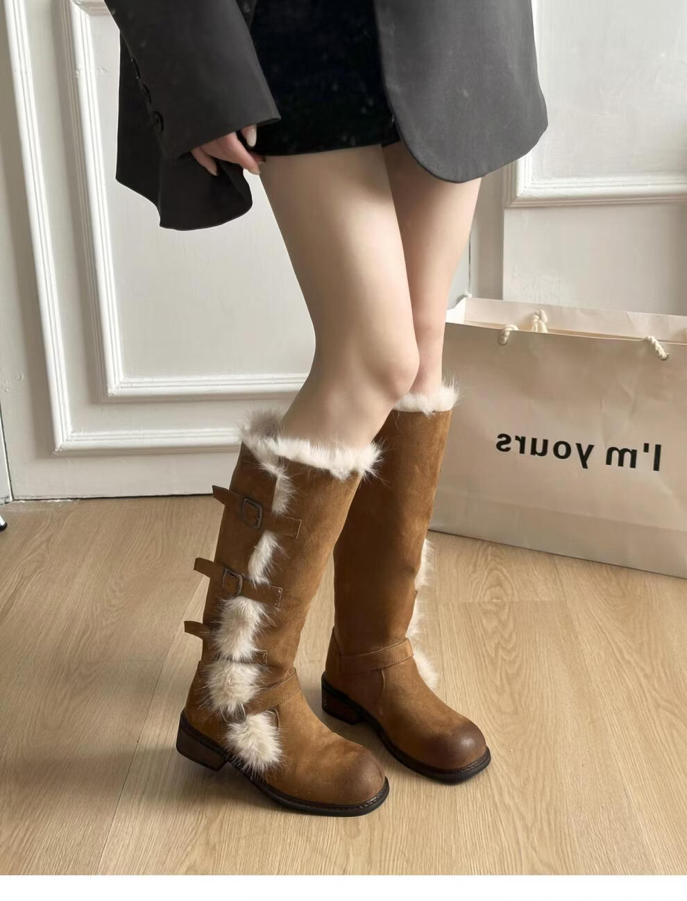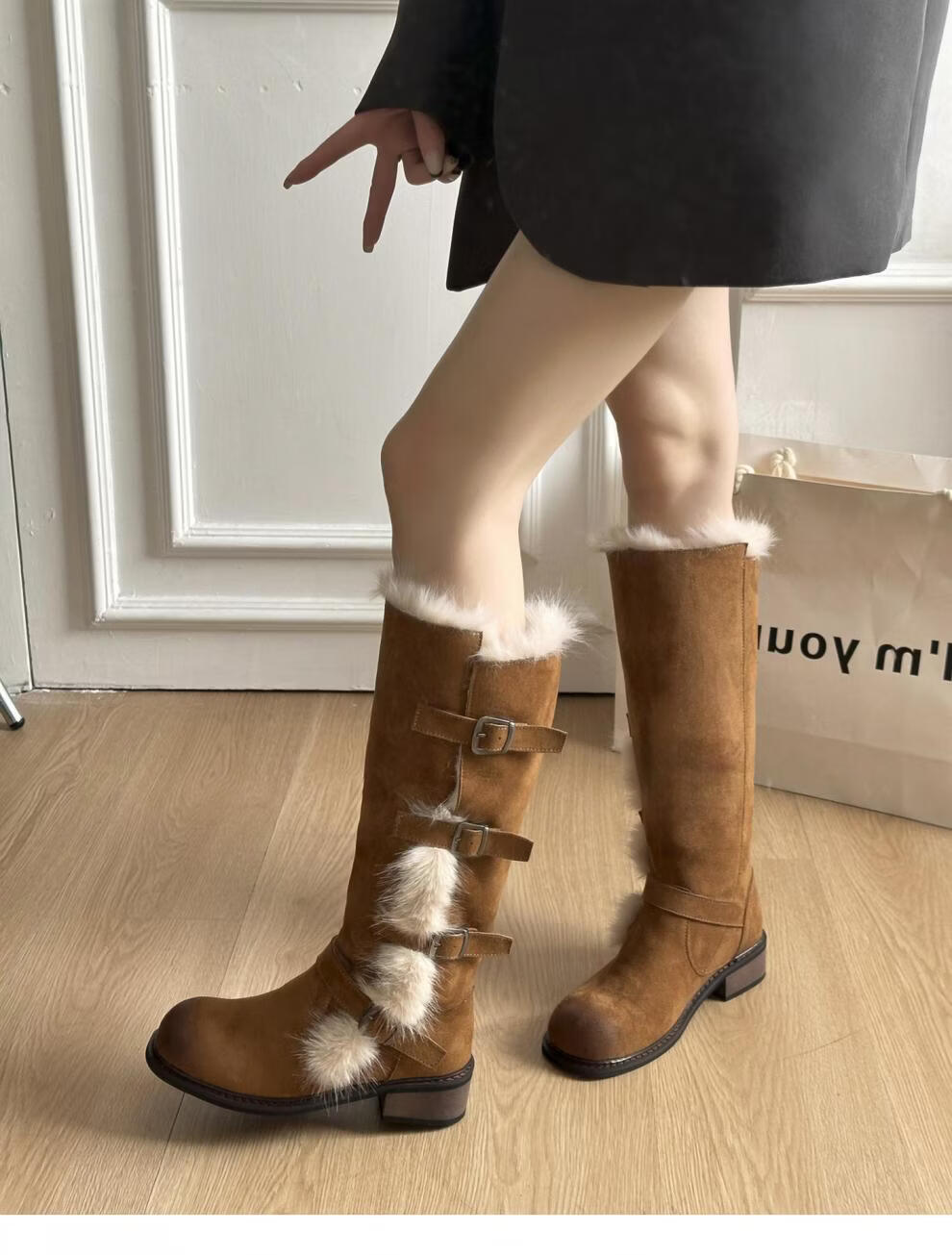 稻草人(MEXICAN)翻毛口雪地靴女长靴2026冬季新款俄式高筒皮带扣加厚绒保暖棉鞋子 焦糖色 【普通版】 35