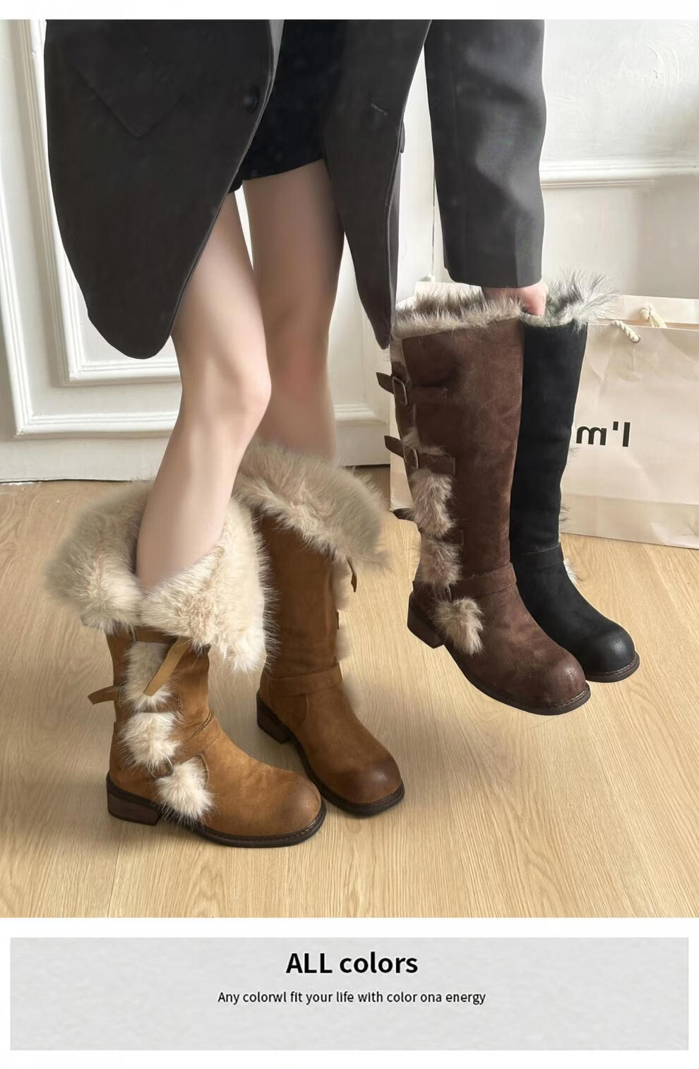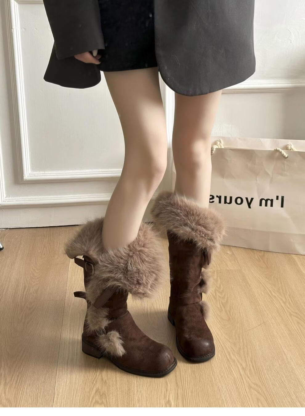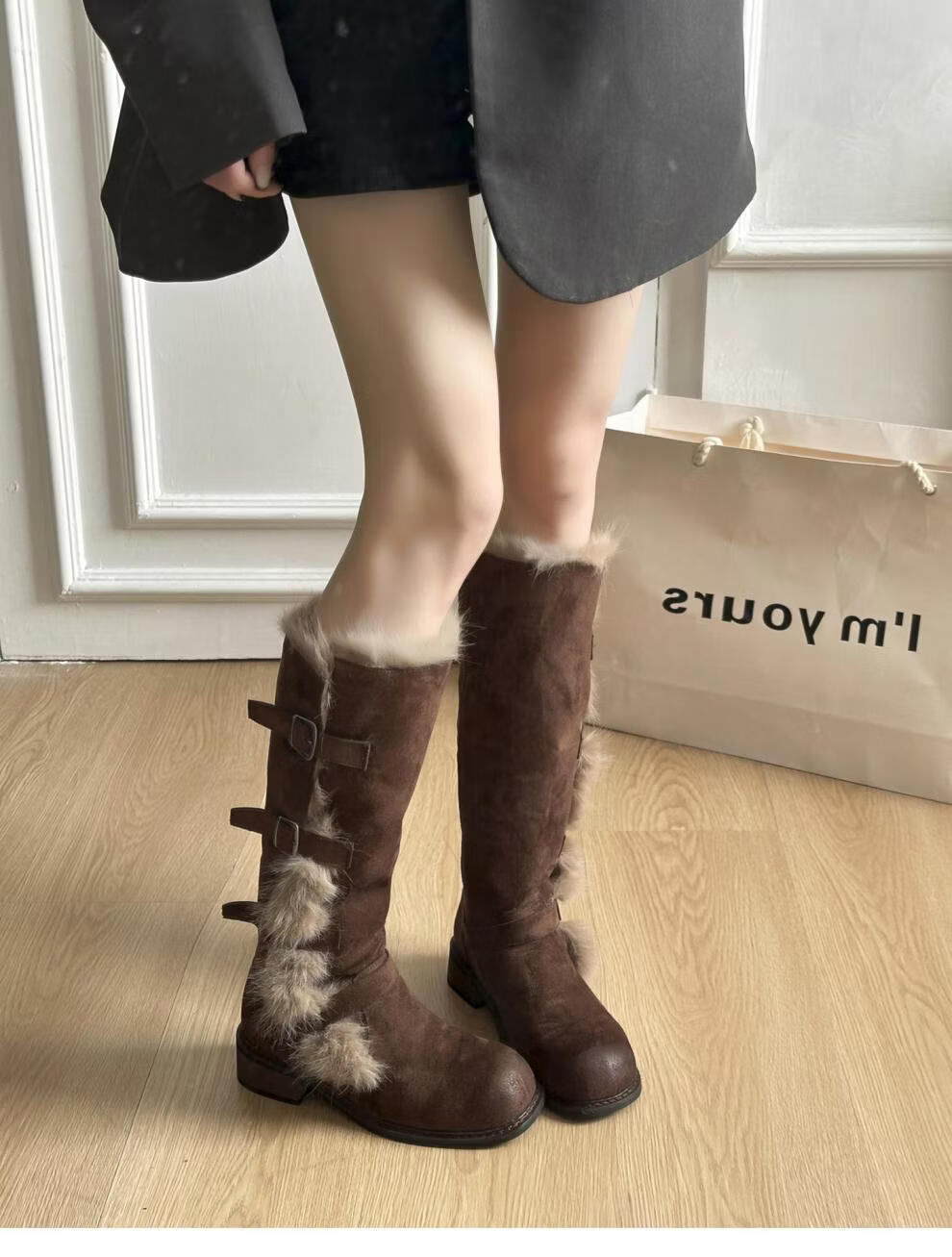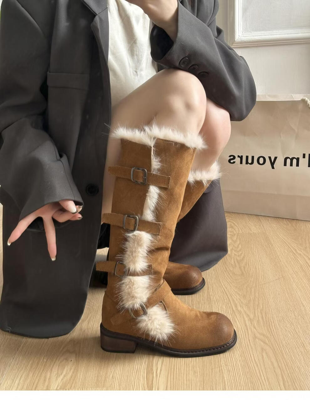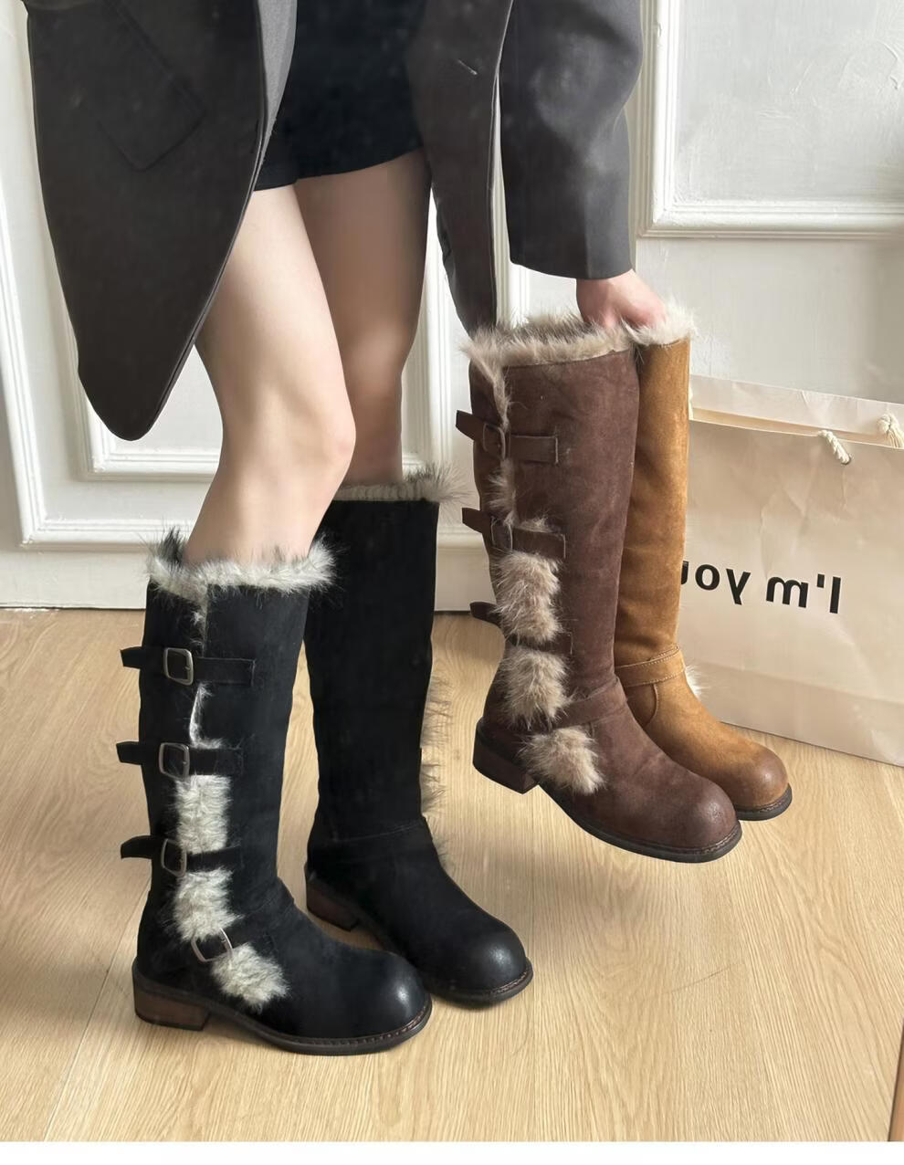稻草人(MEXICAN)翻毛口雪地靴女长靴2026冬季新款俄式高筒皮带扣加厚绒保暖棉鞋子 焦糖色 【普通版】 35
