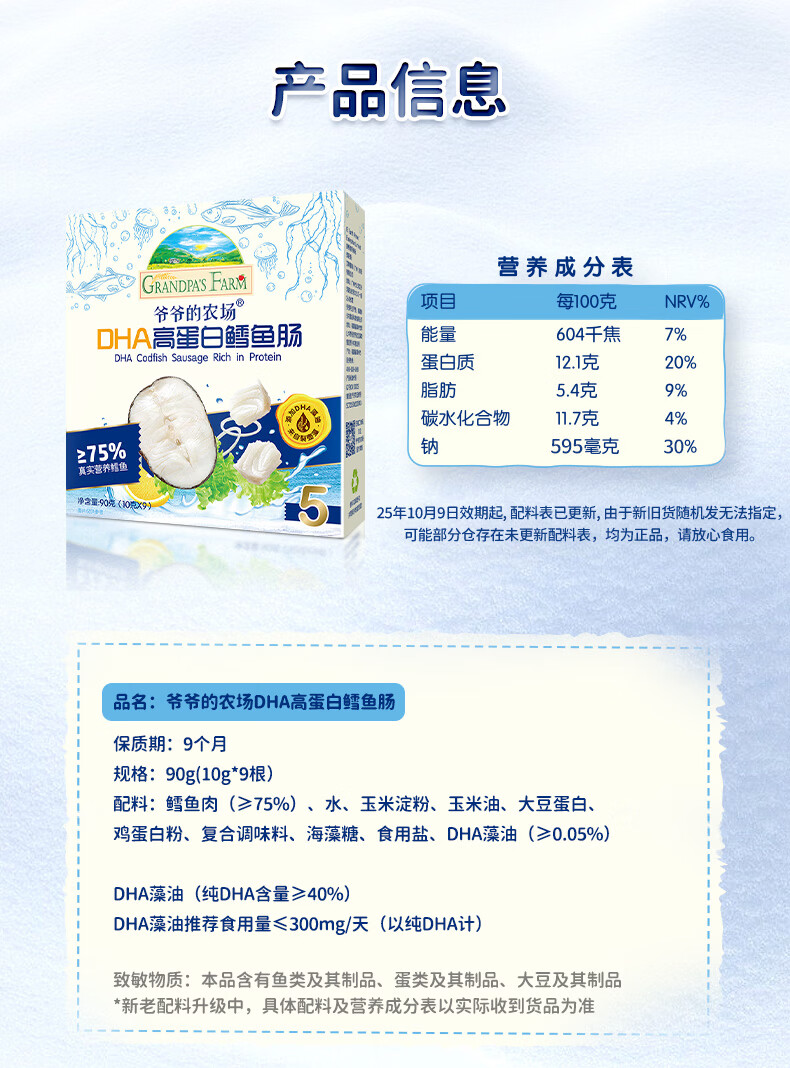 爷爷的农场DHA高蛋白鳕鱼肠儿童宝宝零食真鳕鱼肉即食 出游零食儿童早餐90g