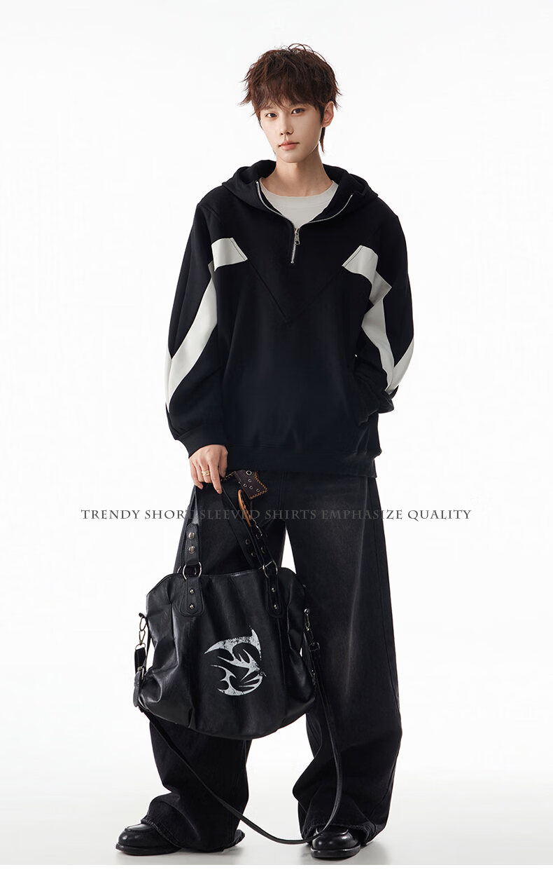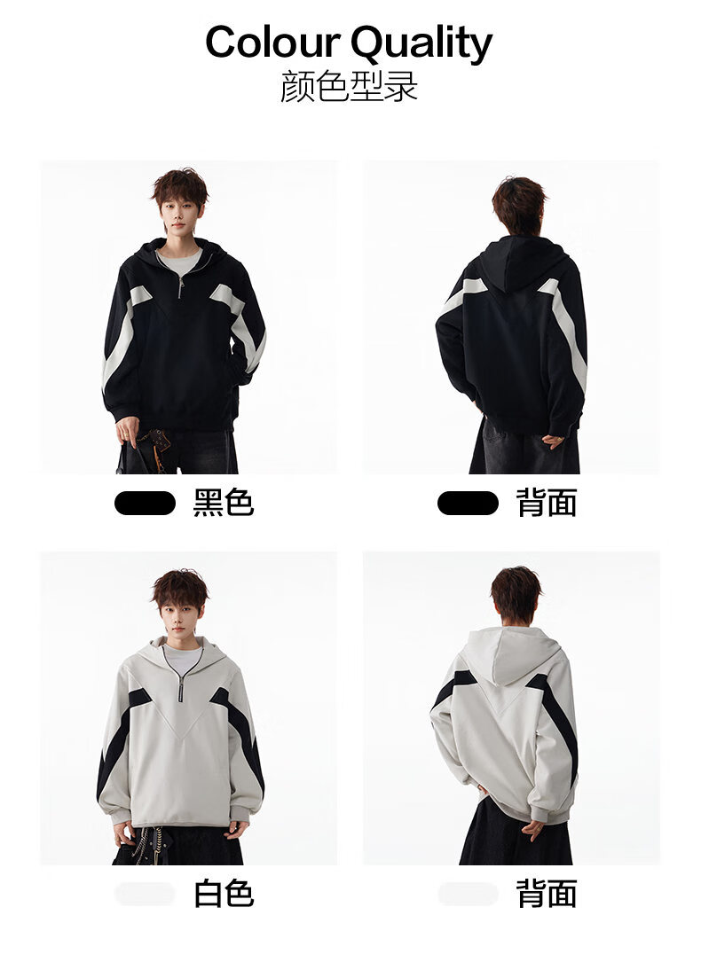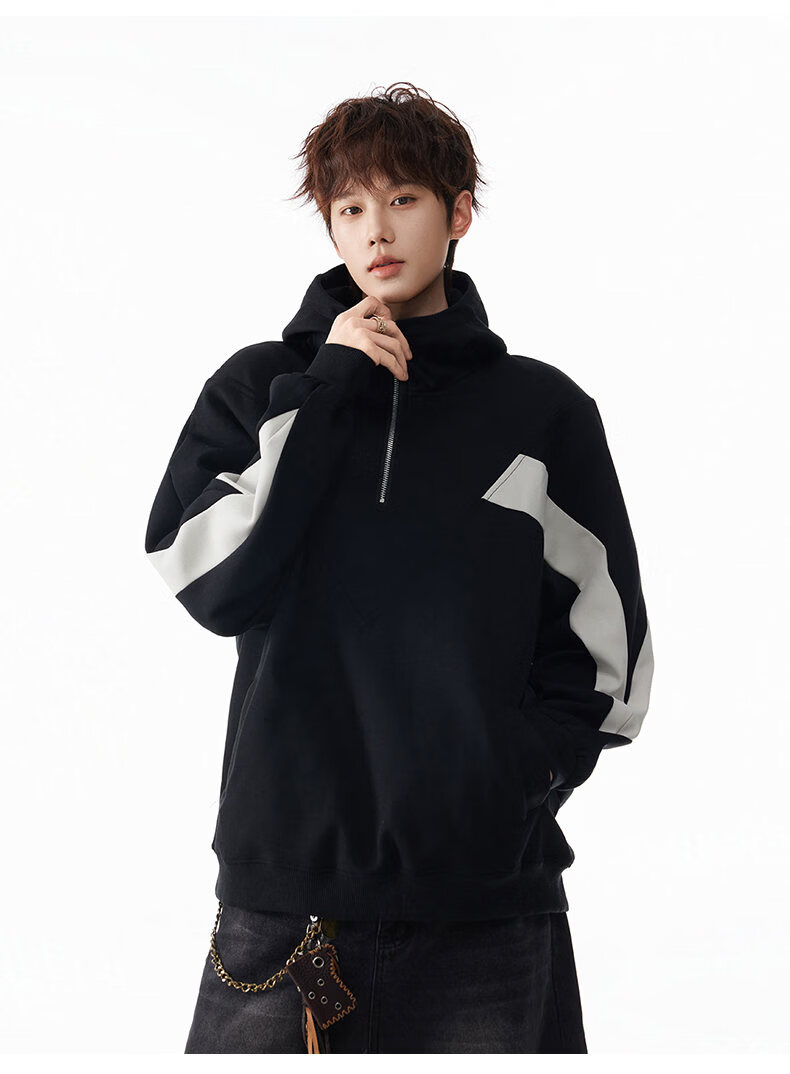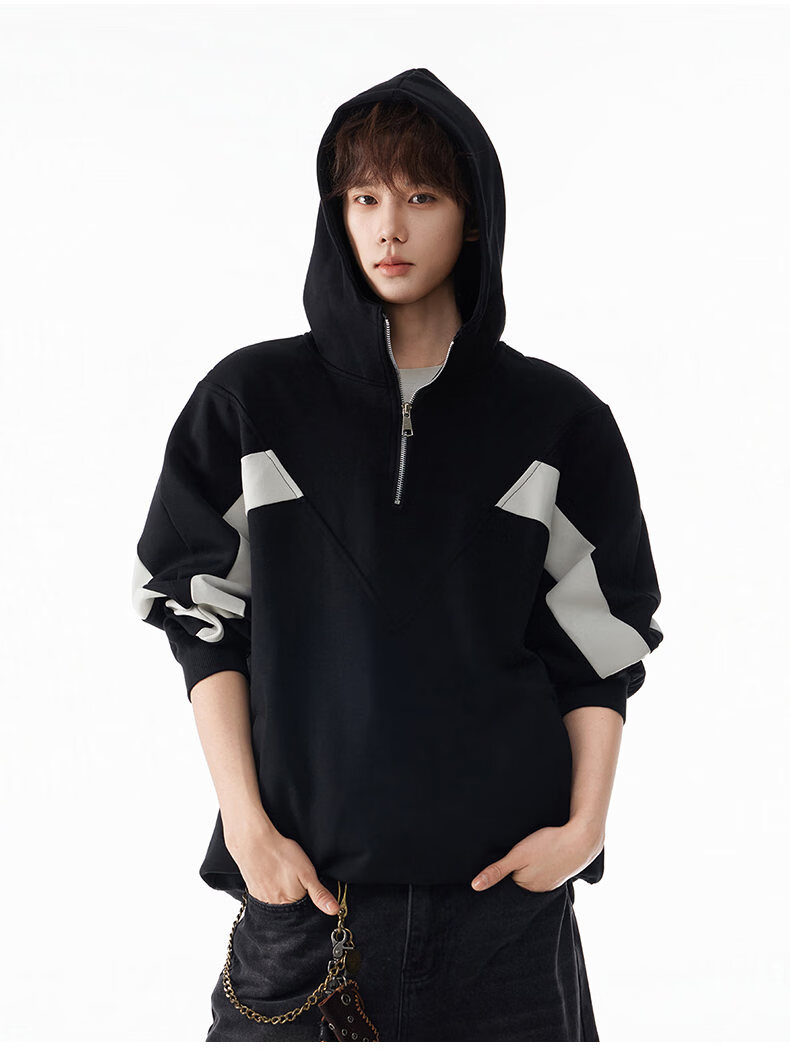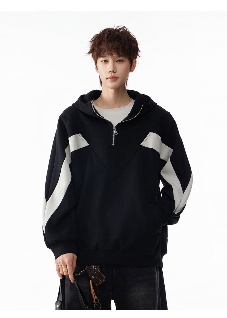 NEW OR MODE美式条纹撞色半拉链连帽卫衣男春季新款潮牌宽松休闲百搭帽衫外套 黑色【高品质】 M 【建议90-110斤】