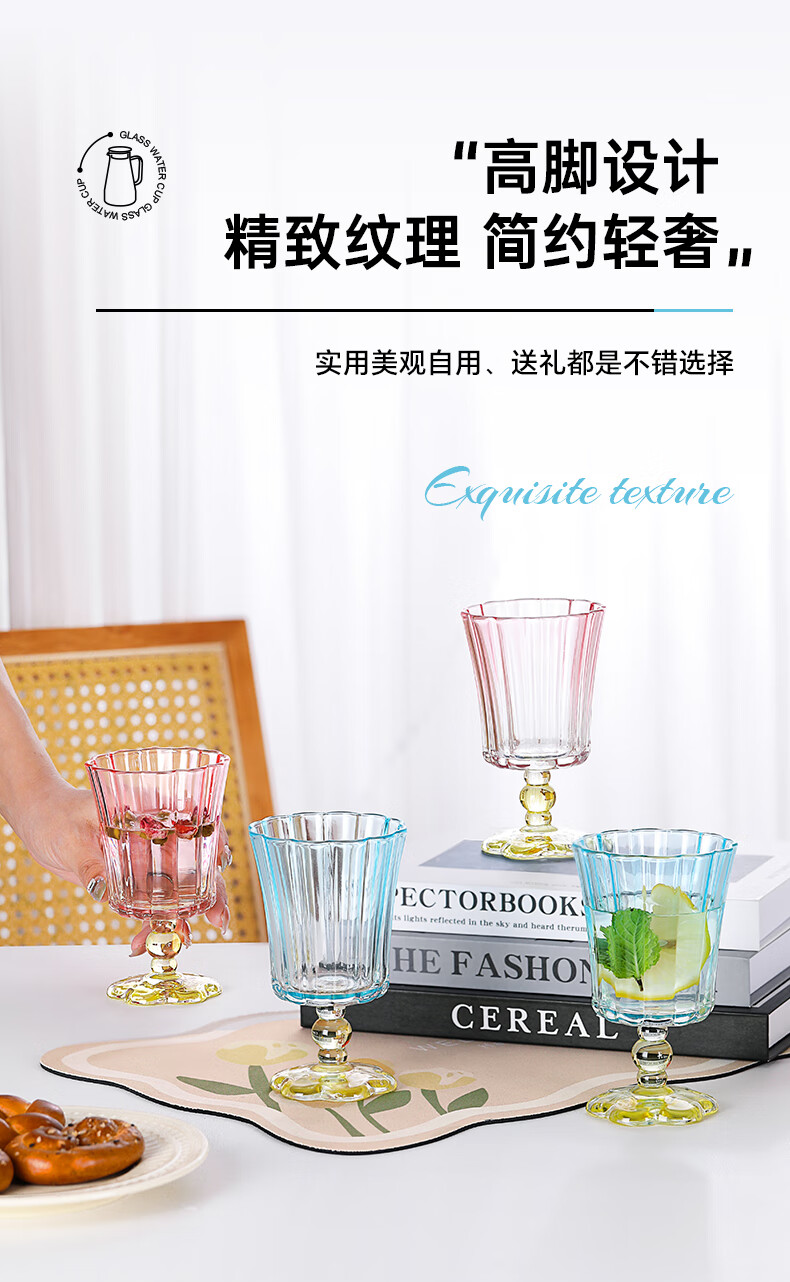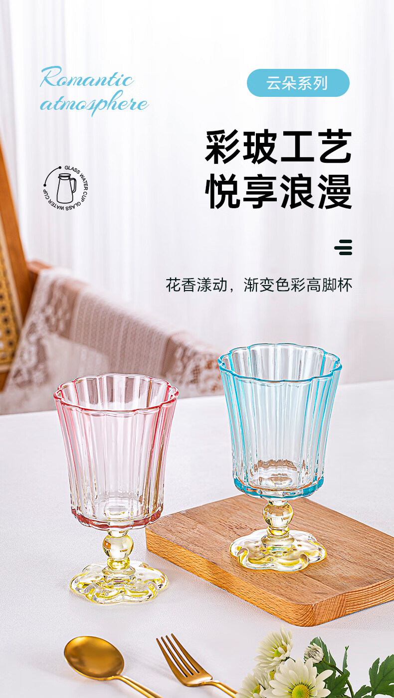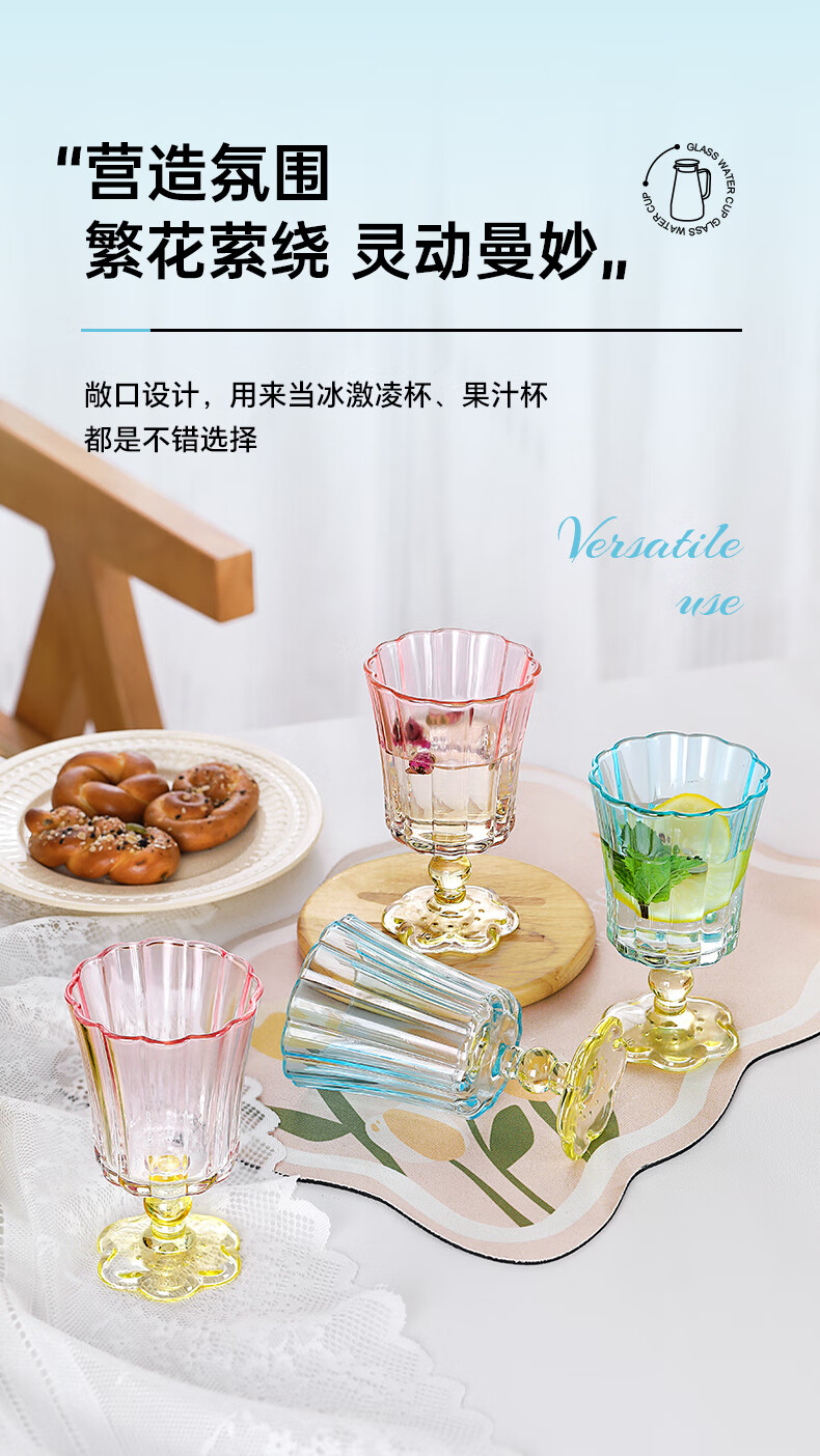 乐唯诗花开半朵高脚玻璃杯ins风鸡尾酒香槟杯冰淇淋果汁杯冷饮喝水杯子 花开半朵高脚杯【混色】245ml*2