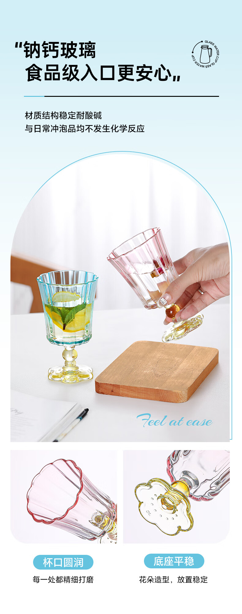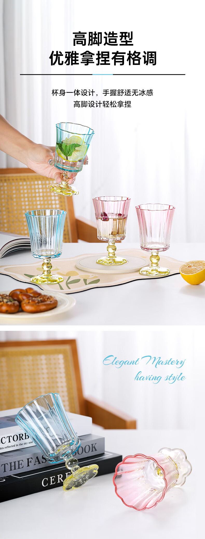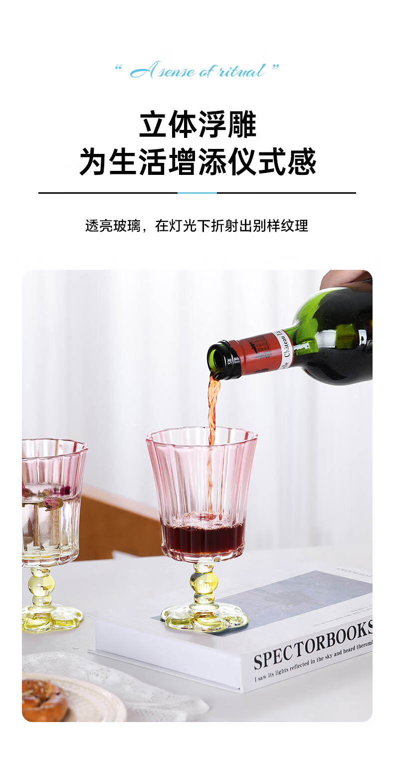 乐唯诗花开半朵高脚玻璃杯ins风鸡尾酒香槟杯冰淇淋果汁杯冷饮喝水杯子 花开半朵高脚杯【混色】245ml*2