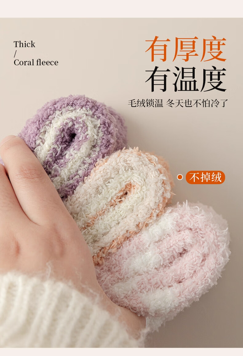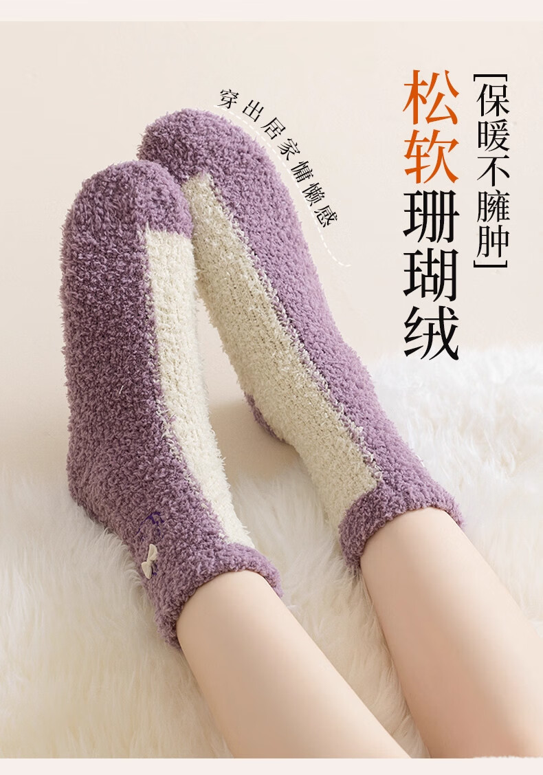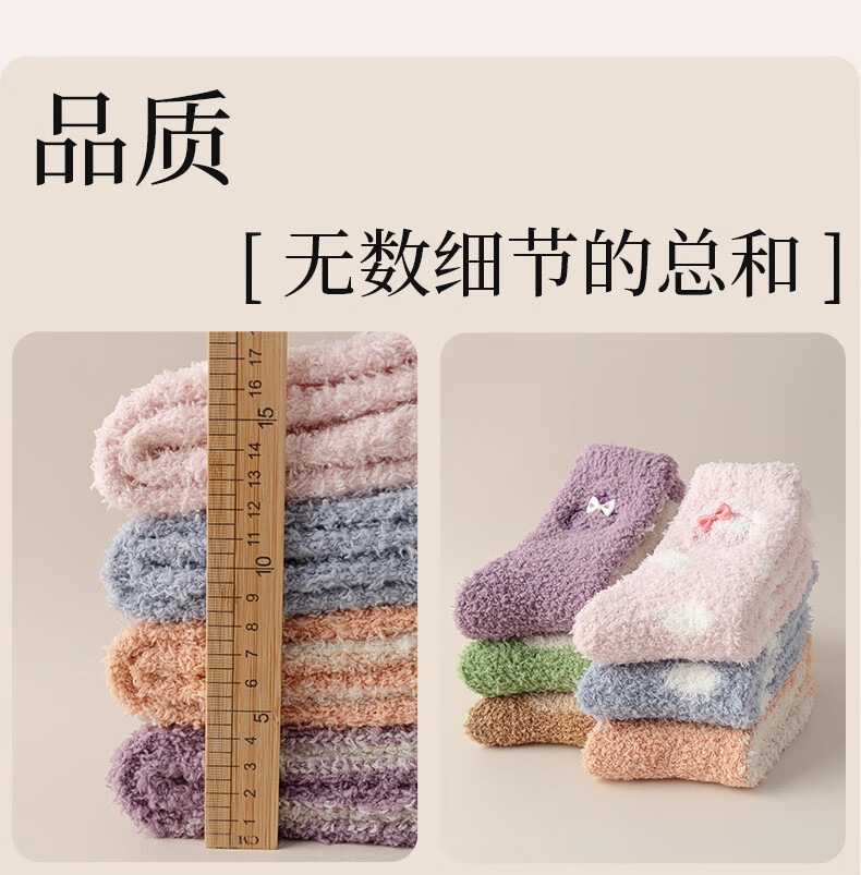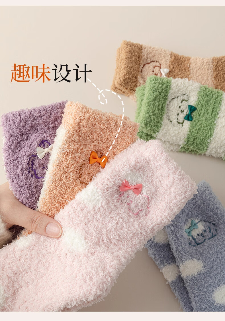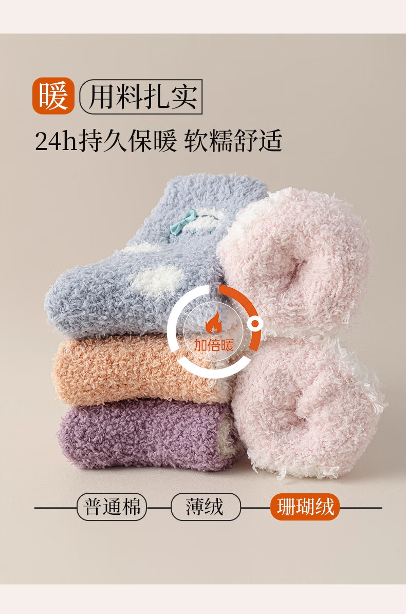 洛·恋珊瑚绒袜子女中筒秋冬季加厚加绒家居保暖舒适月子睡眠地板长筒袜 1粉1卡其1绿1红紫 4双 均码