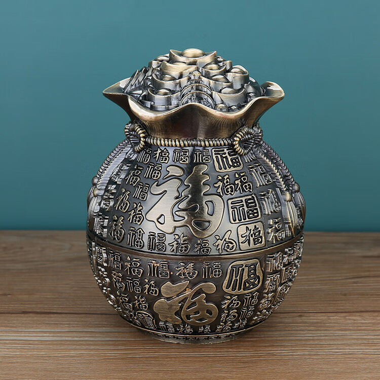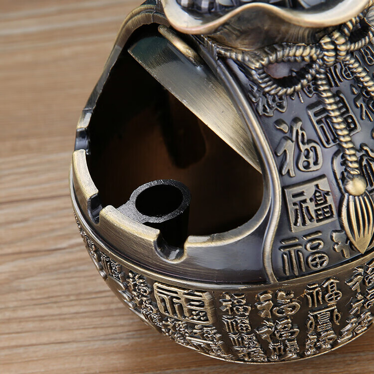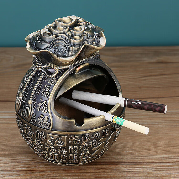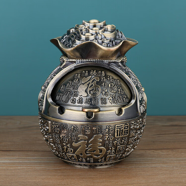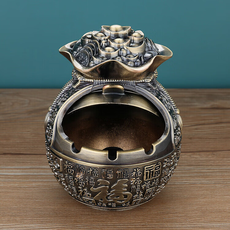 欧式烟灰缸家用客厅创意轻奢办公室卧室茶几ins防飞灰带盖摆件 红铜五福临门