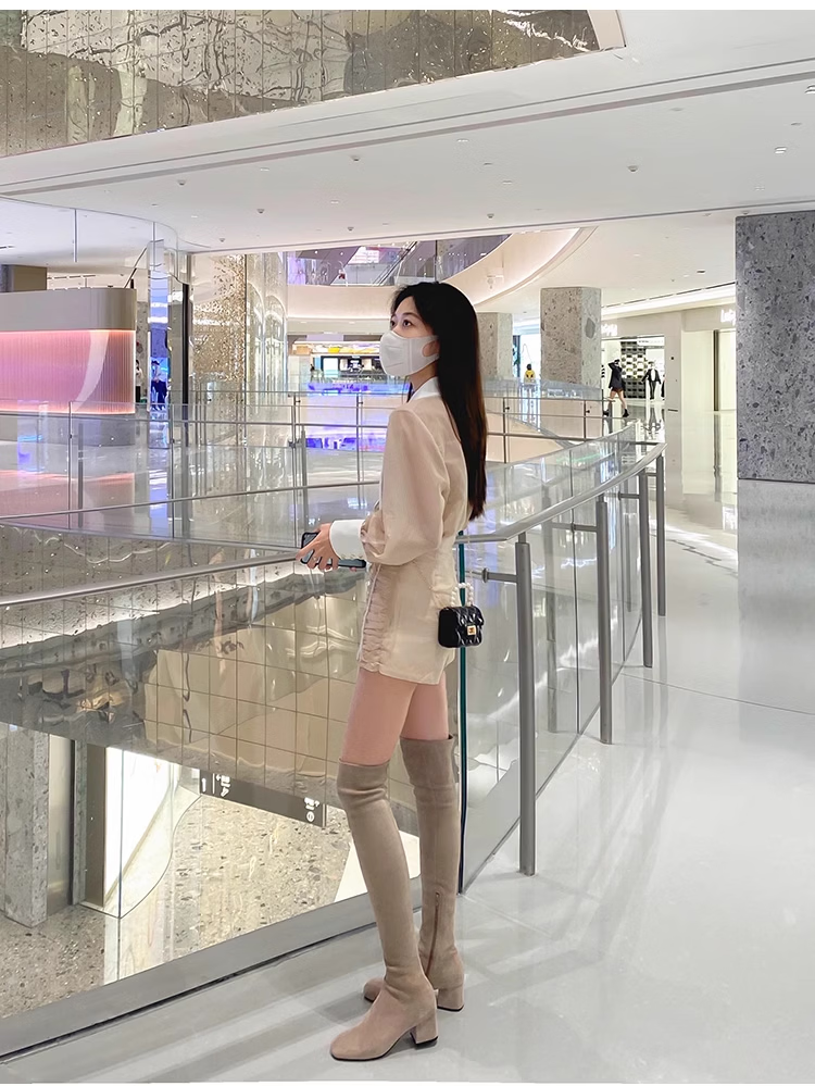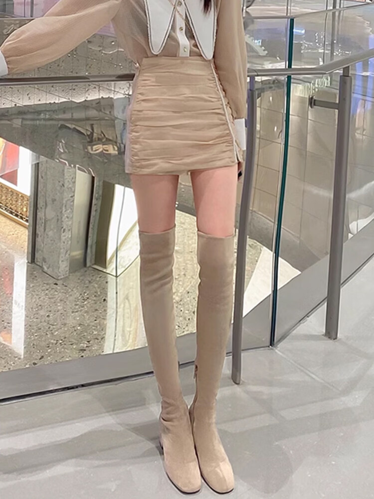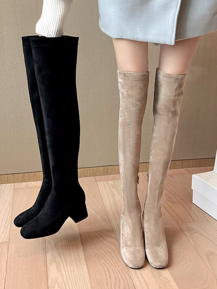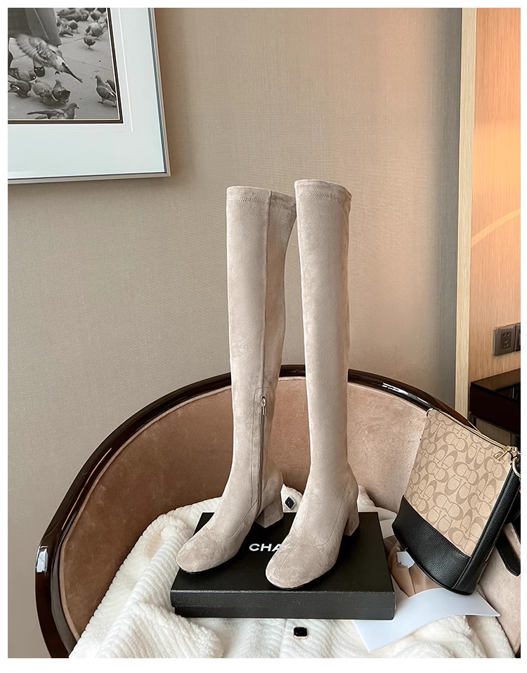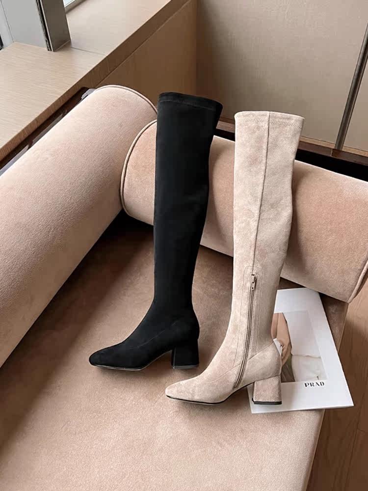 稻草人(MEXICAN)过膝靴长靴女2026秋冬季新款弹力高筒靴小个子增高粗跟瘦瘦高跟靴 杏色升级版【有拉链款】 35