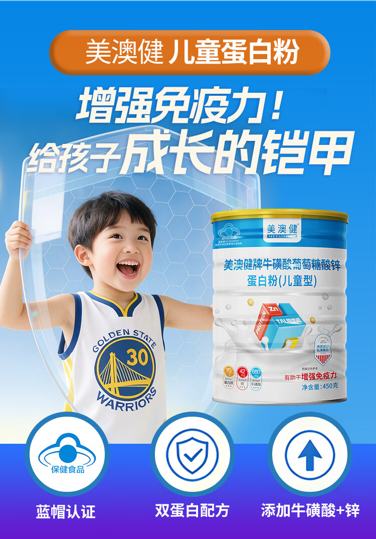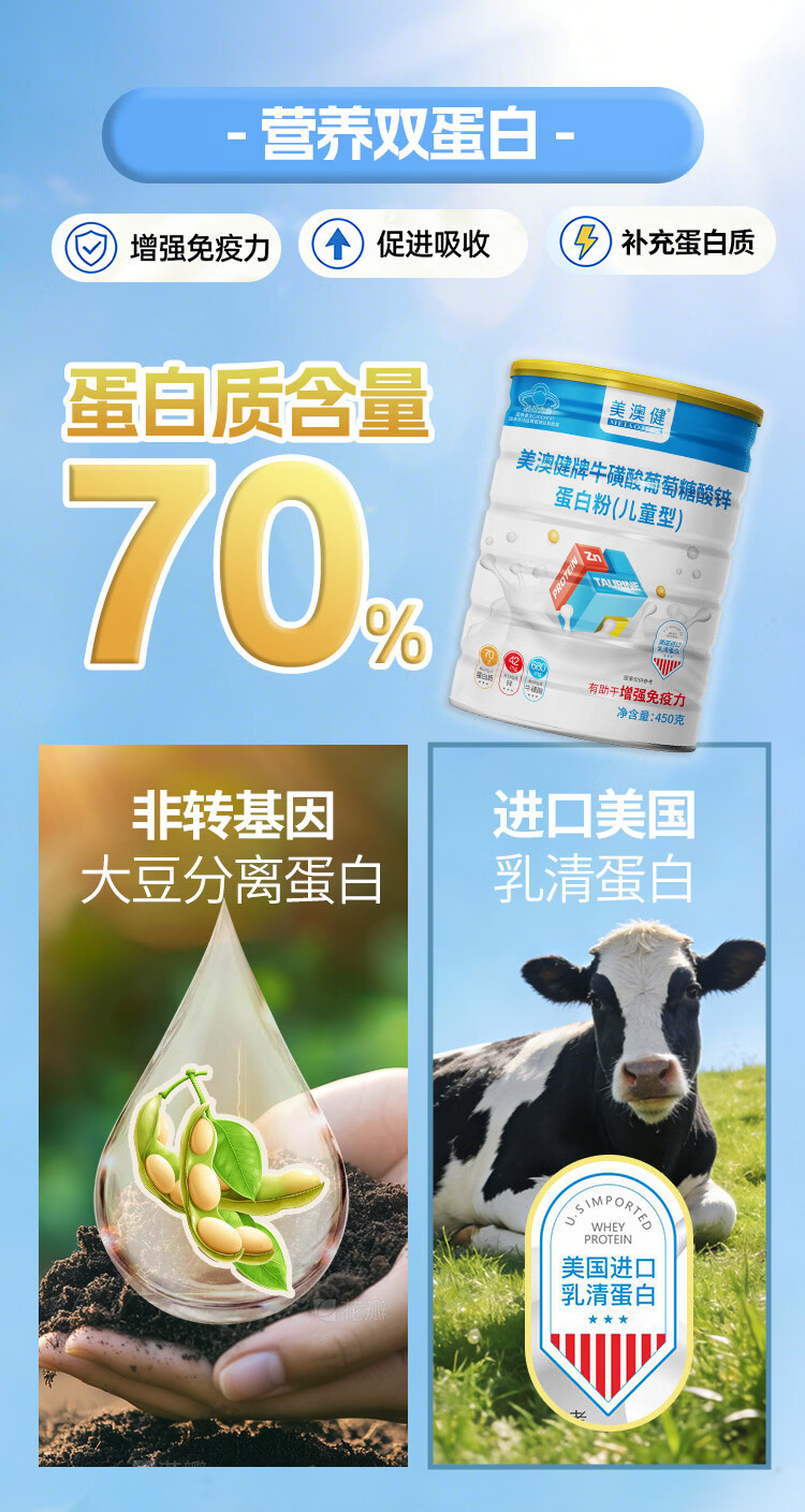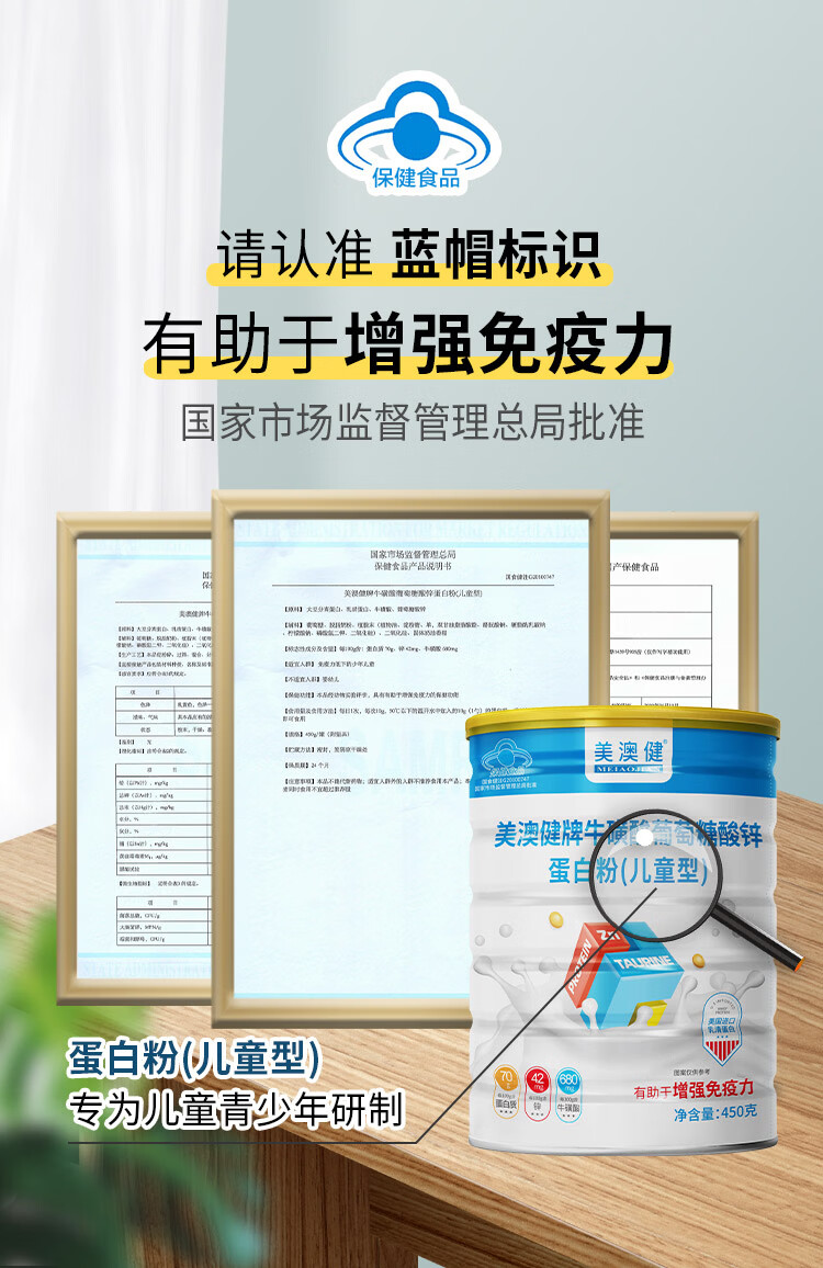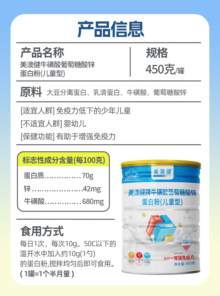 美澳健儿童蛋白粉学生青少年增强免疫力成长牛磺酸锌补乳清蛋白营养礼品 尝鲜装】增强免疫 450g*1罐 送维C+钙