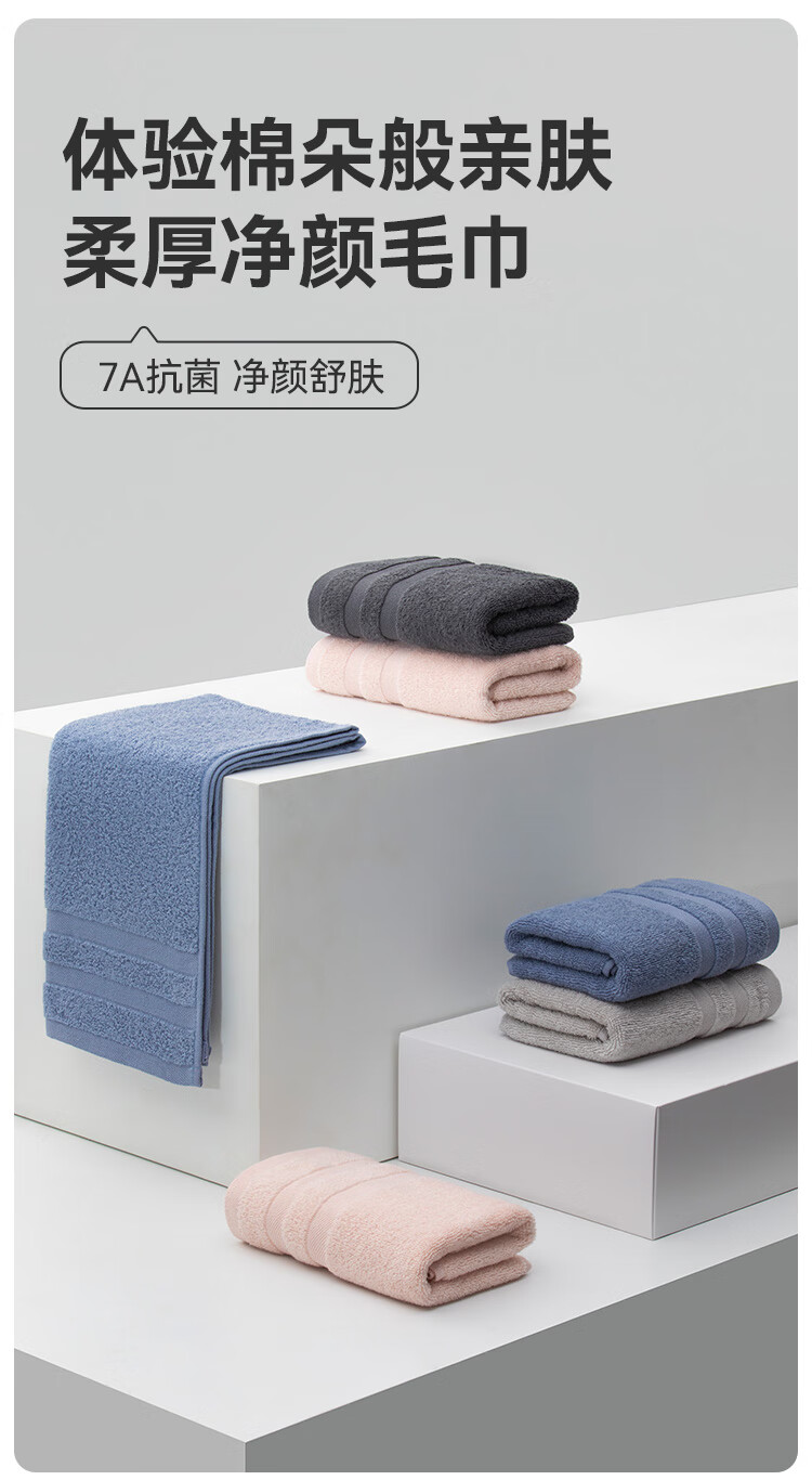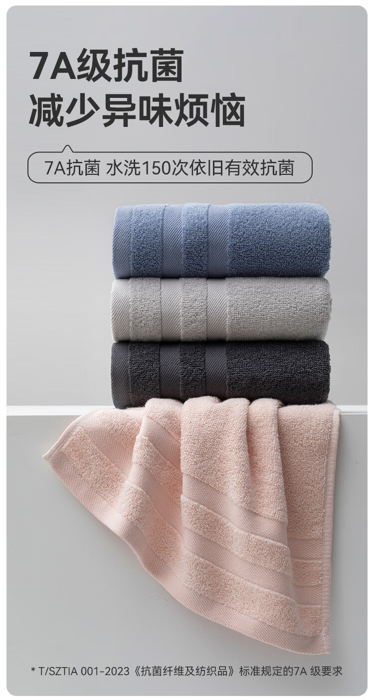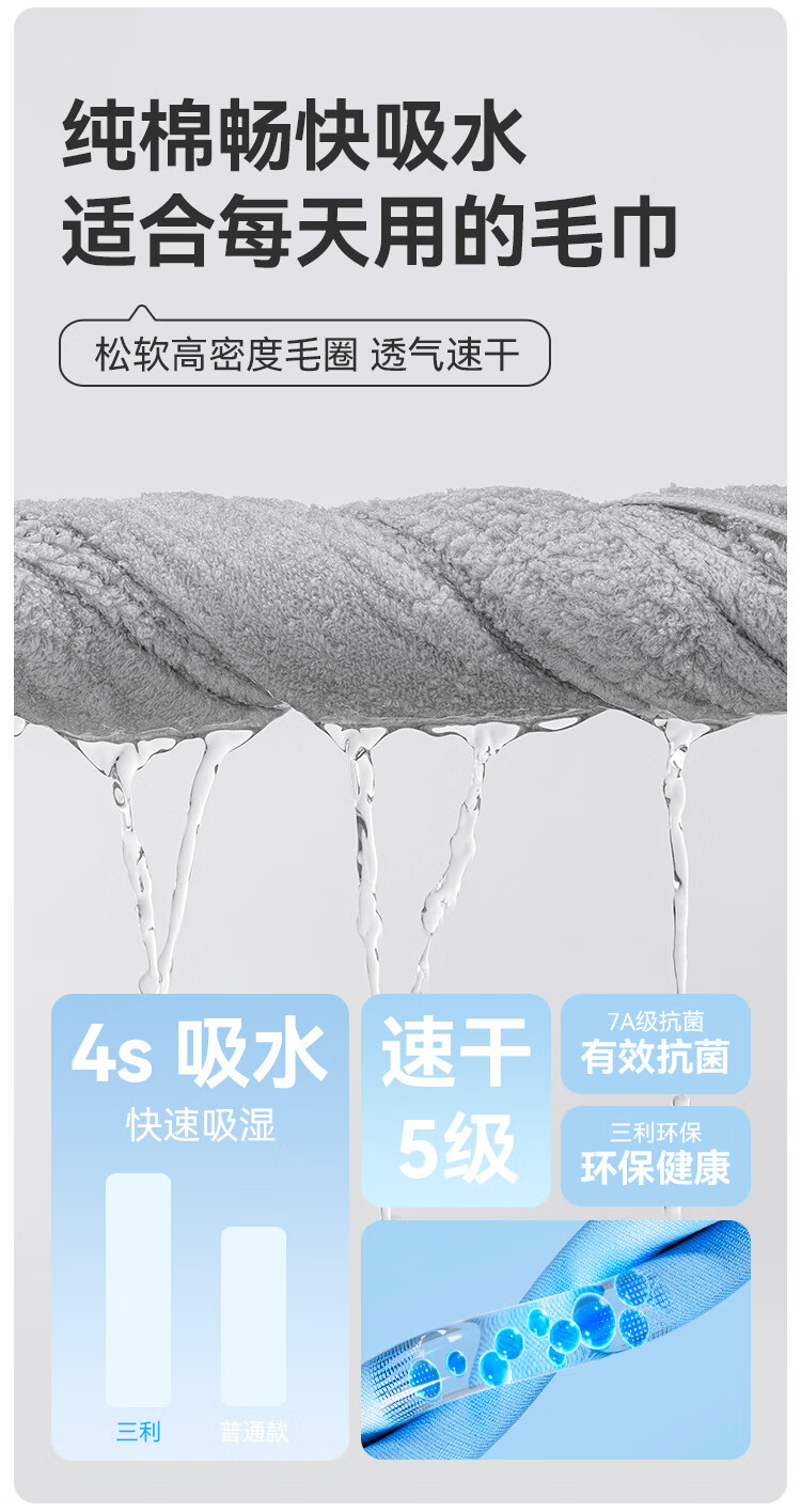 三利毛巾 7A纯棉抗菌毛巾加厚柔软顺滑吸水速干成人男女家用擦脸巾 深灰色+浅灰色 2条