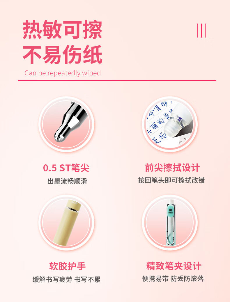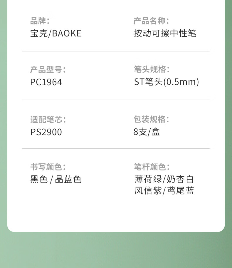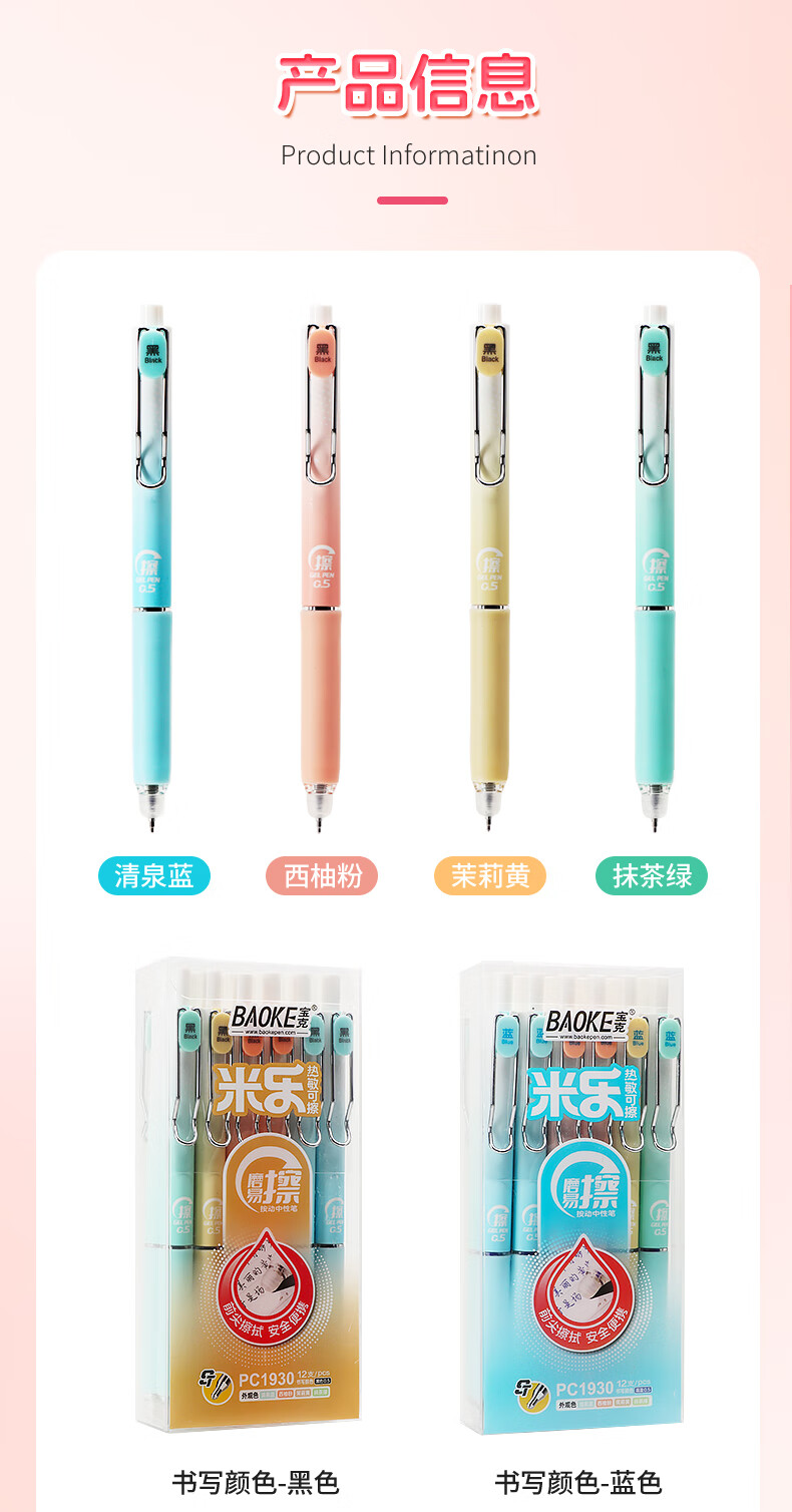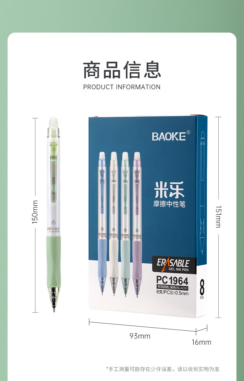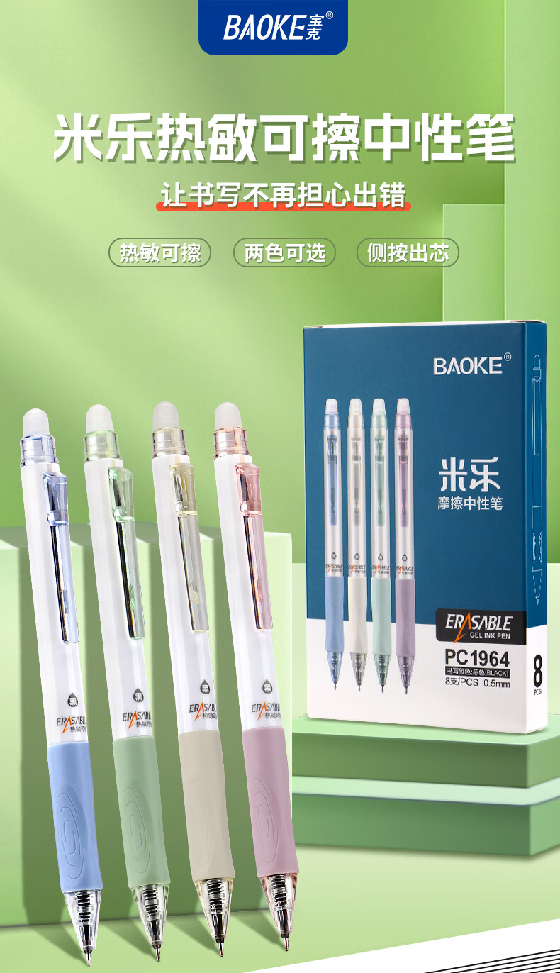 宝克(BAOKE)可擦按动中性笔0.5mm小学生专用三年级黑色水笔ST笔头热敏可擦笔可替换笔芯文具 黑色【可擦笔】PC1964 8支/盒可擦笔【囤货批发价】