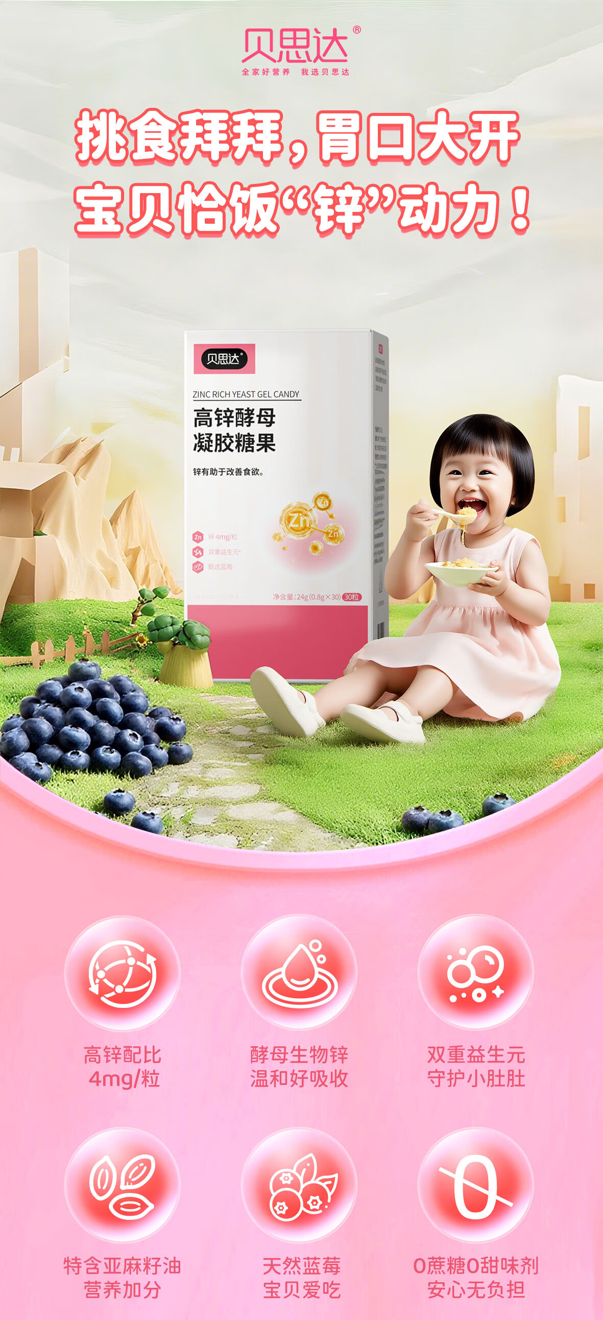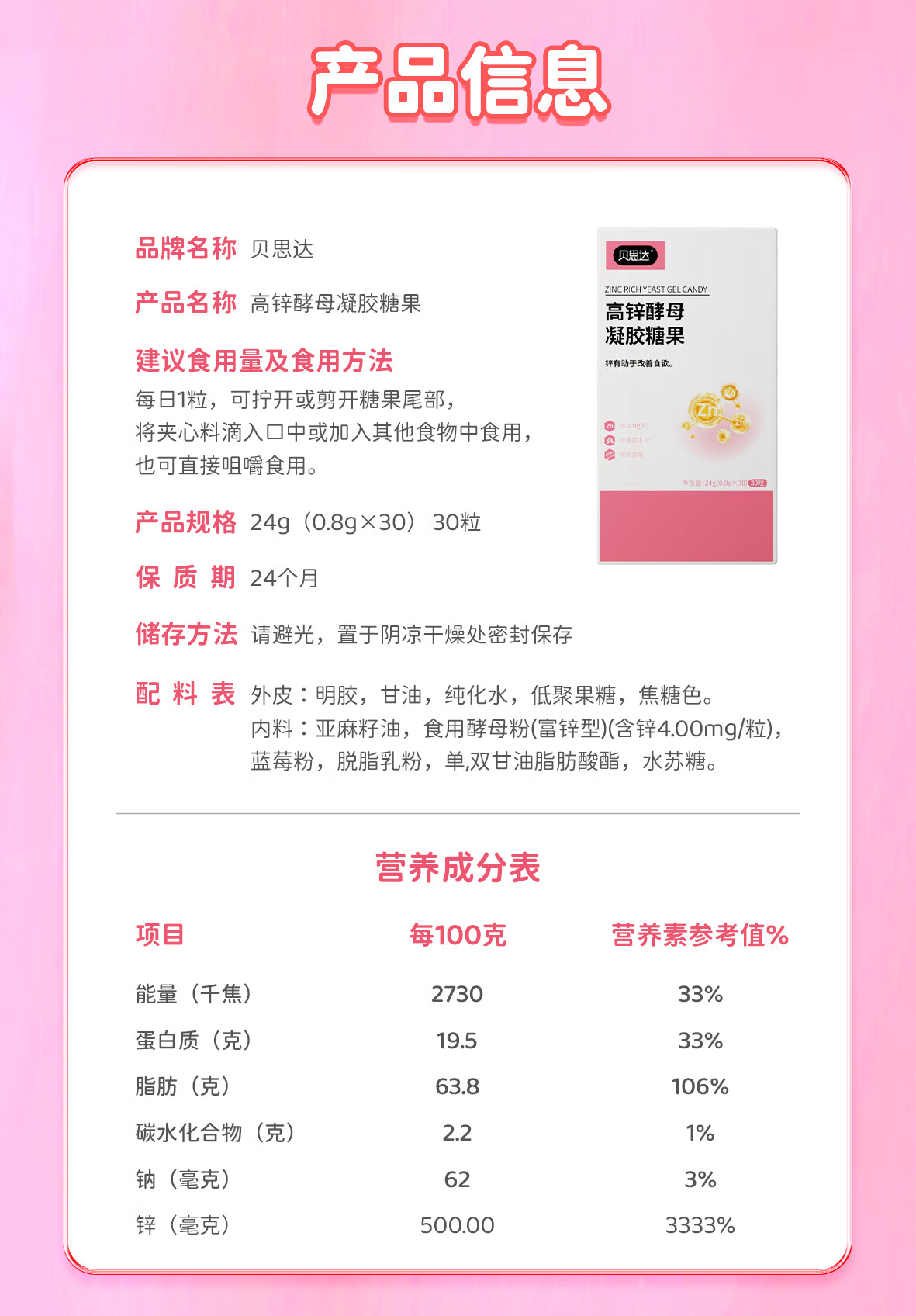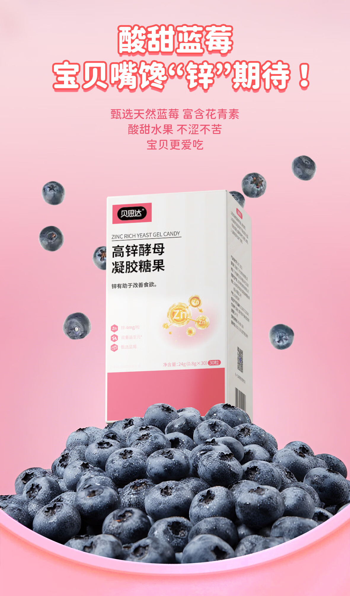 贝思达高锌酵母凝胶糖果软糖补充剂儿童成长补锌营养品 30粒*1盒