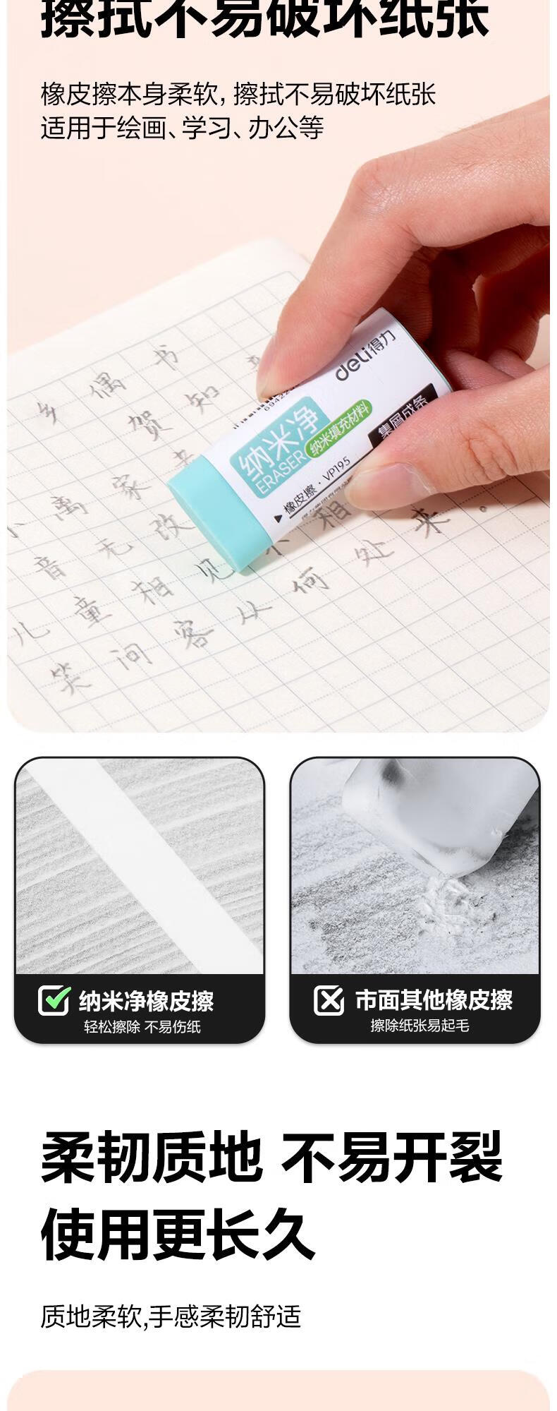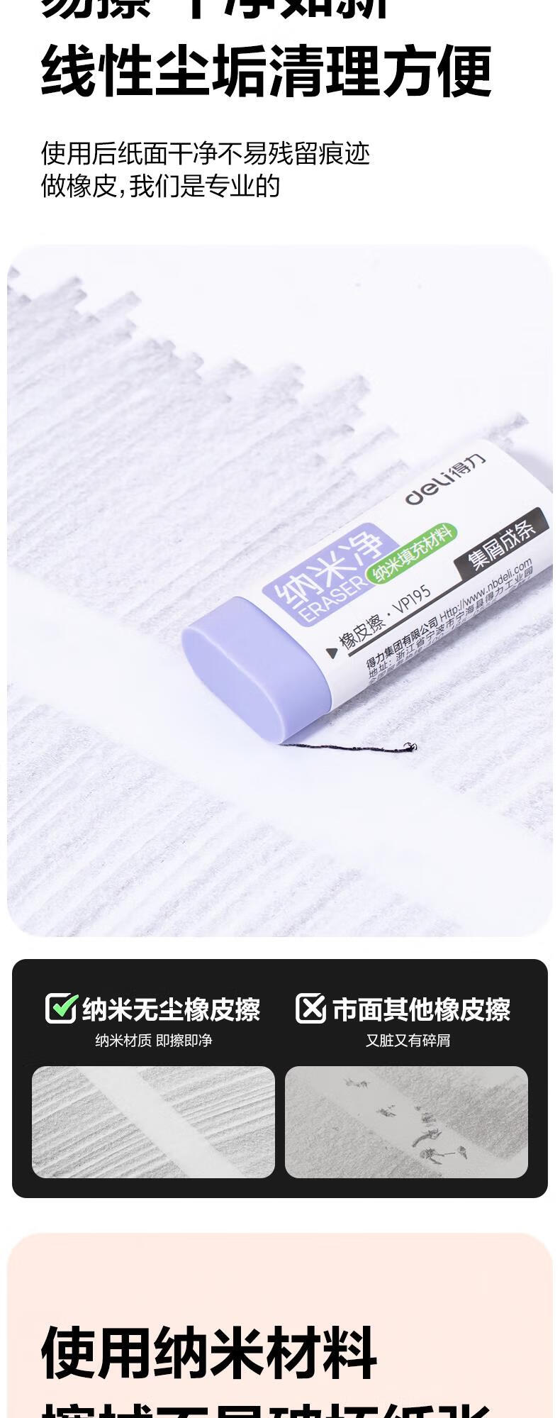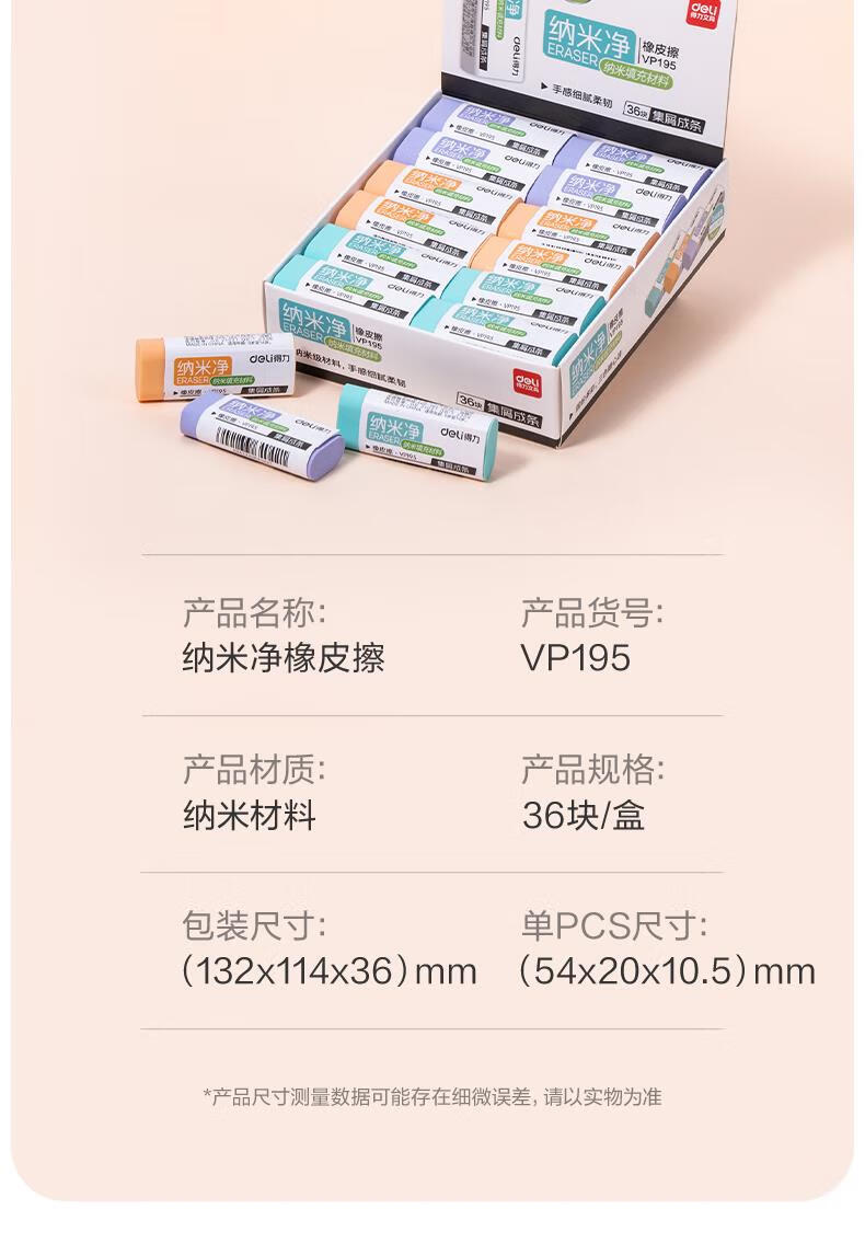 得力(deli)纳米净橡皮擦 易擦少屑 不易留痕学生橡皮擦 单块装 VP195 大号 颜色随机