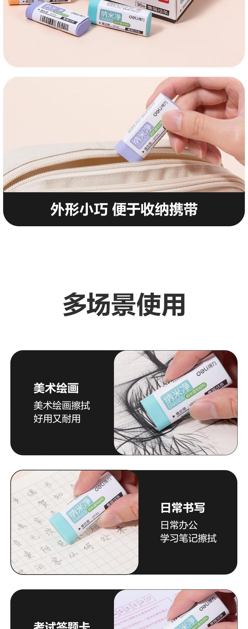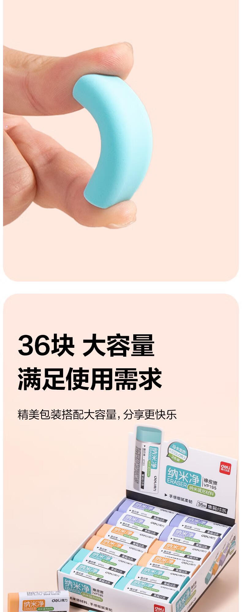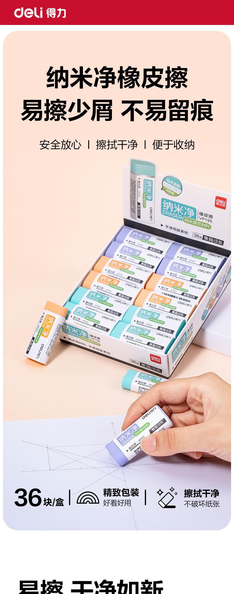 得力(deli)纳米净橡皮擦 易擦少屑 不易留痕学生橡皮擦 单块装 VP195 大号 颜色随机