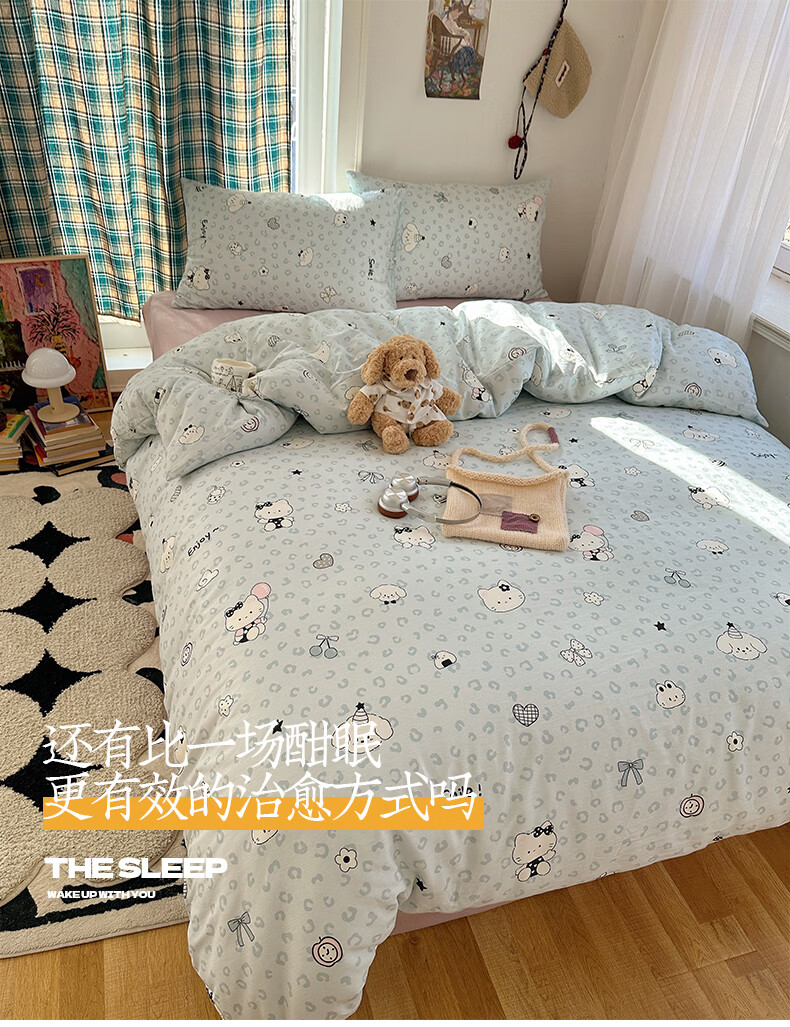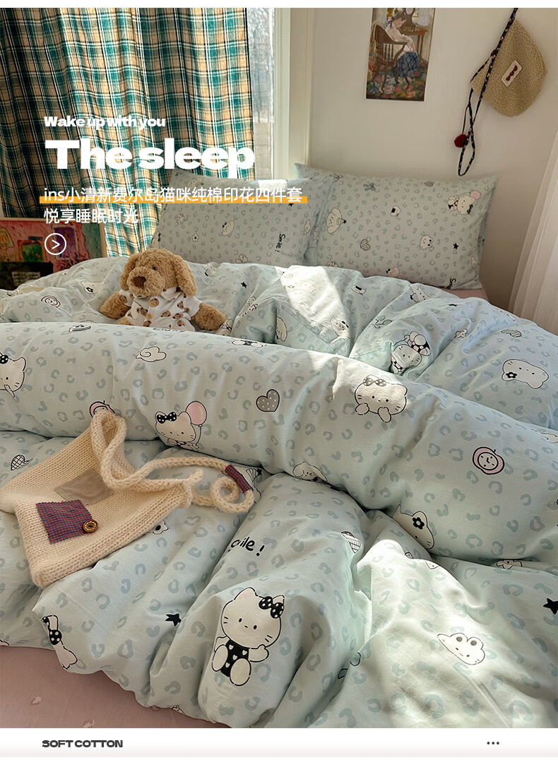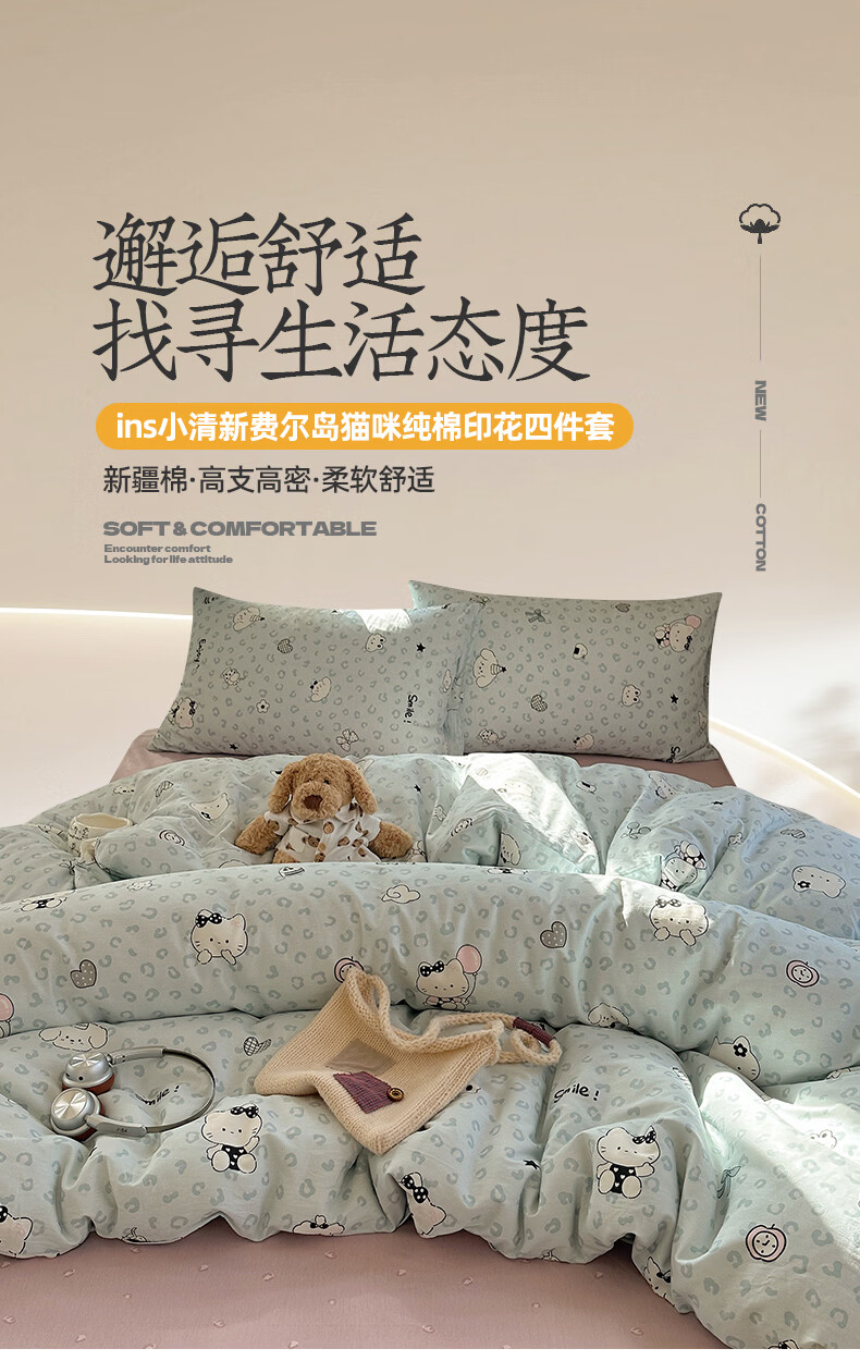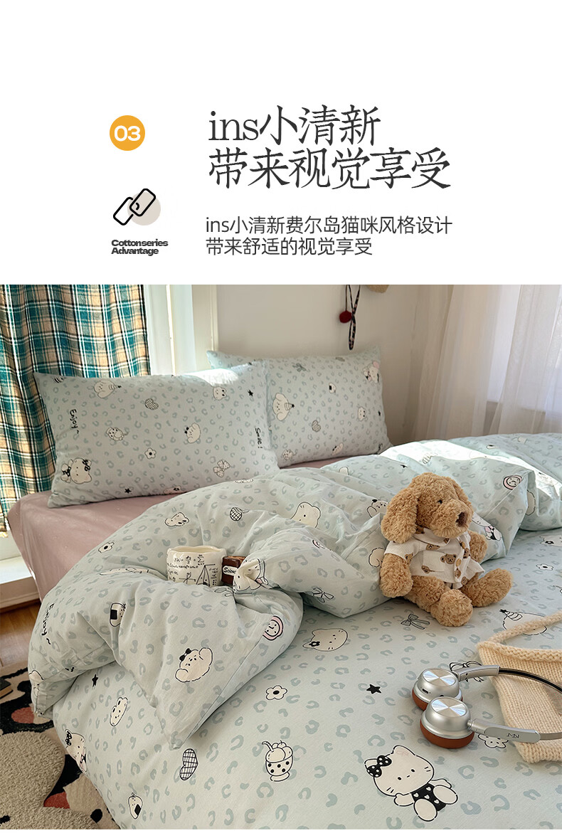 猫人(MiiOW)纯棉床上四件套全棉卡通床品床单被套罩三件套学生宿舍四季通用 蓝豹纹猫【全棉亲肤柔软】 0.9/1.2 床单款 三件套-150x200cm被套