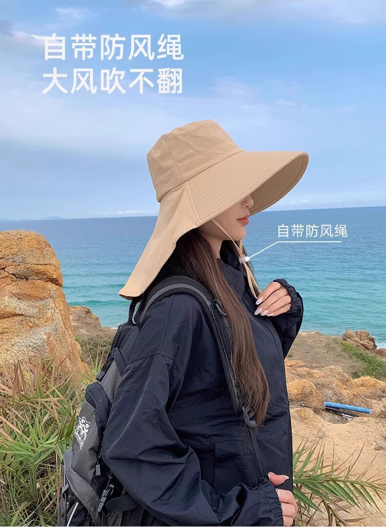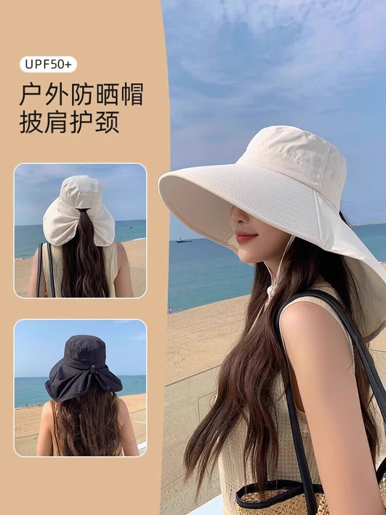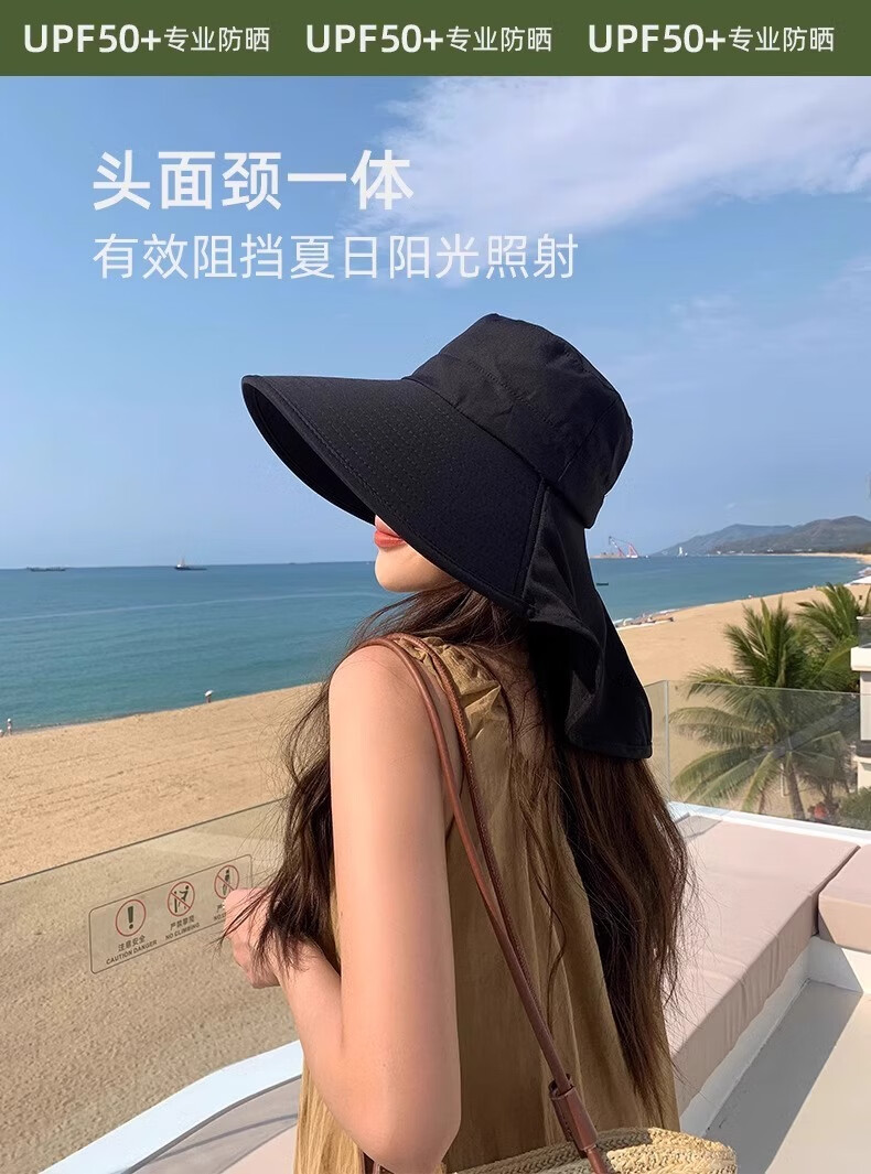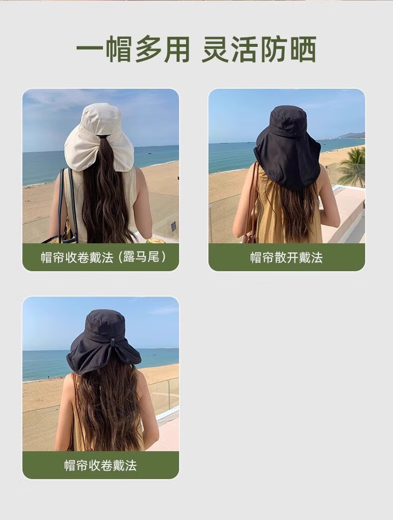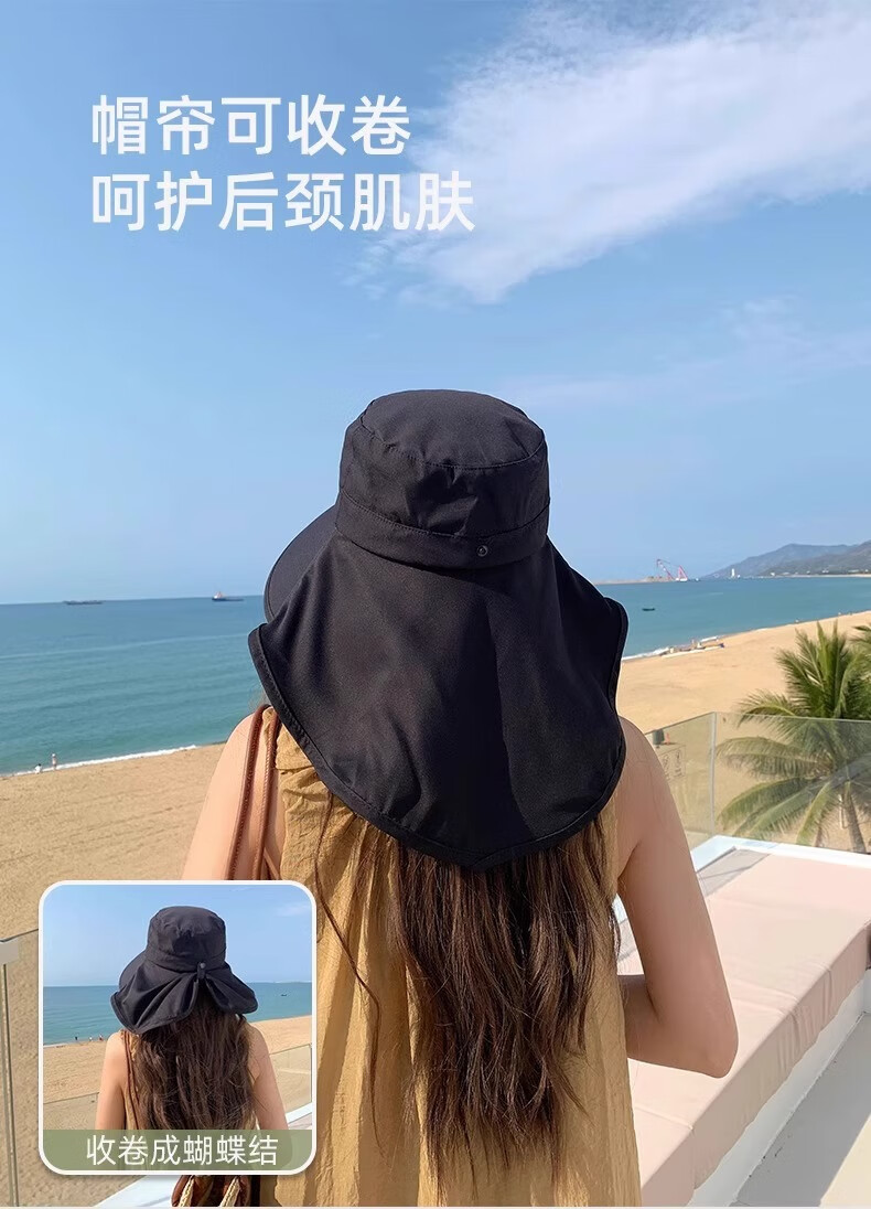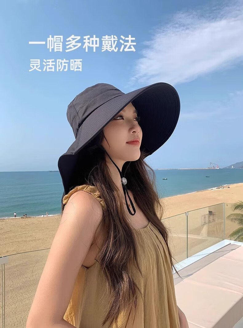 简时行防晒帽子女夏季遮脸披肩大檐太阳帽骑行护颈沙滩百搭扎马尾遮阳帽 深灰(可拆卸)