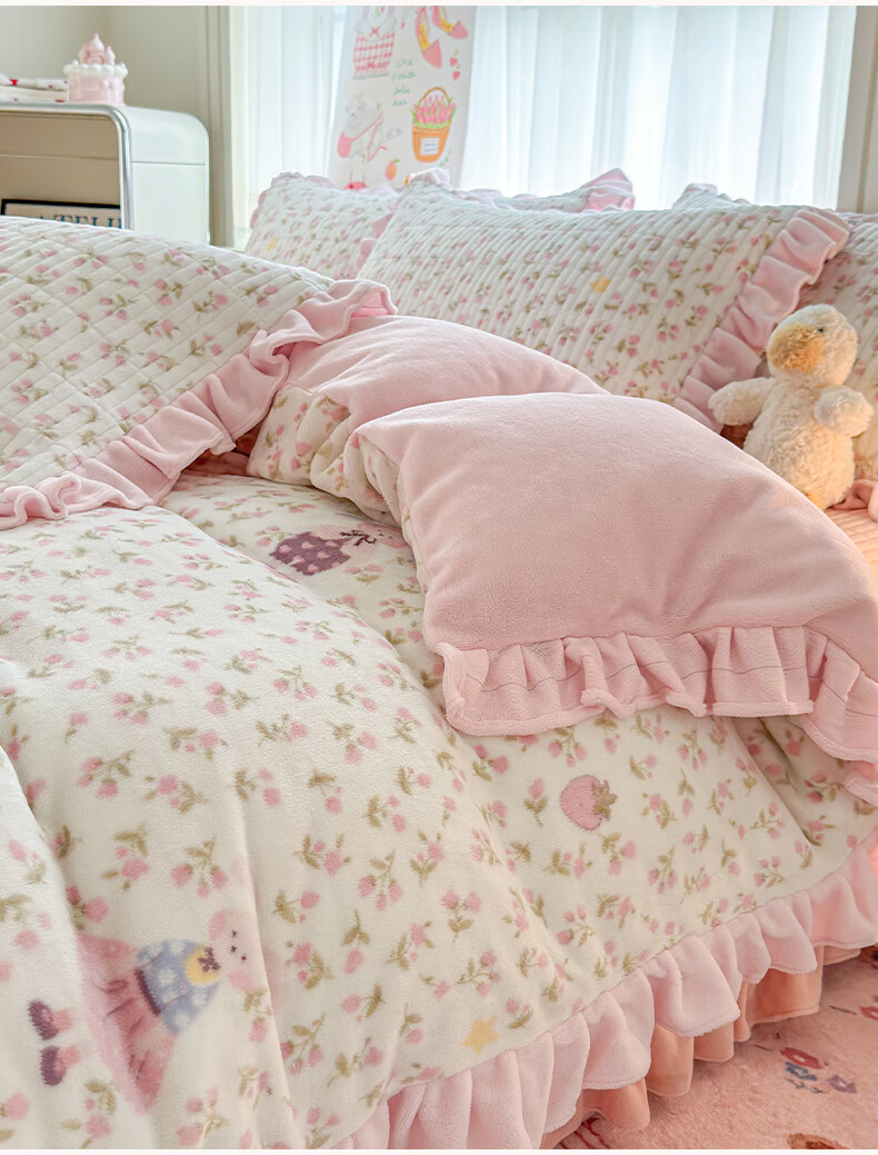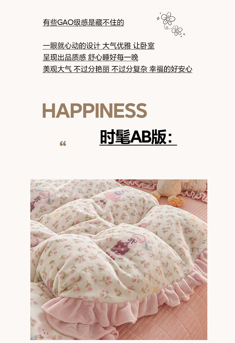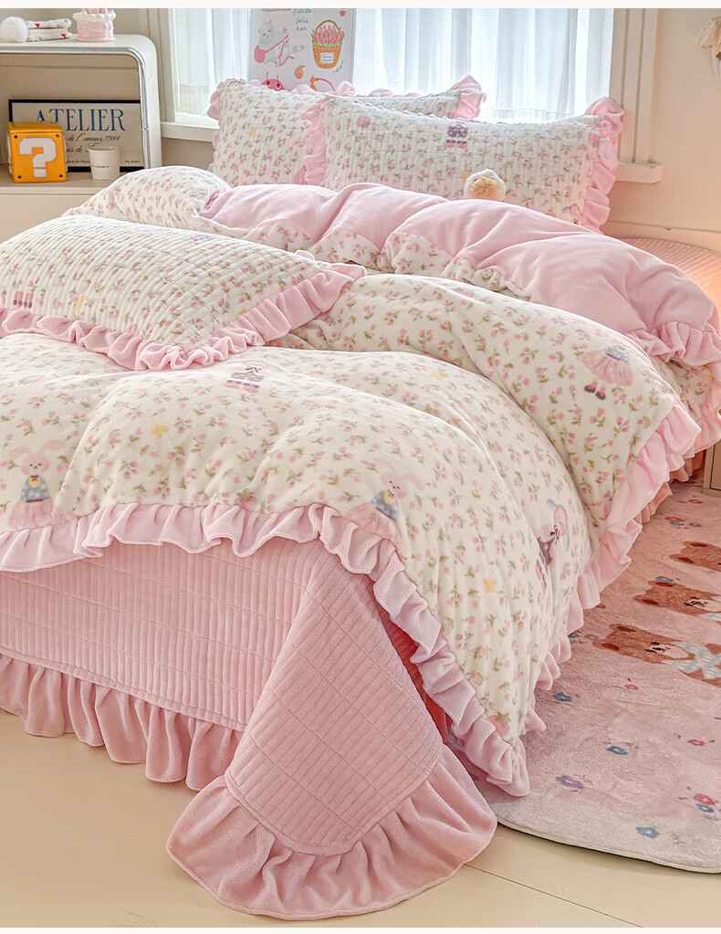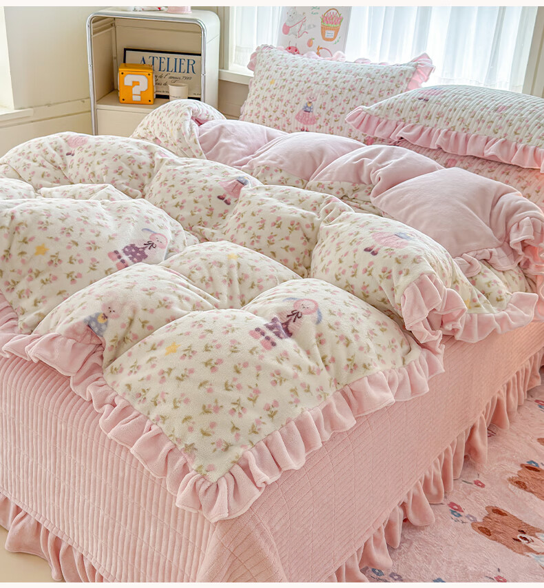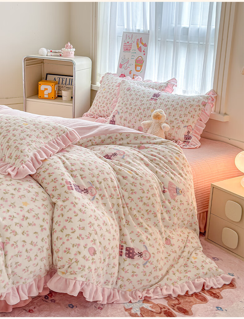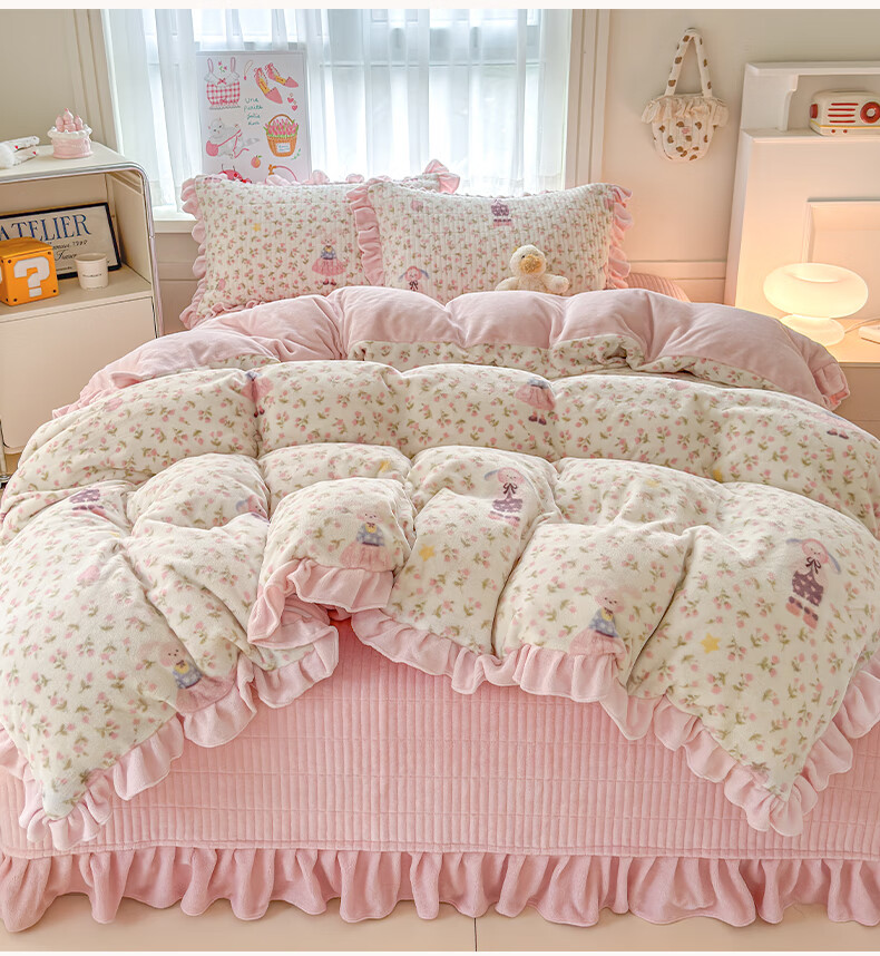 猫人(MiiOW)冬季加厚卡通牛奶绒床上四件套珊瑚绒家用毛绒床单被套床盖款床品 莓莓兔粉【厚实保暖】 0.9m 床盖款 三件套-150x200cm被套