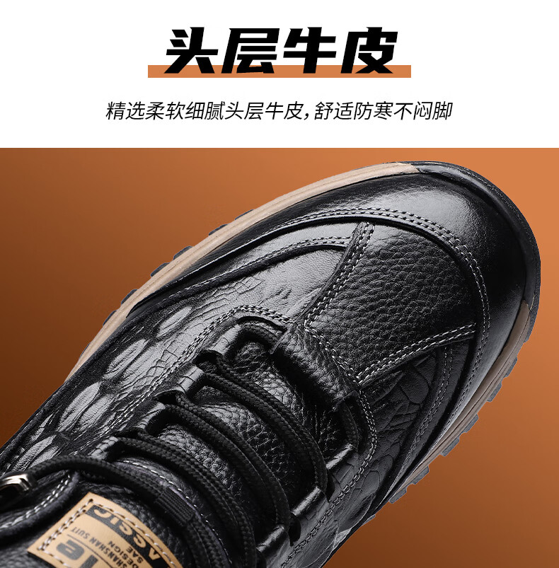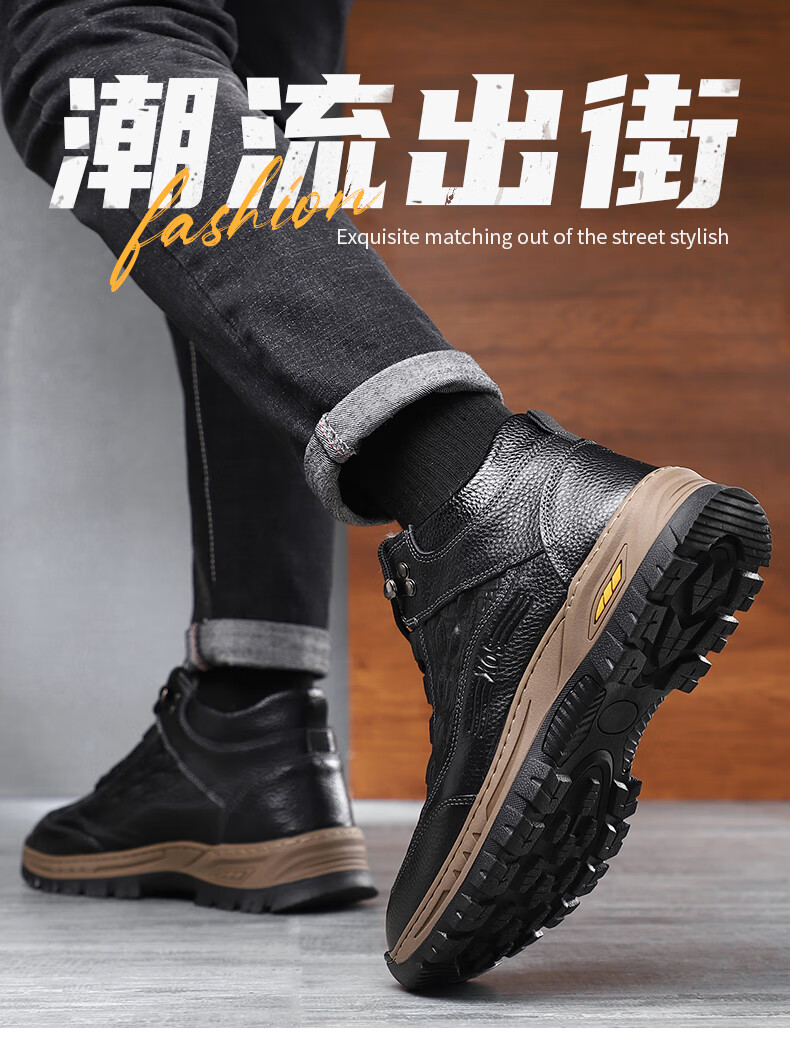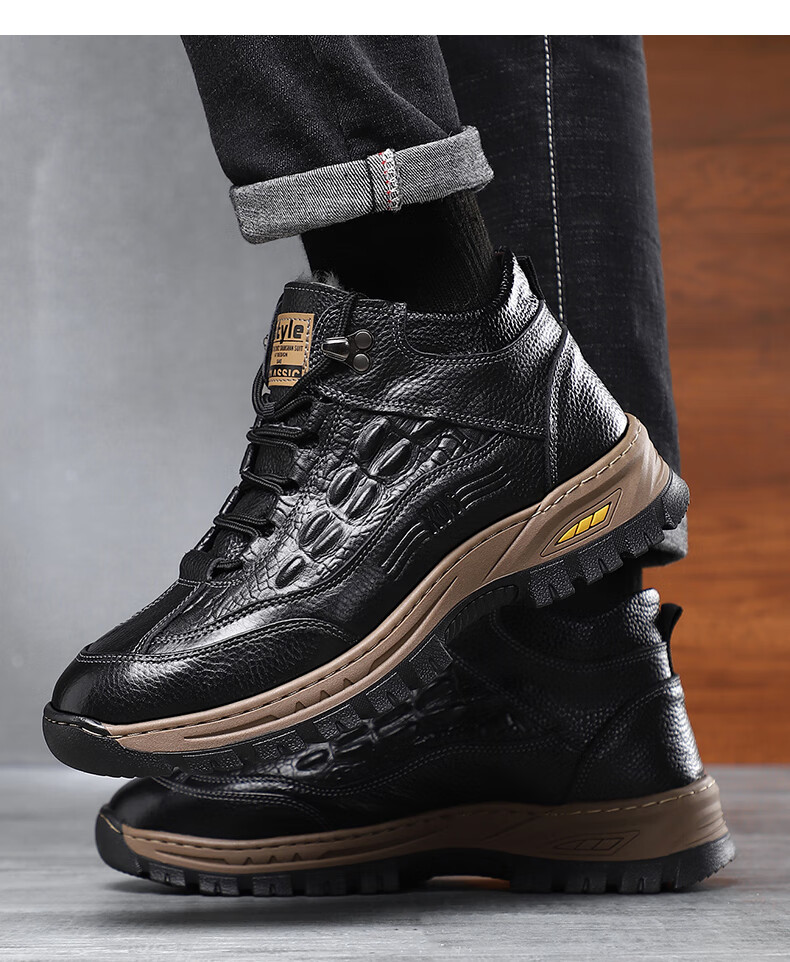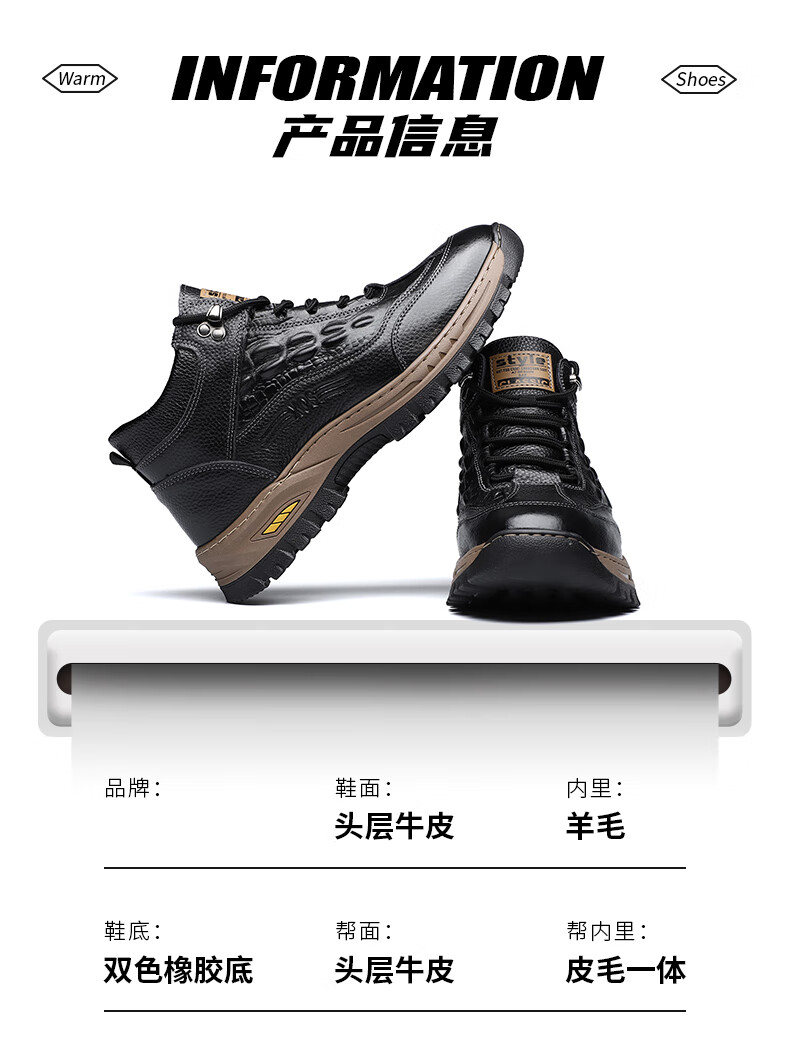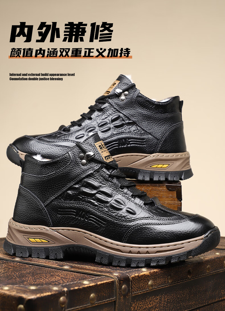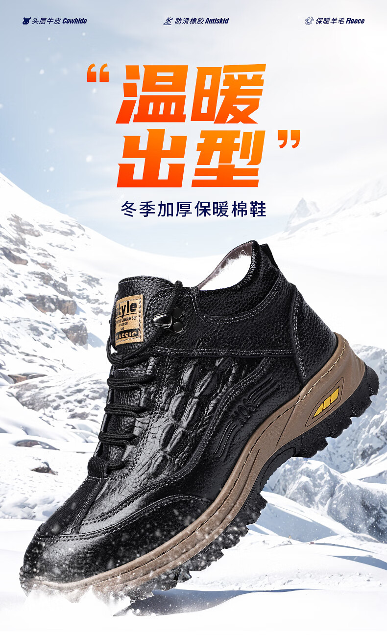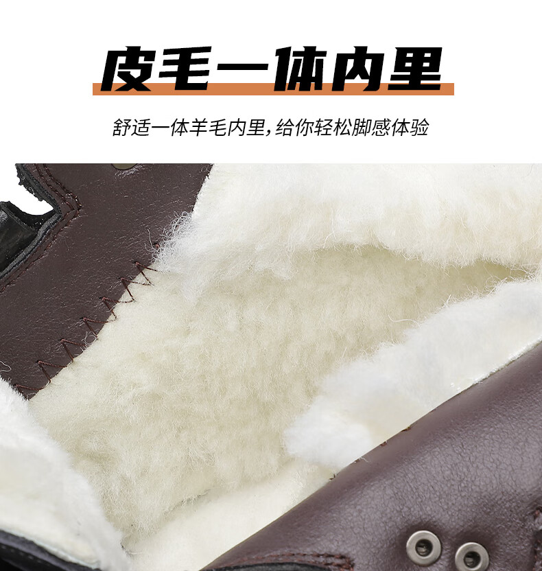 稻草人(MEXICAN)头层牛皮羊毛雪地棉鞋冬鞋男鞋加绒高帮皮鞋冬季加厚保暖厚底中年 黑色 44