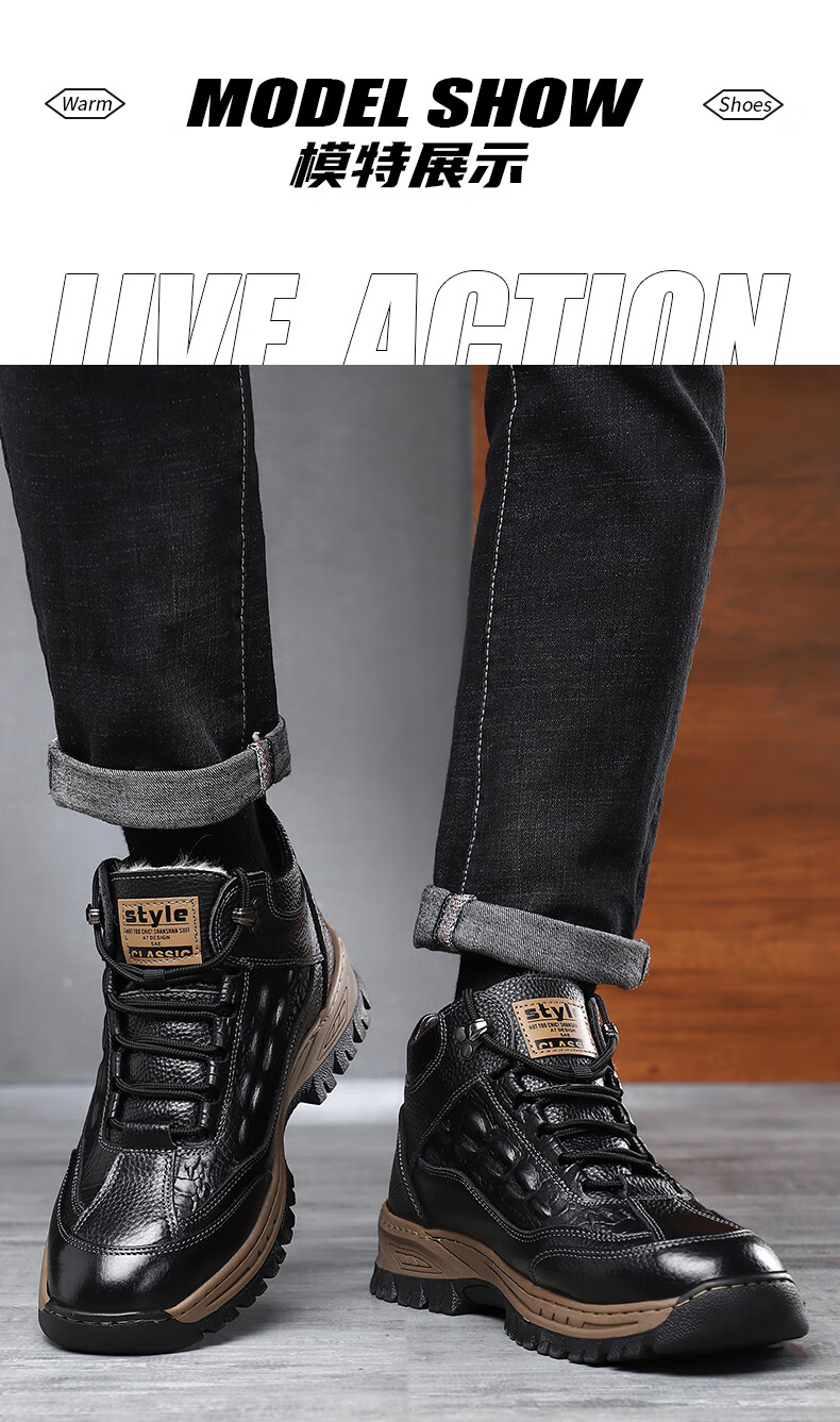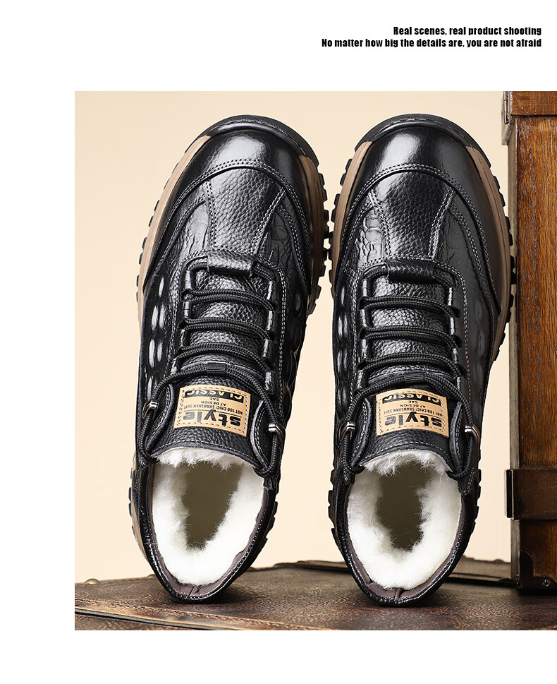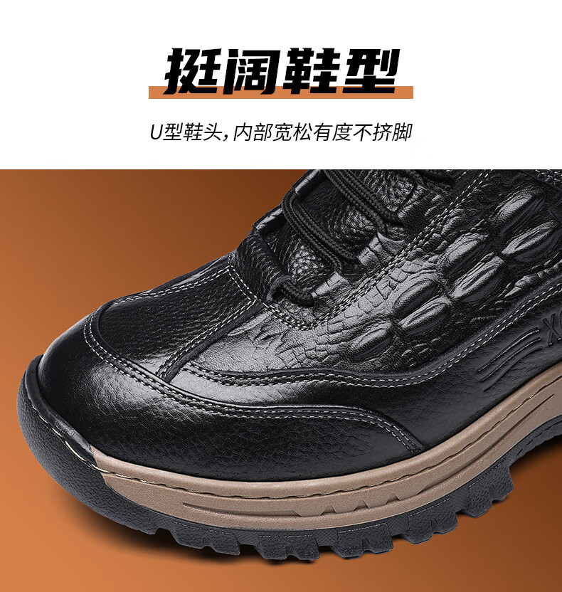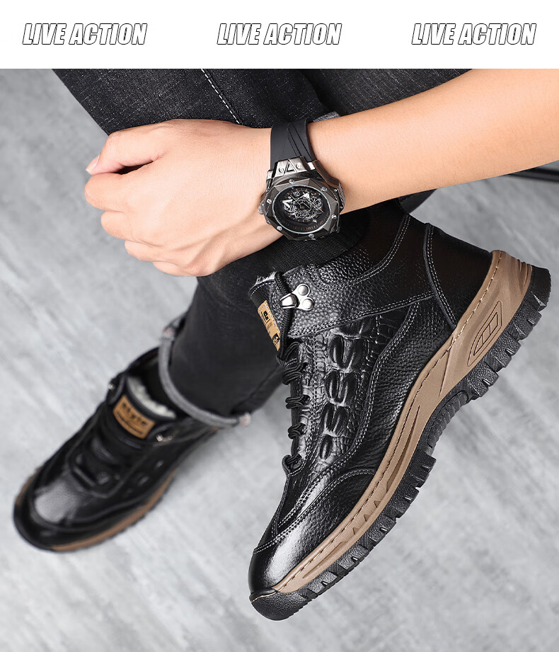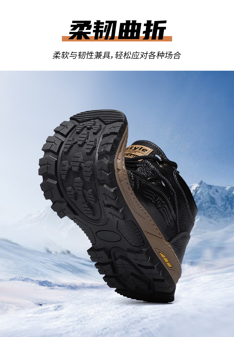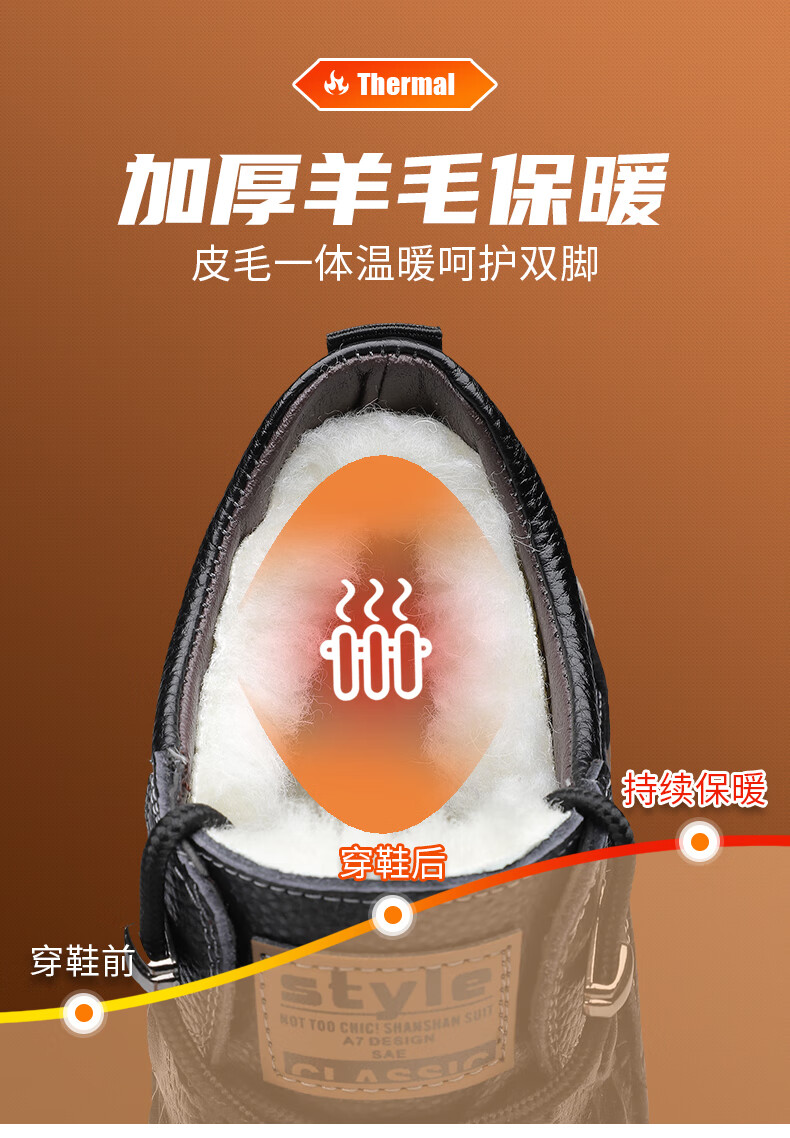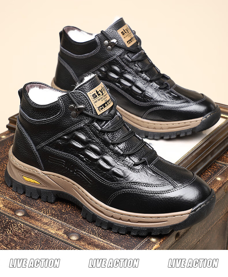 稻草人(MEXICAN)头层牛皮羊毛雪地棉鞋冬鞋男鞋加绒高帮皮鞋冬季加厚保暖厚底中年 黑色 44
