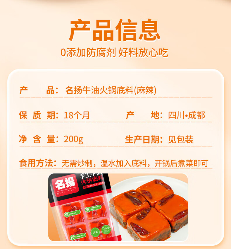 名揚名扬小块装火锅底料牛油麻辣 手工全型冒菜麻辣烫 香锅调料调味 牛油麻辣238g+香油70ml*2罐
