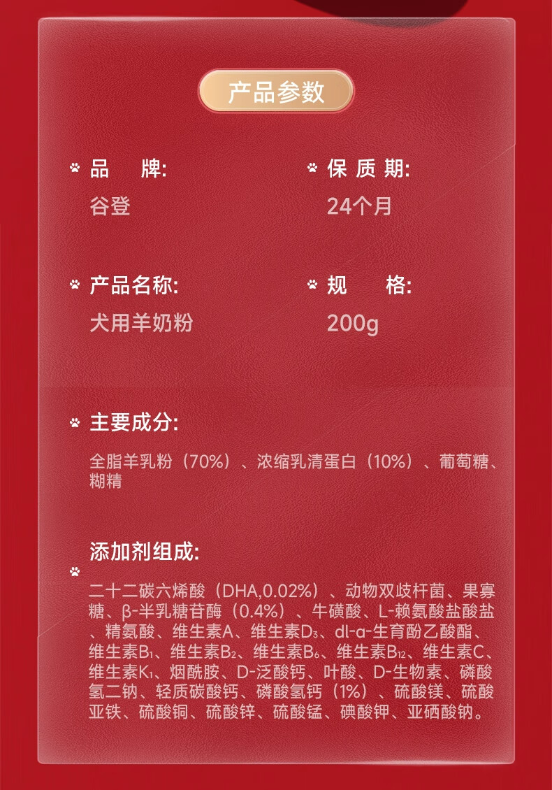 谷登羊奶粉狗狗宠物幼犬金毛泰迪营养品成犬专用补钙小狗吃的奶粉 70%羊乳-【共450g】2罐*200g+送50g