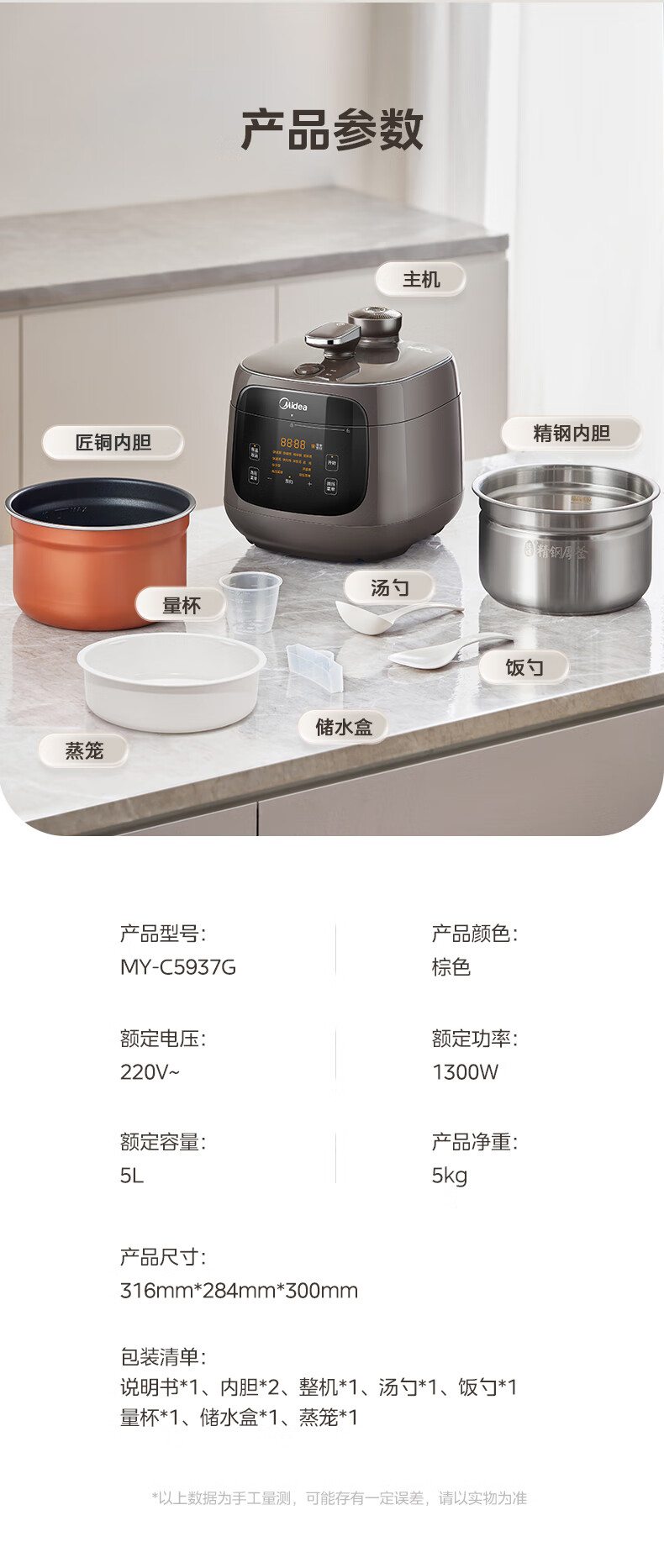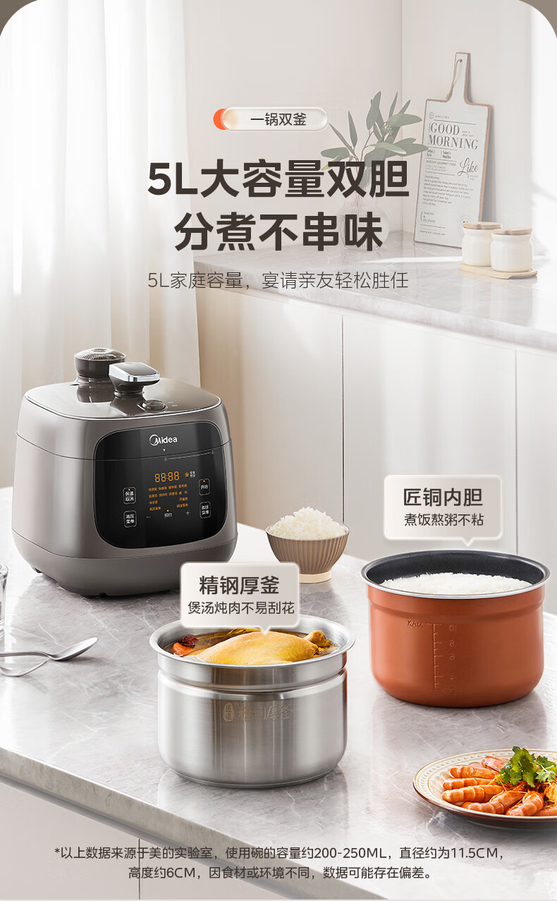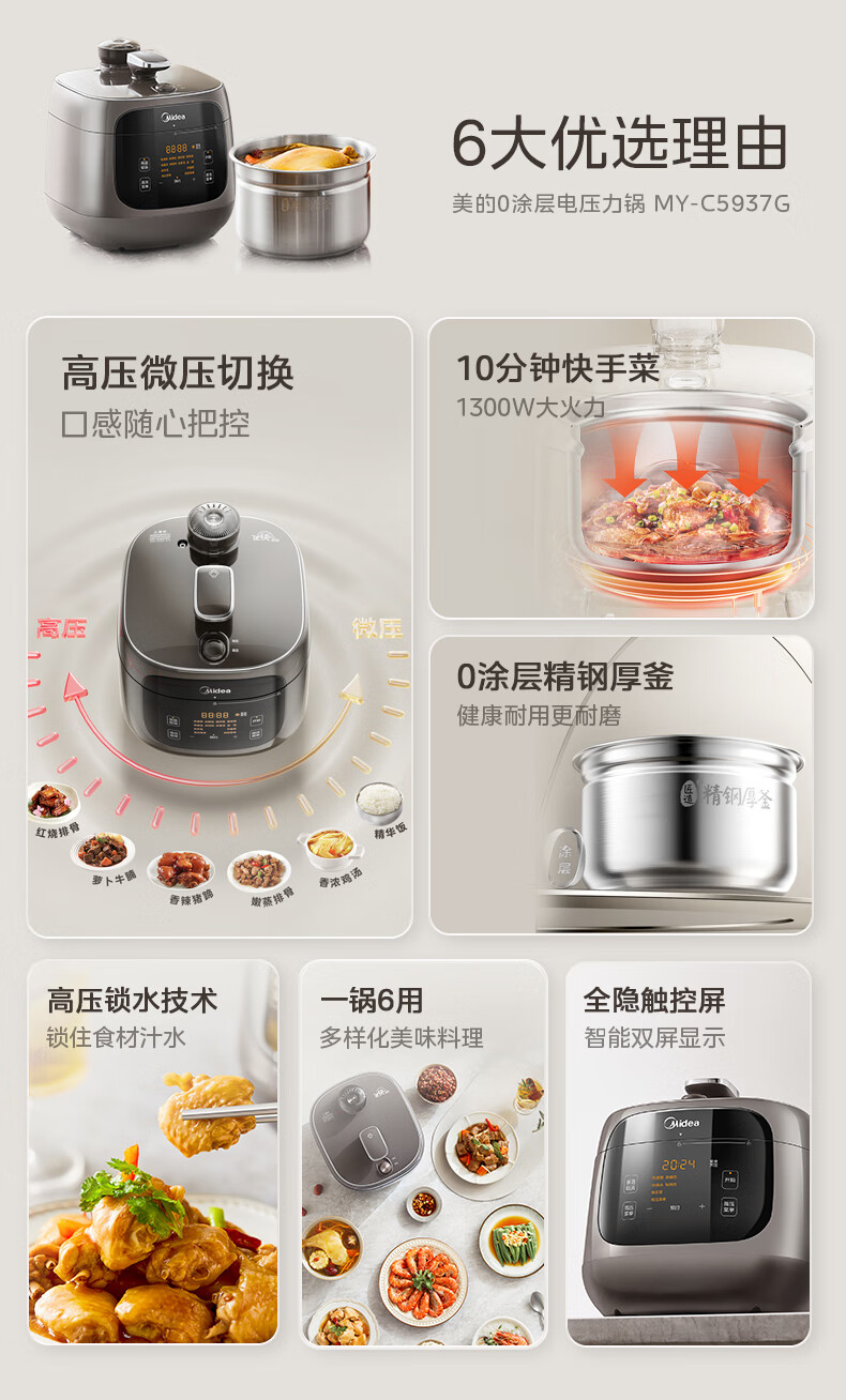 美的(Midea)0涂层电压力锅1300w猛火高微压快手菜 全自动智能预约触控煲汤电饭煲高压锅5L MY-C5937G 【0涂层精钢厚釜】高微压切换 5L