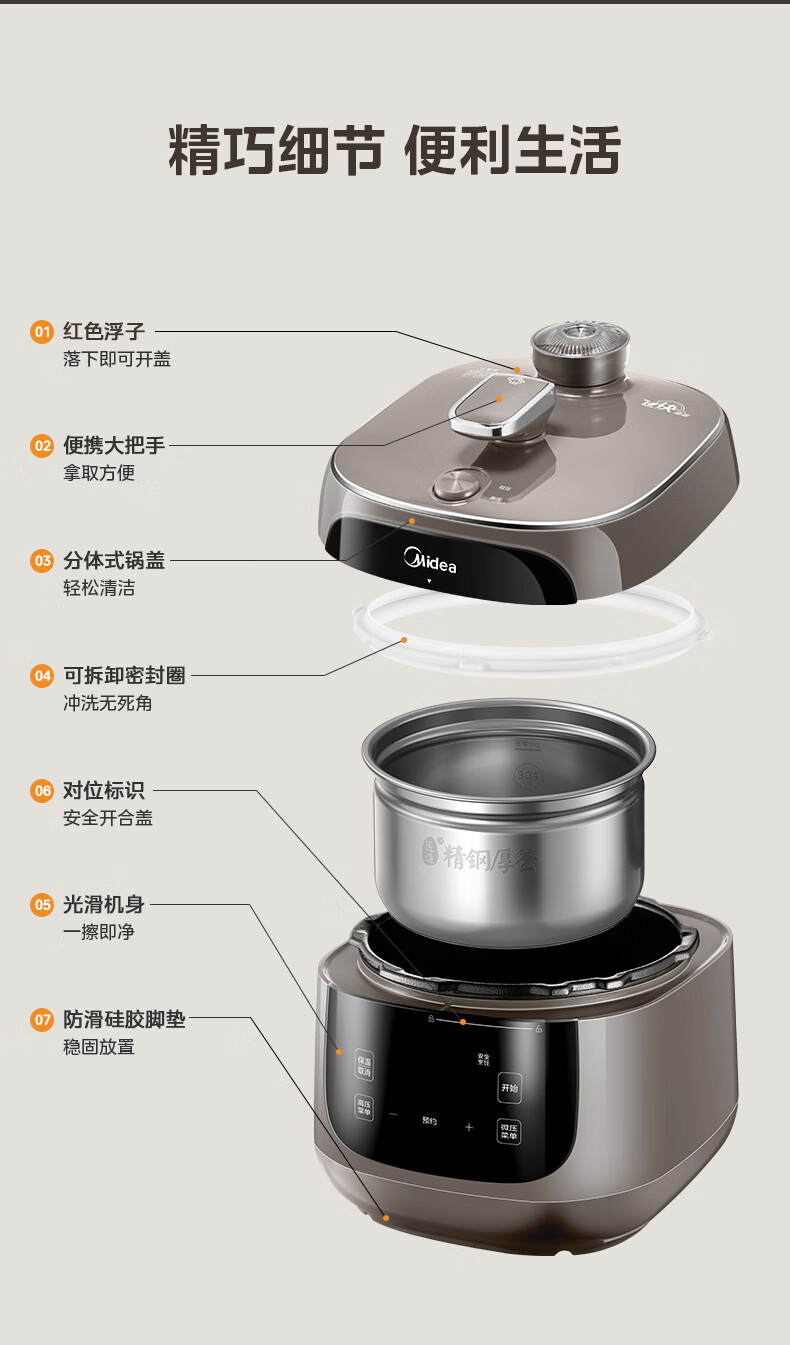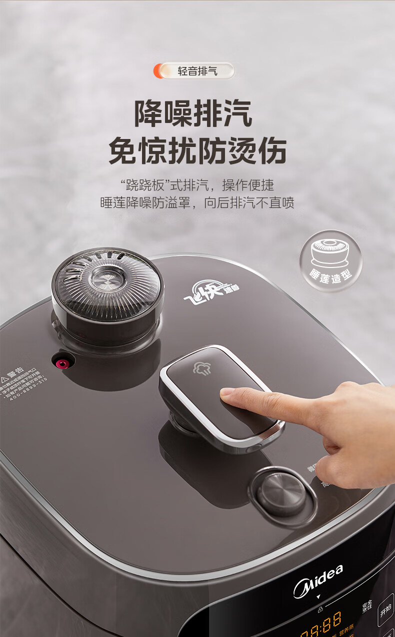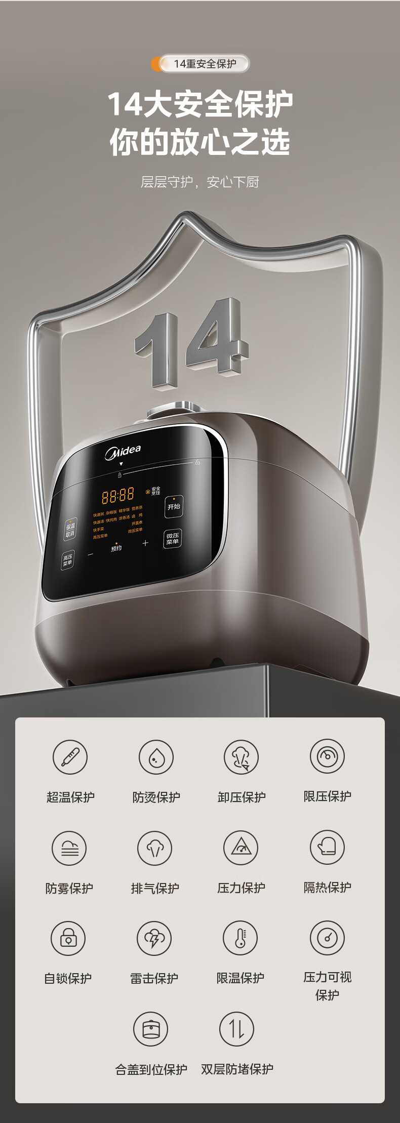 美的(Midea)0涂层电压力锅1300w猛火高微压快手菜 全自动智能预约触控煲汤电饭煲高压锅5L MY-C5937G 【0涂层精钢厚釜】高微压切换 5L
