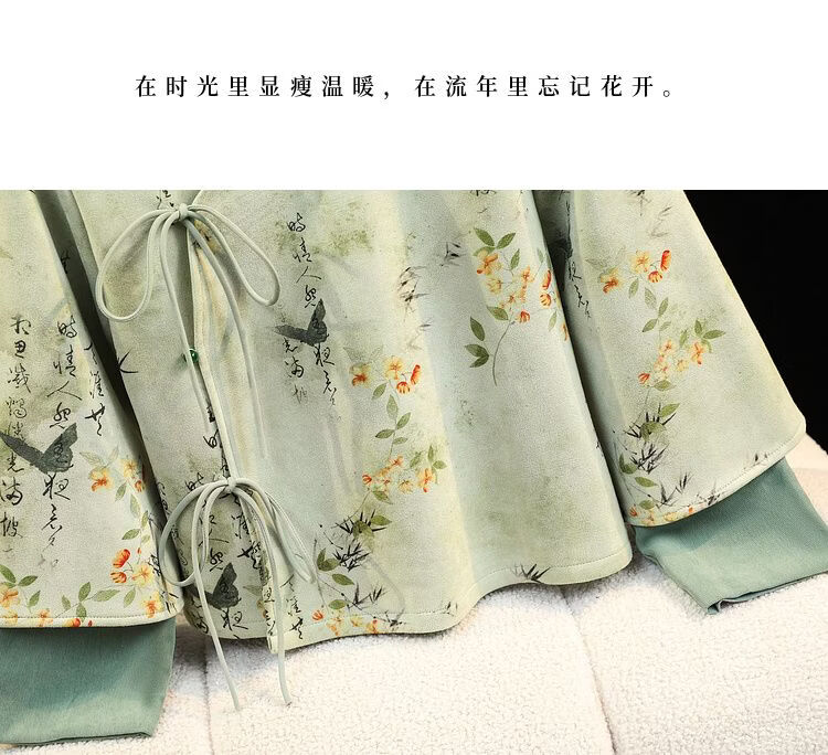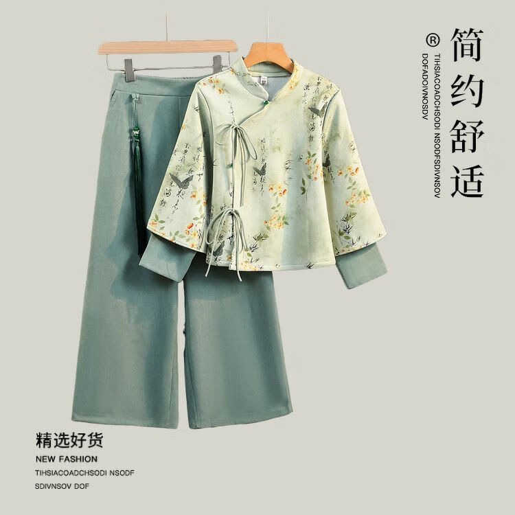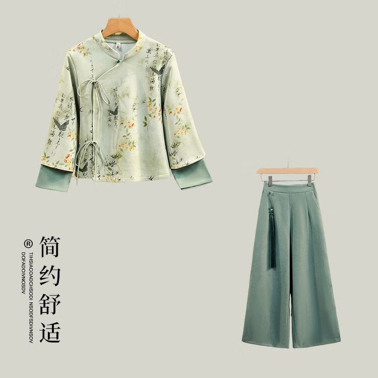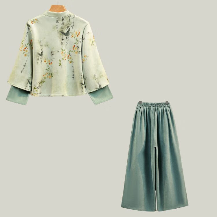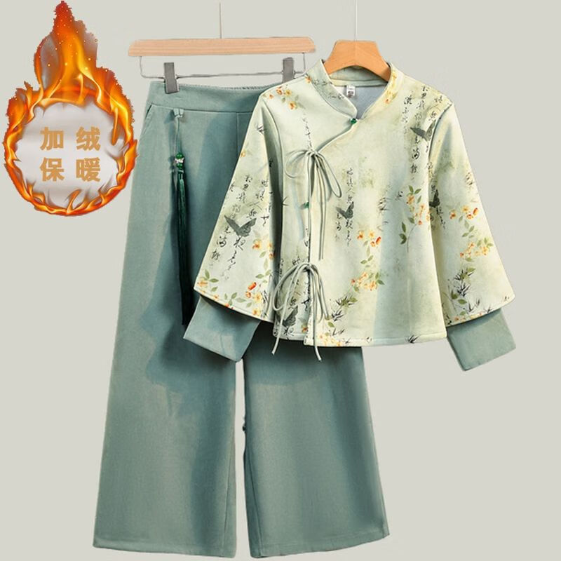 新中式复古国风水墨字印花加绒唐装阔腿裤改良汉服气质茶服套装女 常规雪融花上衣+橘红裤 M