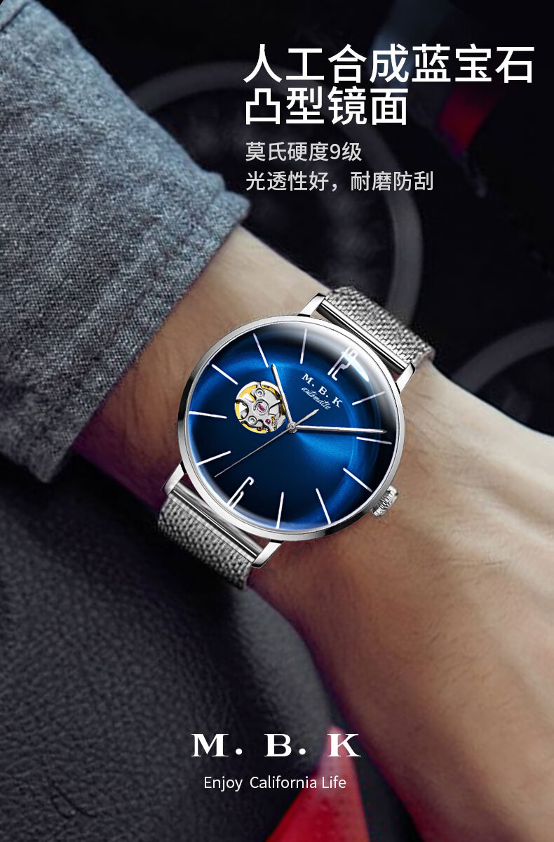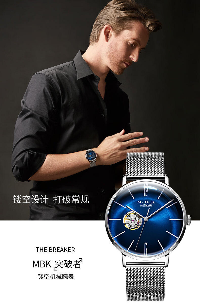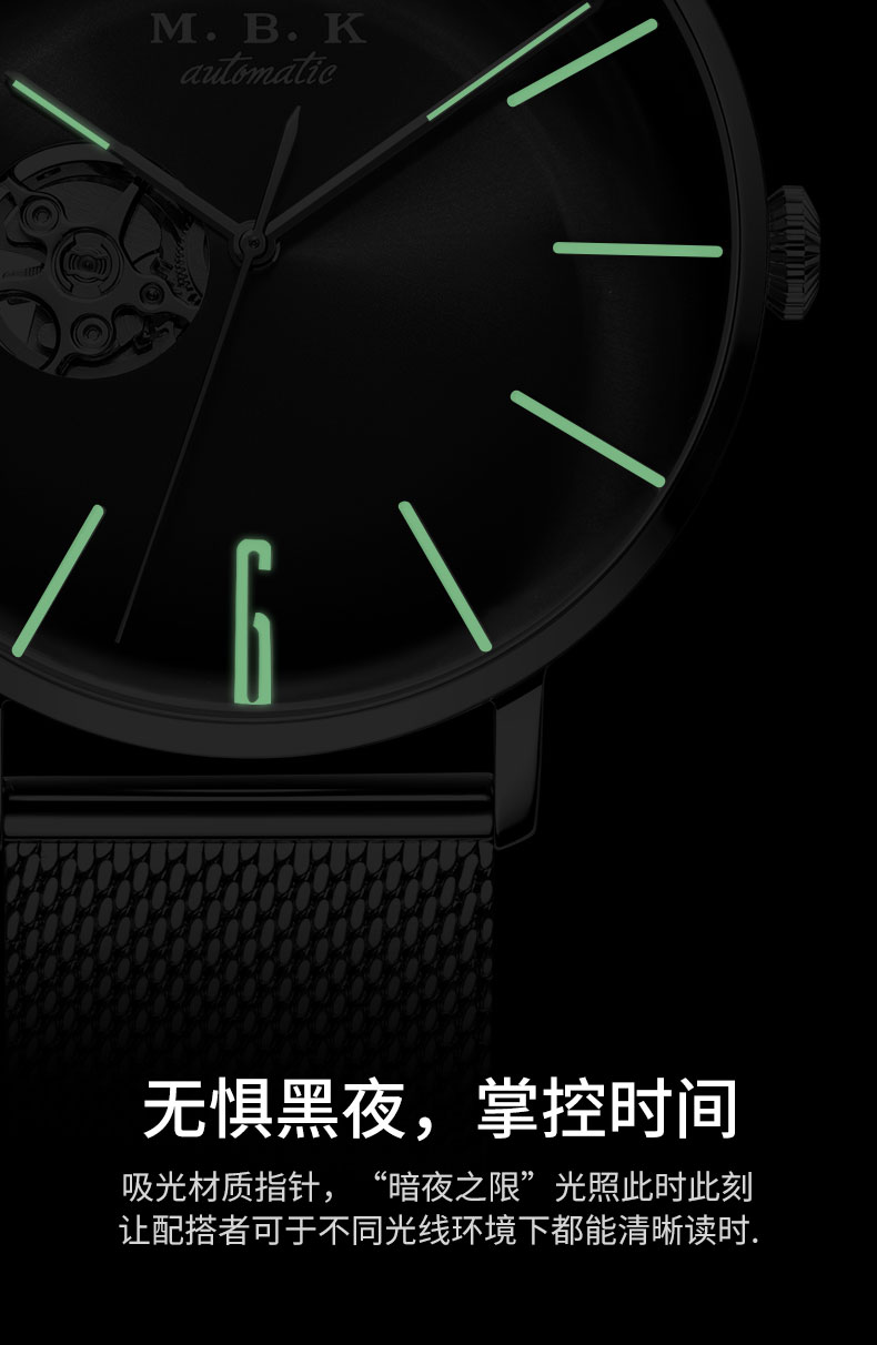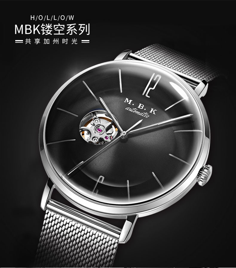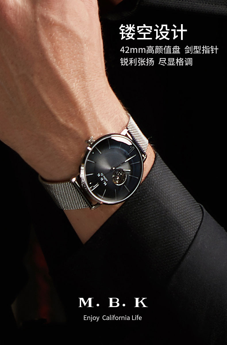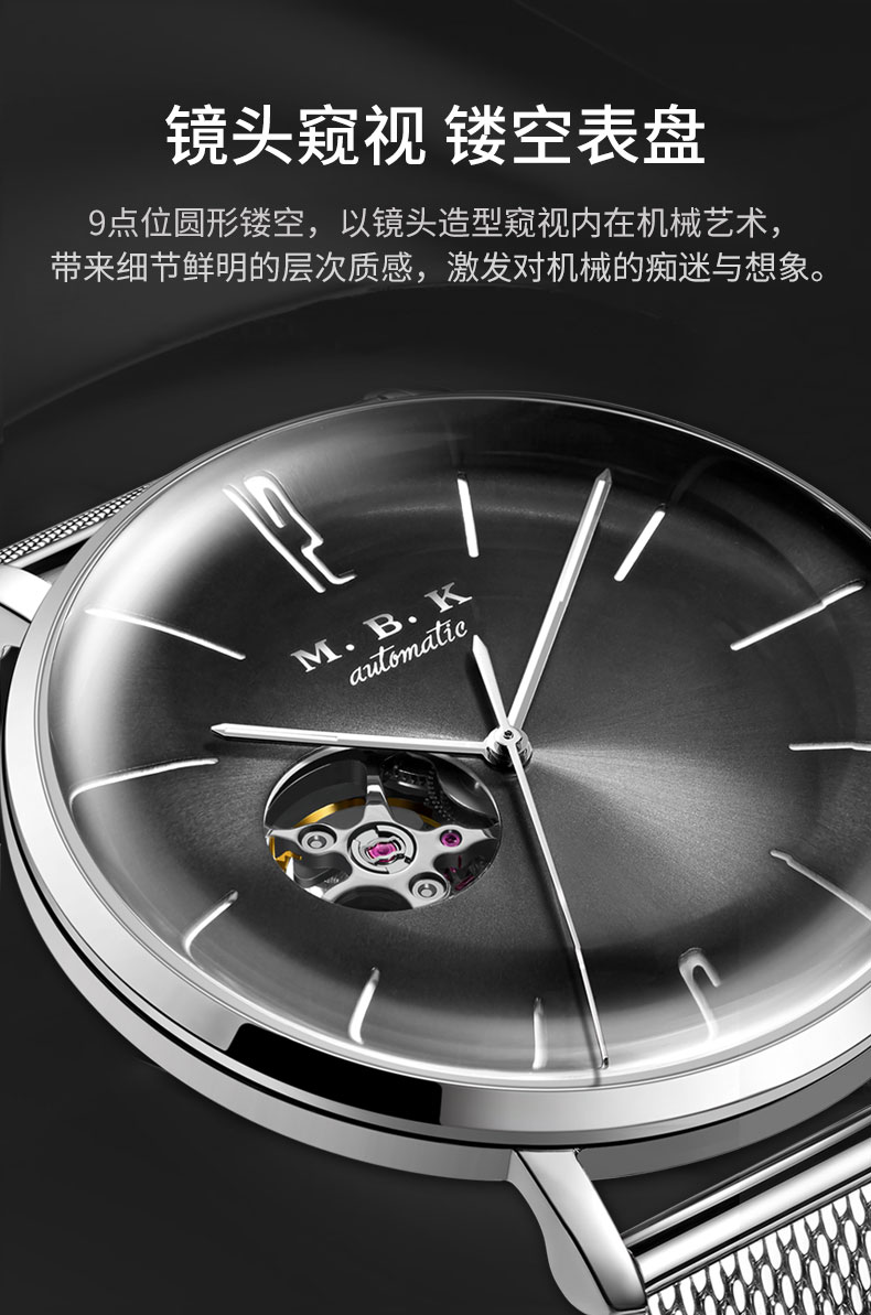 M.B.K美国品牌进口手表男士机械表镂空全自动3D弧面夜光防水潮流男腕表 米兰钢带/黑面/【进口机芯】