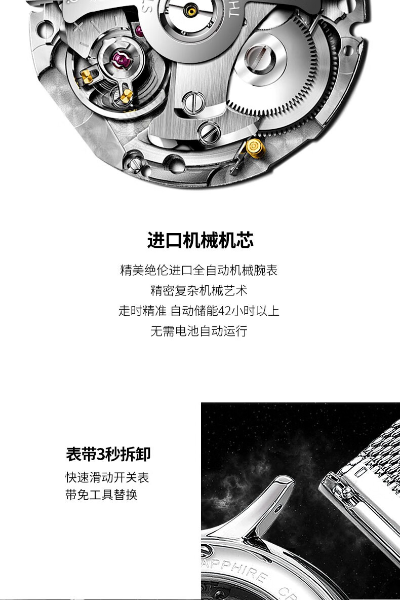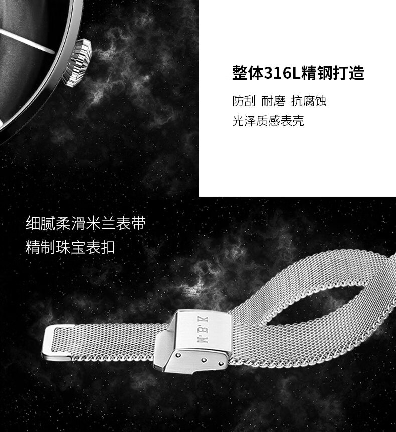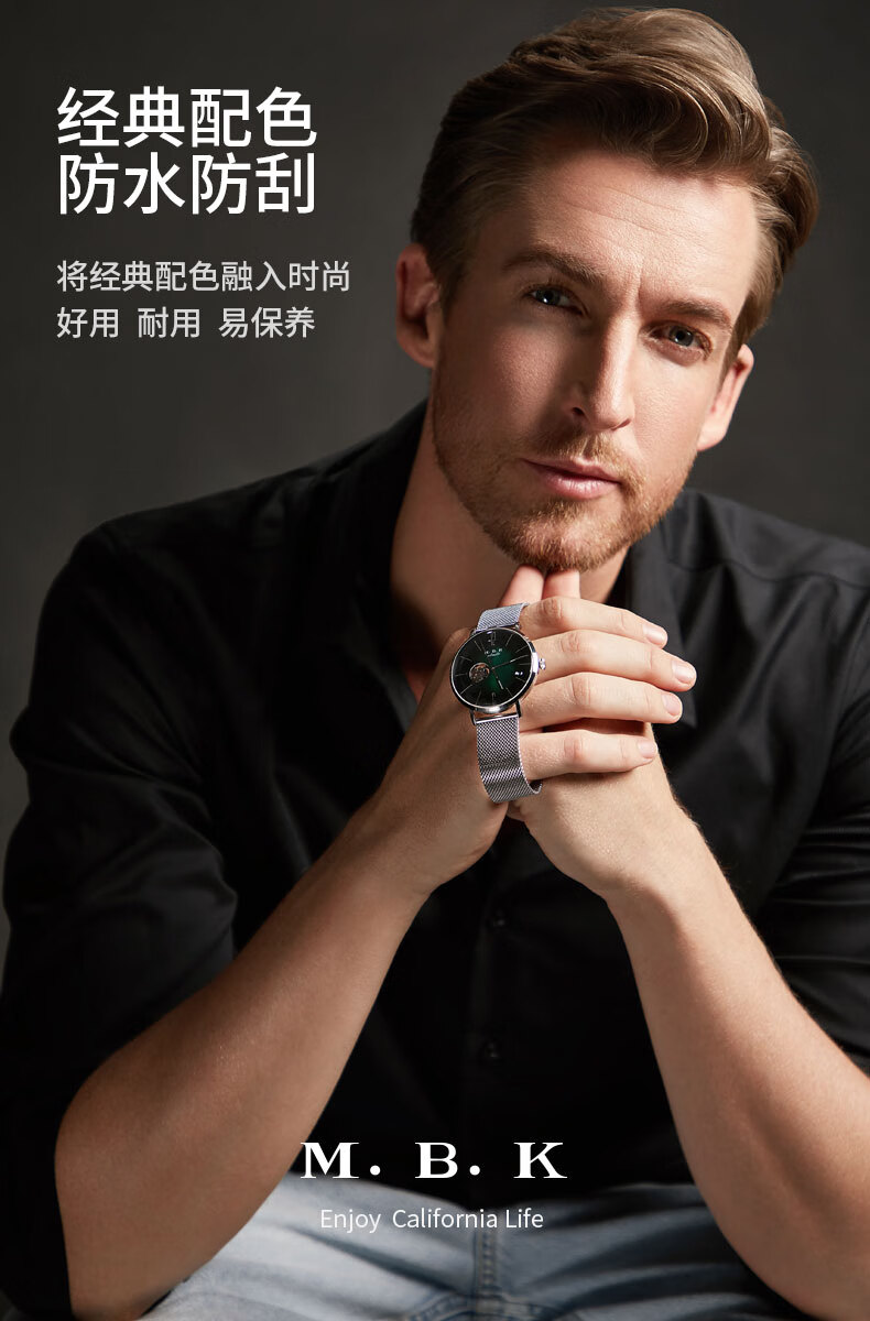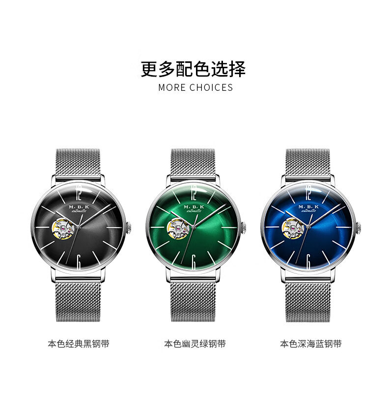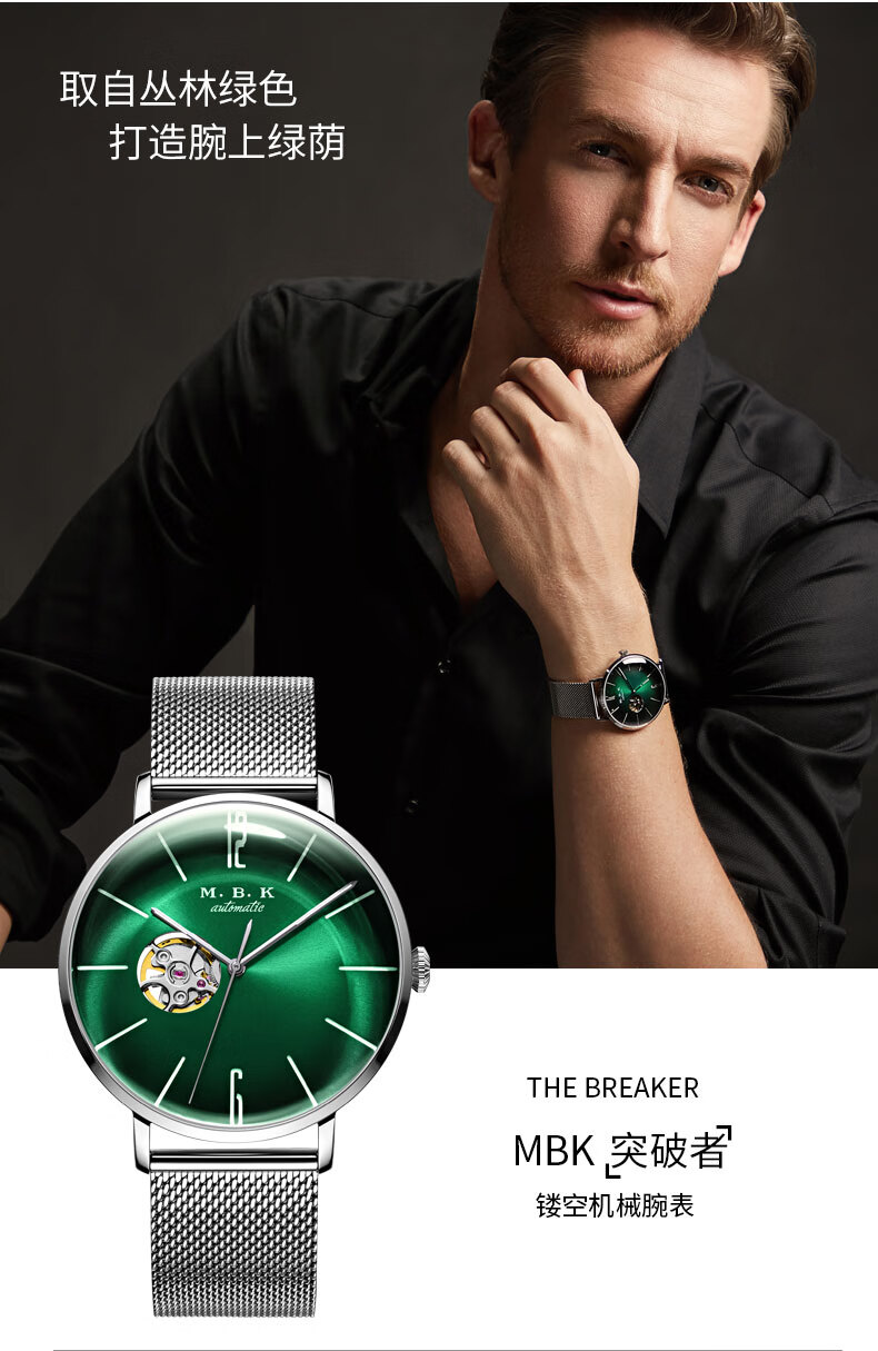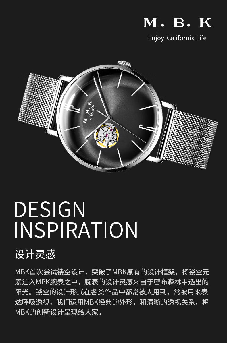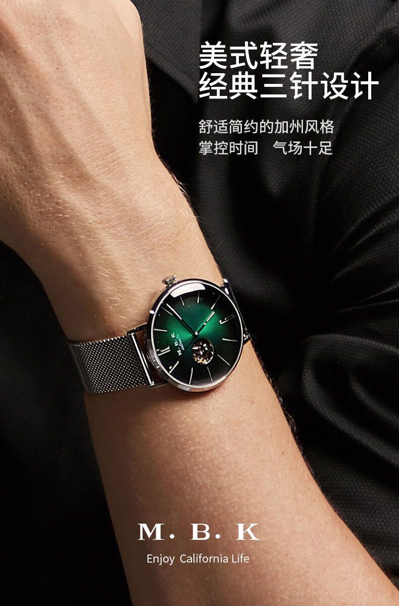 M.B.K美国品牌进口手表男士机械表镂空全自动3D弧面夜光防水潮流男腕表 米兰钢带/黑面/【进口机芯】