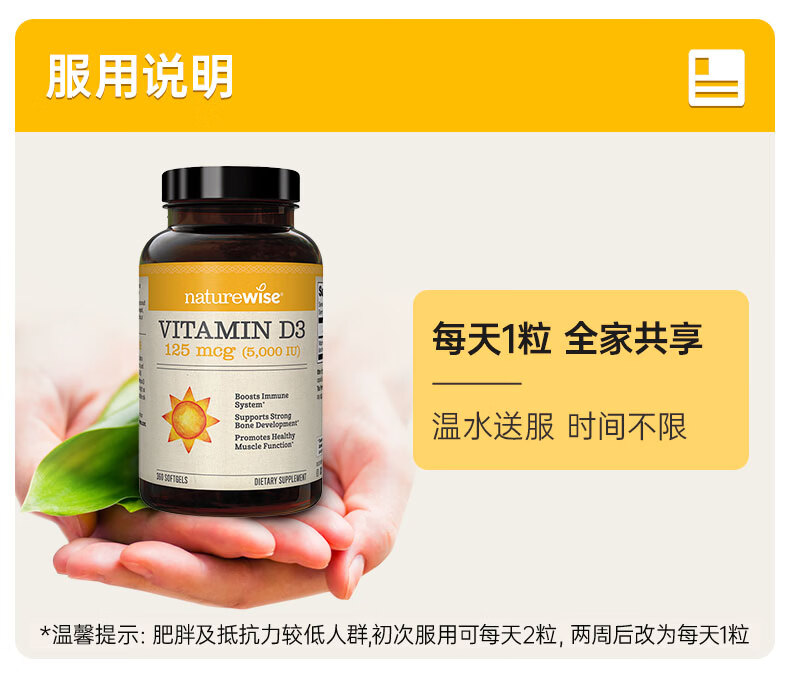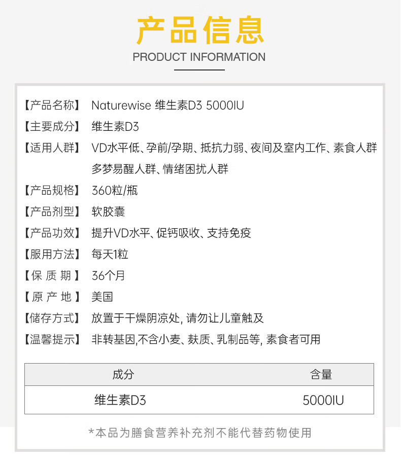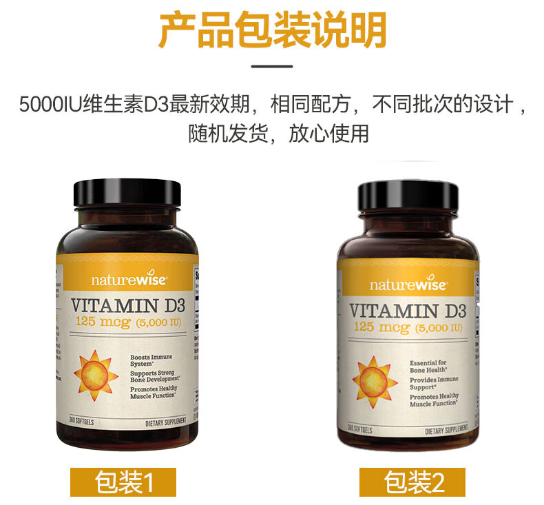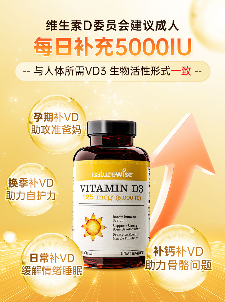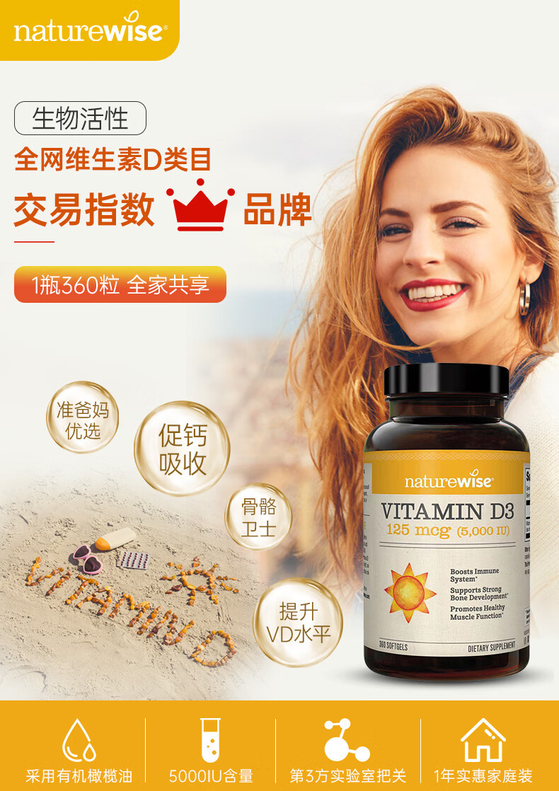 naturewise阳光瓶维生素D3软胶囊5000iu备孕成人儿童青少年补钙360粒美国 5000iu 360粒*1瓶 【备孕/成人】