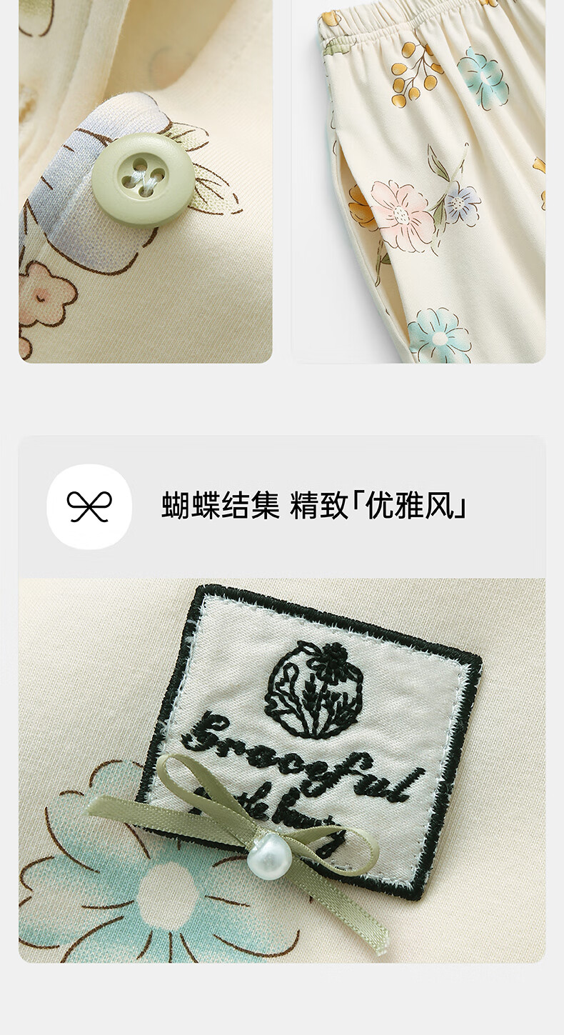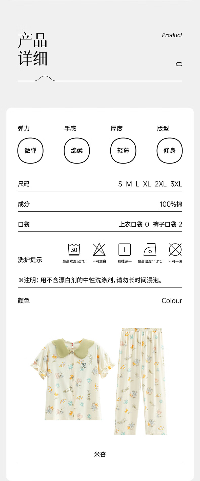 芬腾新款睡衣女夏季纯棉短袖长裤套装可外穿空调宽松大码全棉家居服 FJ26921903米杏 M 建议:90-110斤