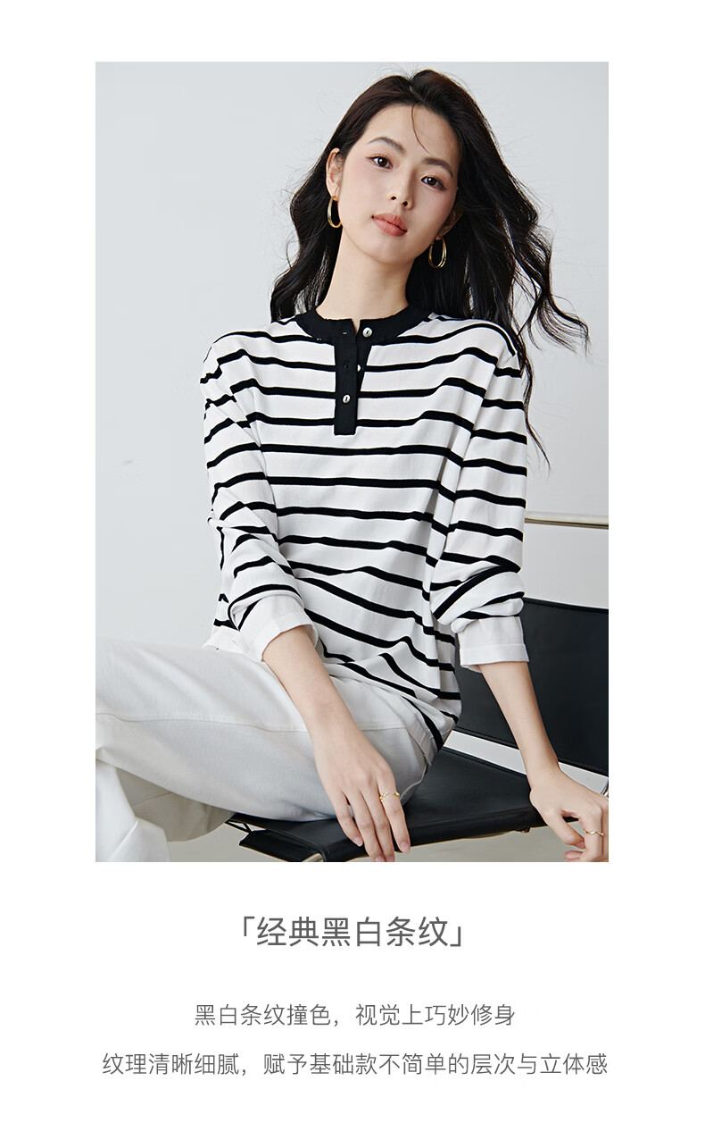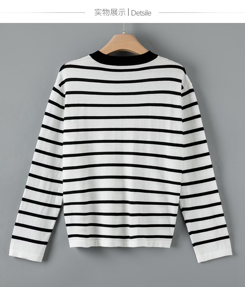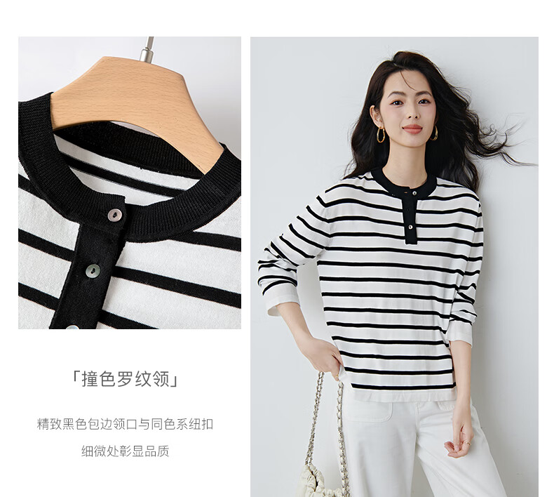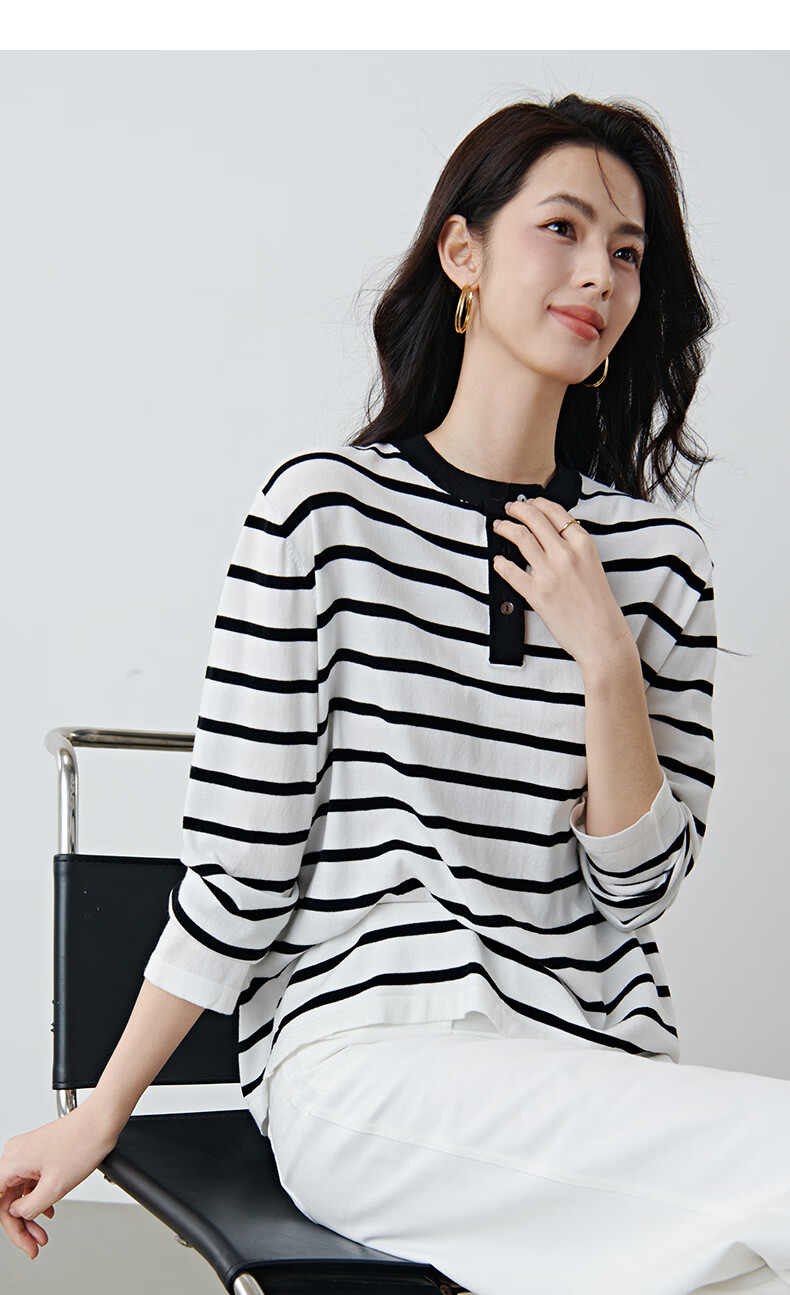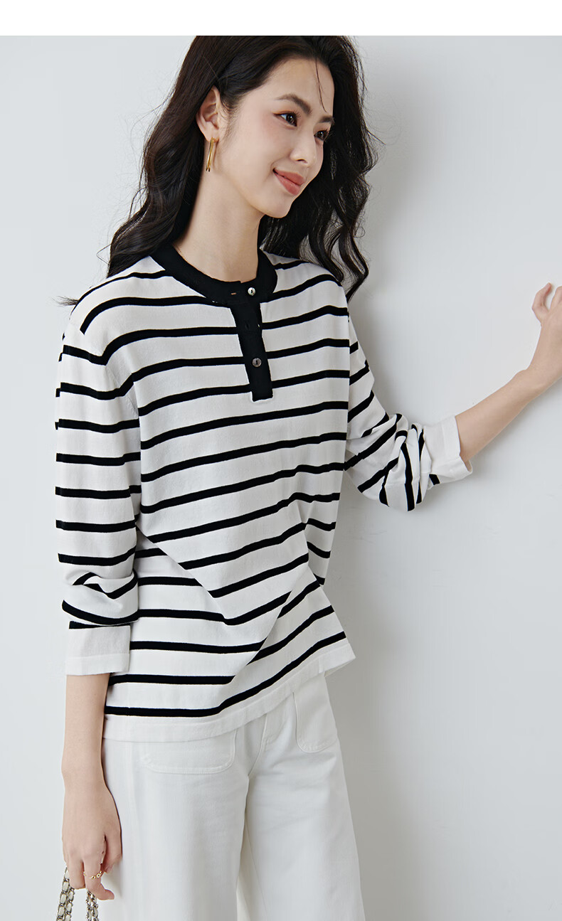 晚白【新品】2026春法式松弛感圆领条纹大码上衣软糯舒适莱赛尔针织衫 条纹 M