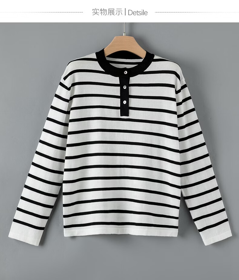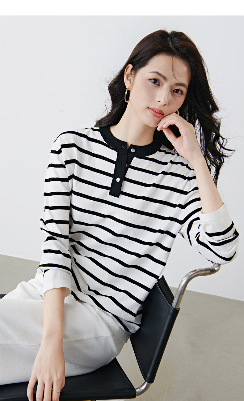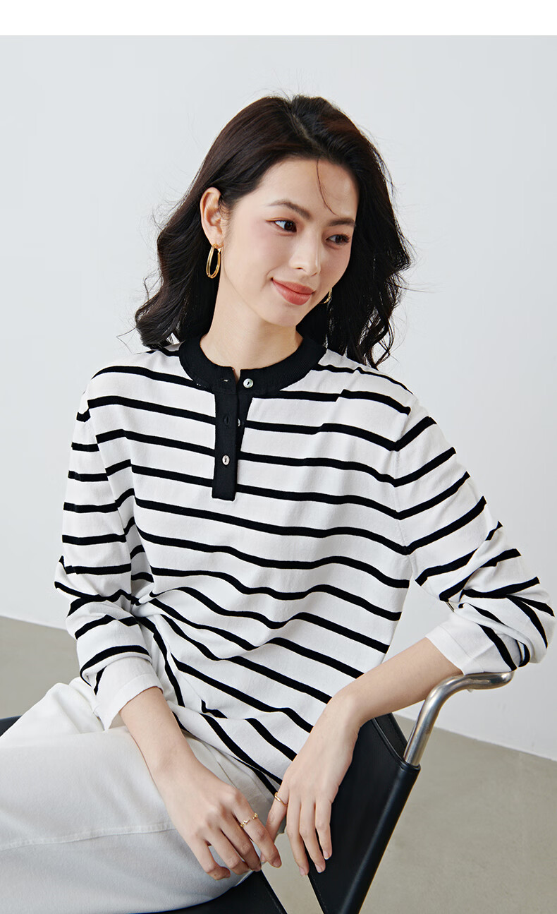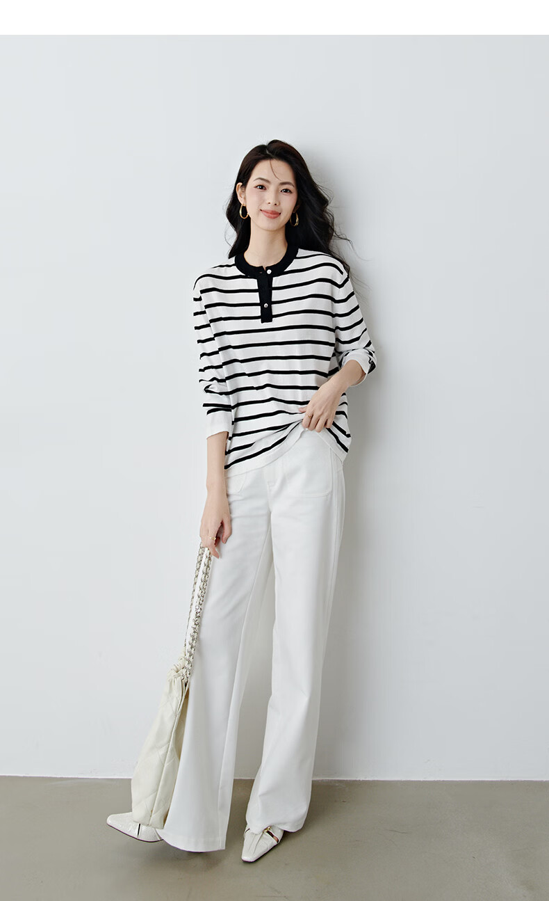 晚白【新品】2026春法式松弛感圆领条纹大码上衣软糯舒适莱赛尔针织衫 条纹 M