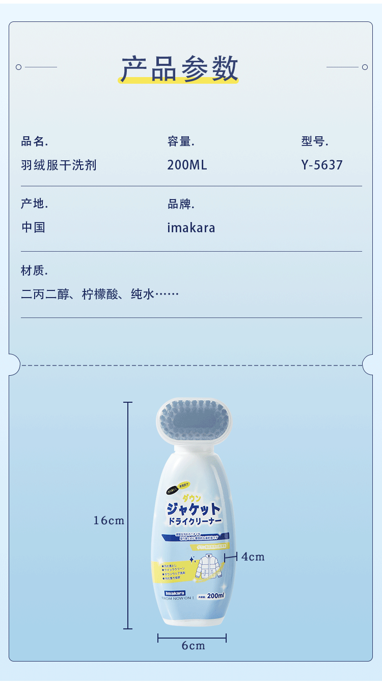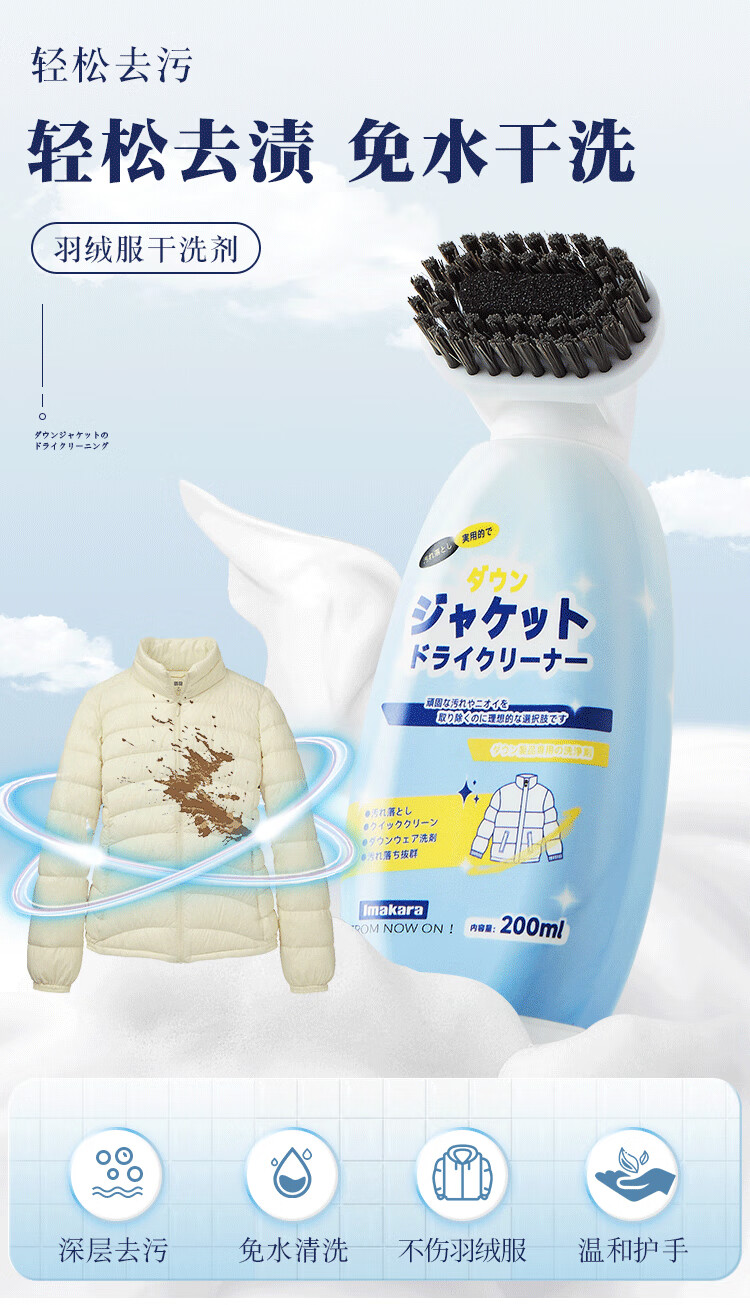 Imakara干洗羽绒服清洗剂干洗剂顽固污渍清洁剂去油渍洗衣服免水洗神器 1瓶 200ML
