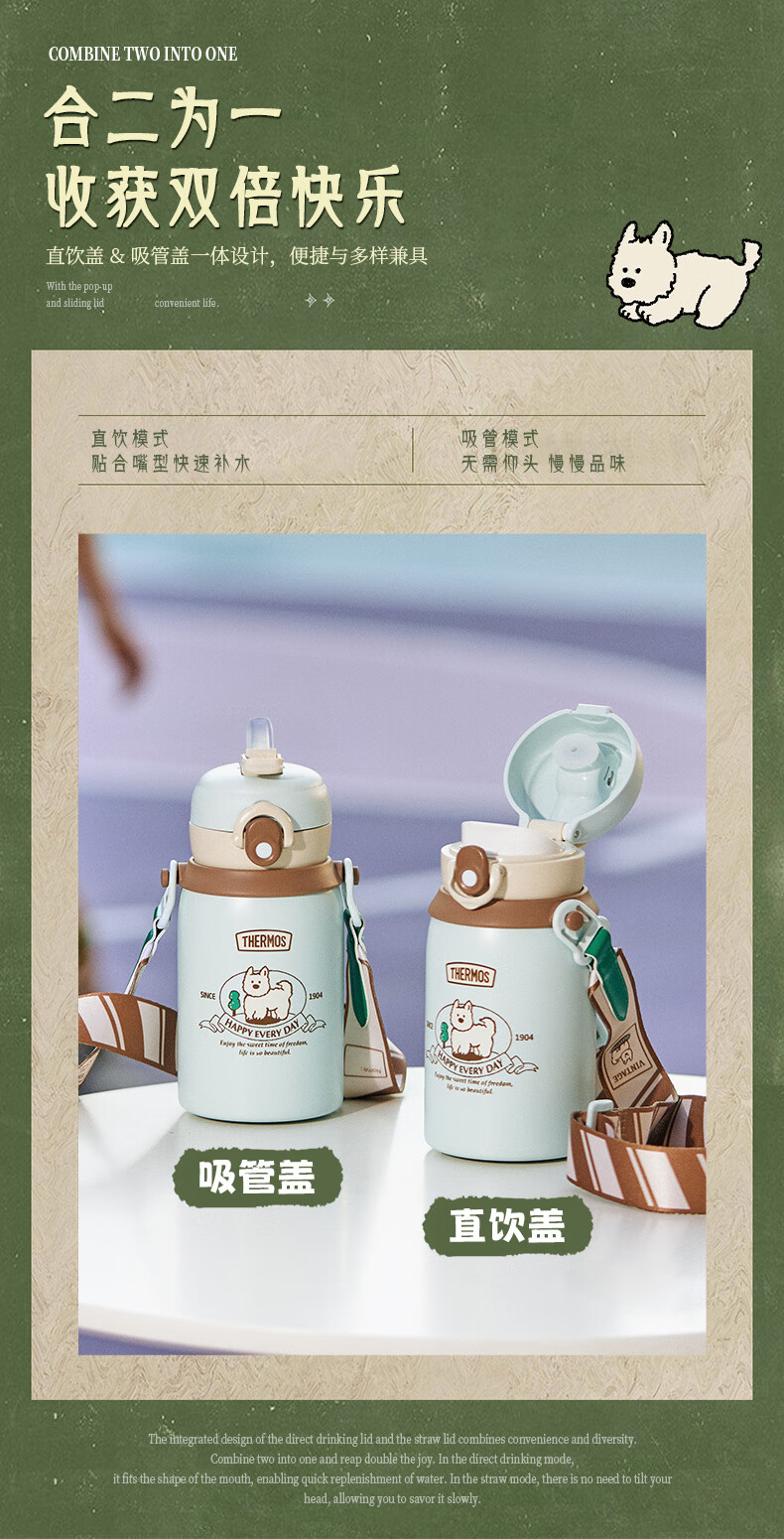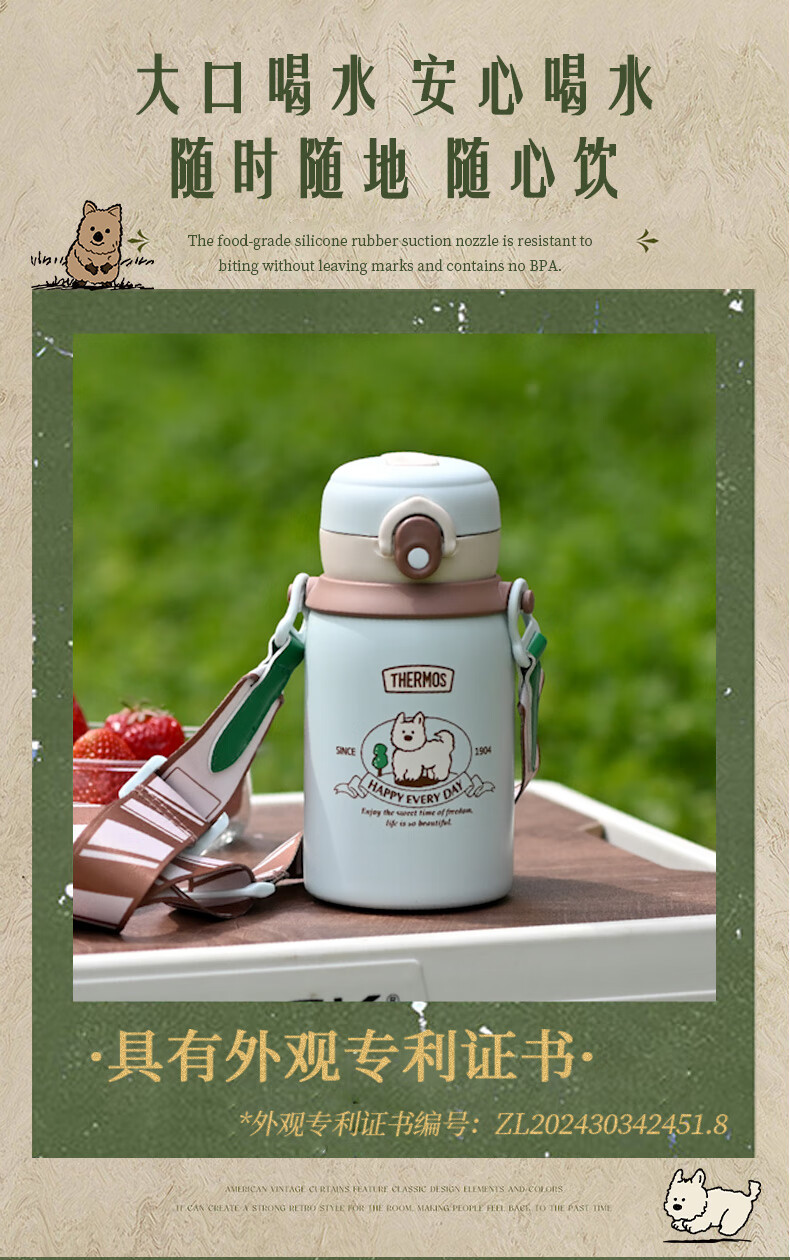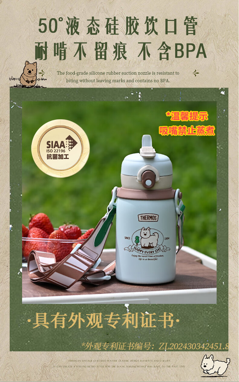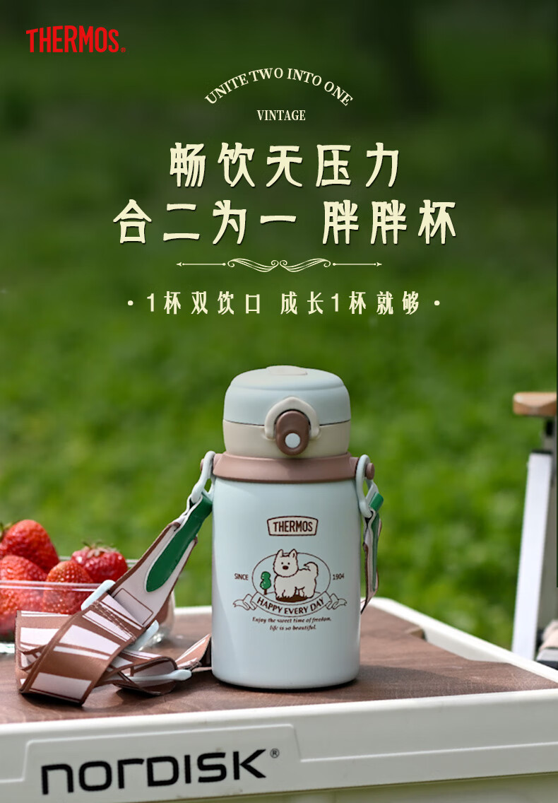 膳魔师(THERMOS)儿童保温杯美式复古316L不锈钢双饮杯肩带吸管直饮学生杯TCKN
