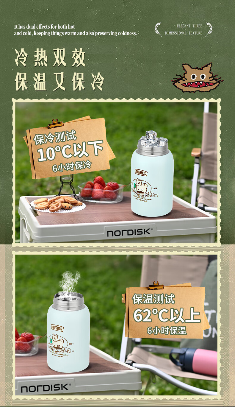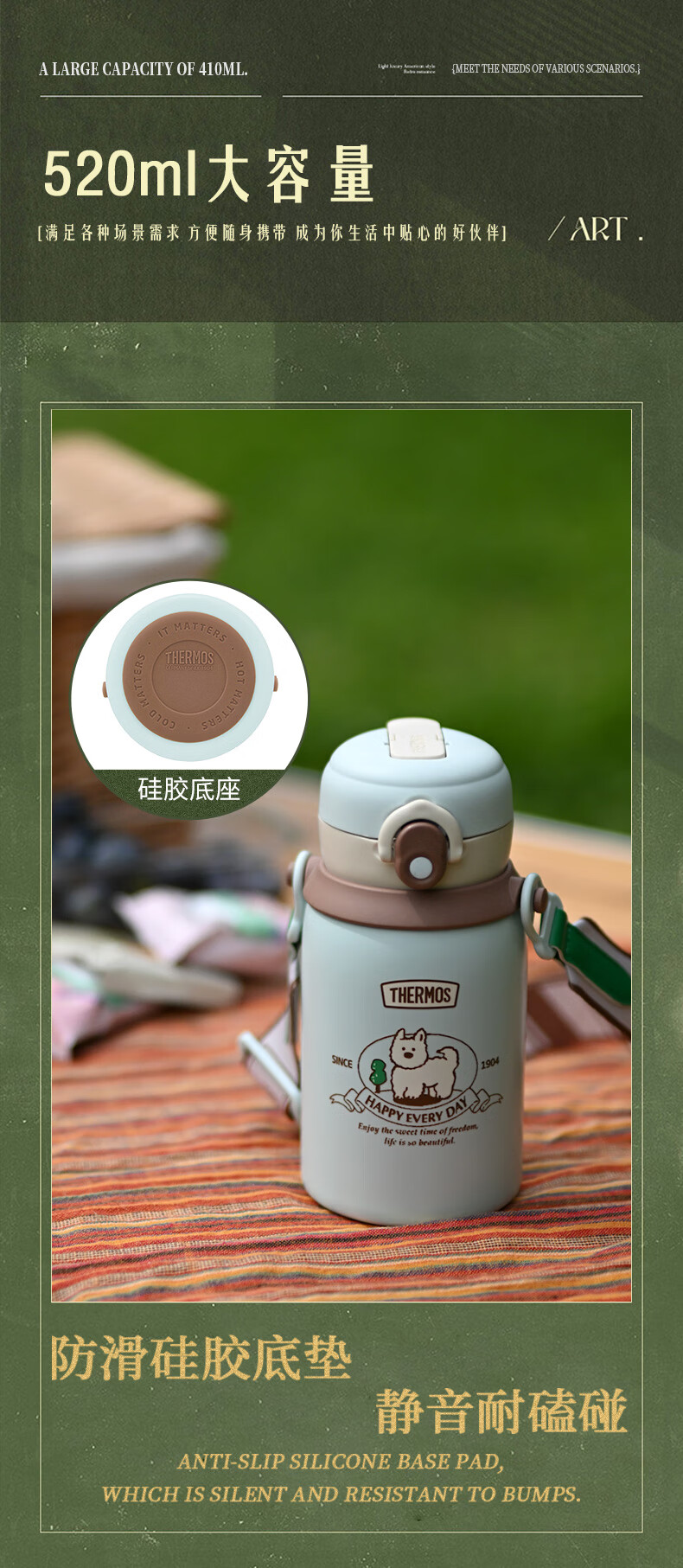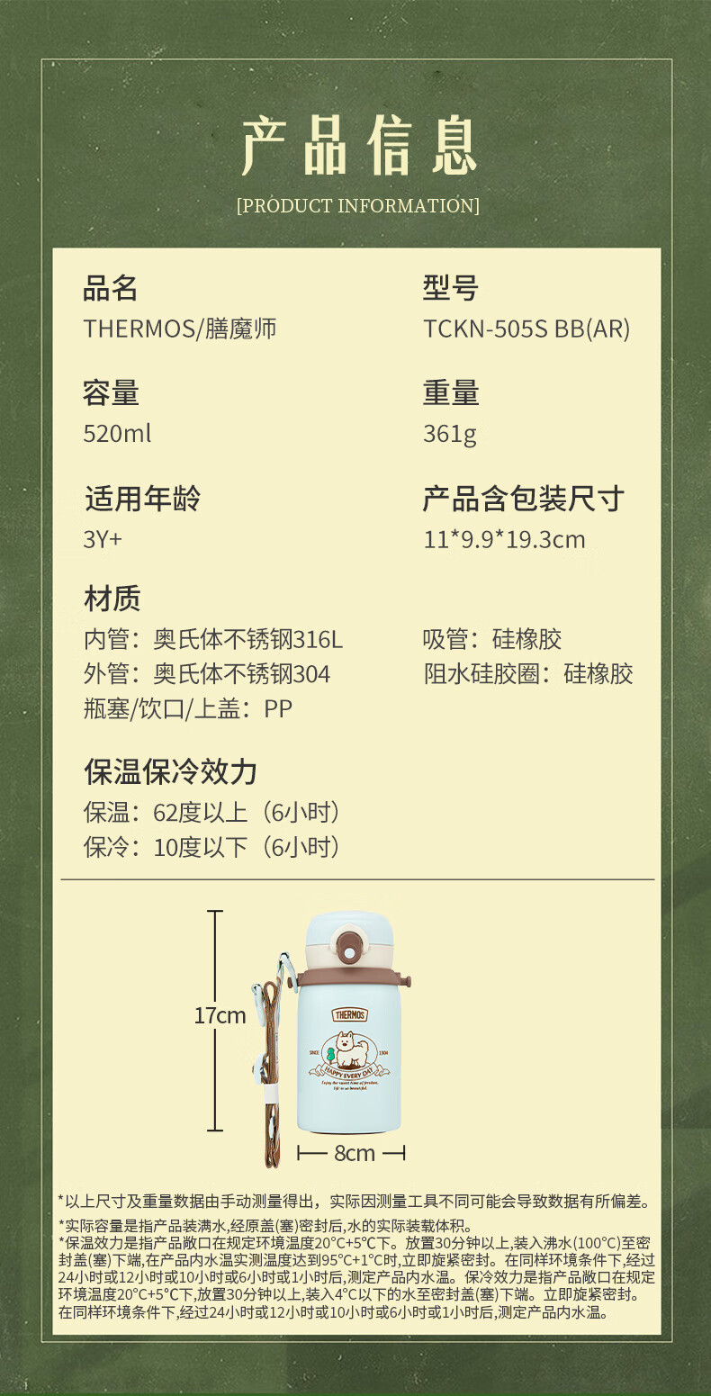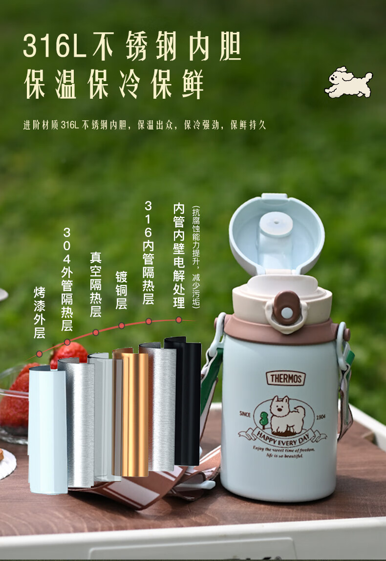 膳魔师(THERMOS)儿童保温杯美式复古316L不锈钢双饮杯肩带吸管直饮学生杯TCKN