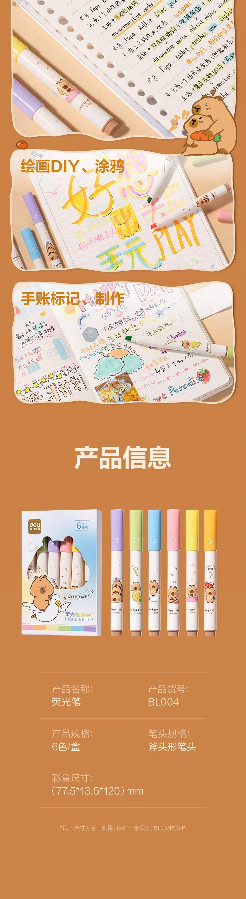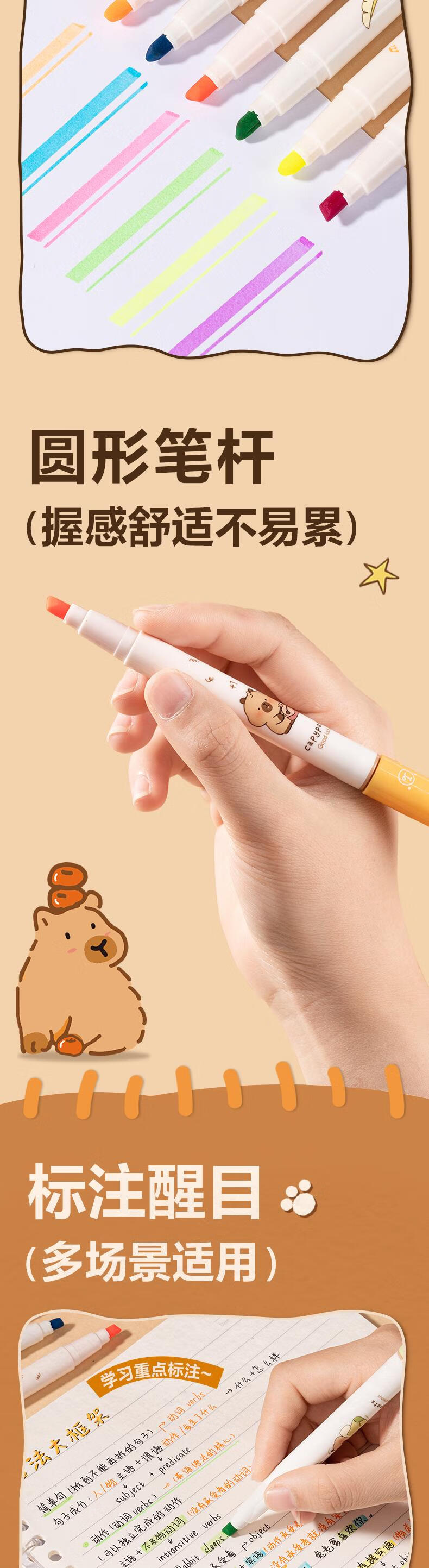 得力卡皮巴拉6色荧光笔 考试复习划重点彩色醒目标记笔手帐笔 学生文具 6支/盒 BL004