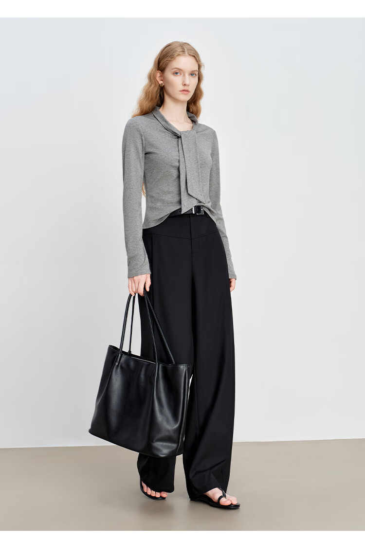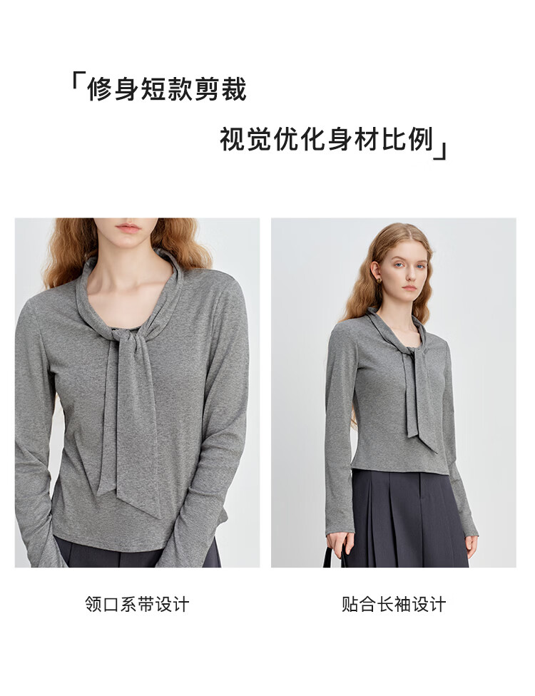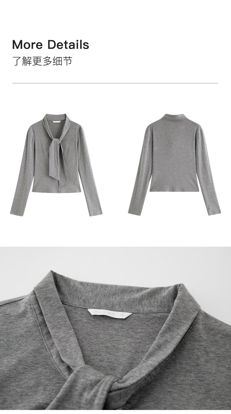 自巧小个子领口系带修身针织T恤女长袖翻领上衣2026年春季新品 花灰色 XS (尺码:2)