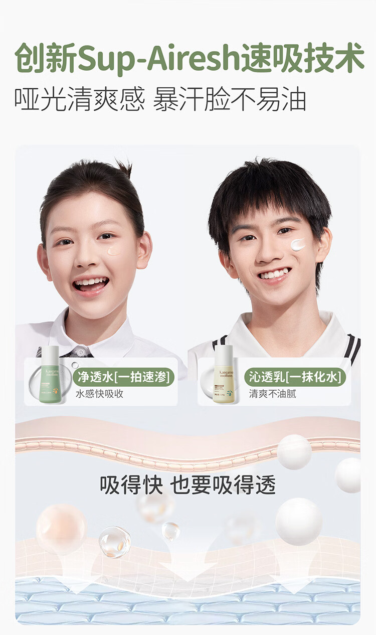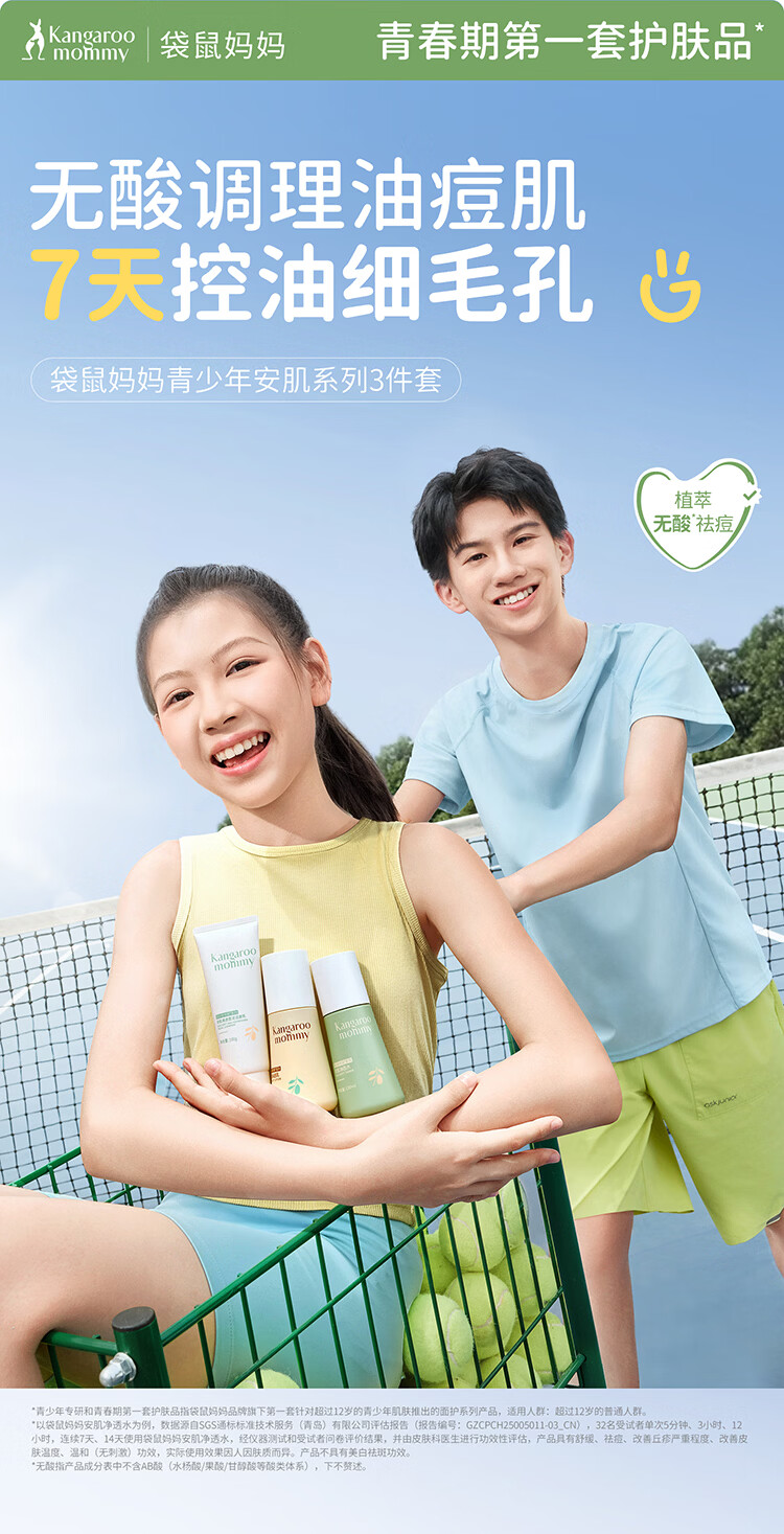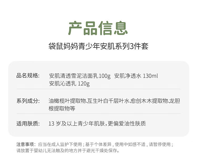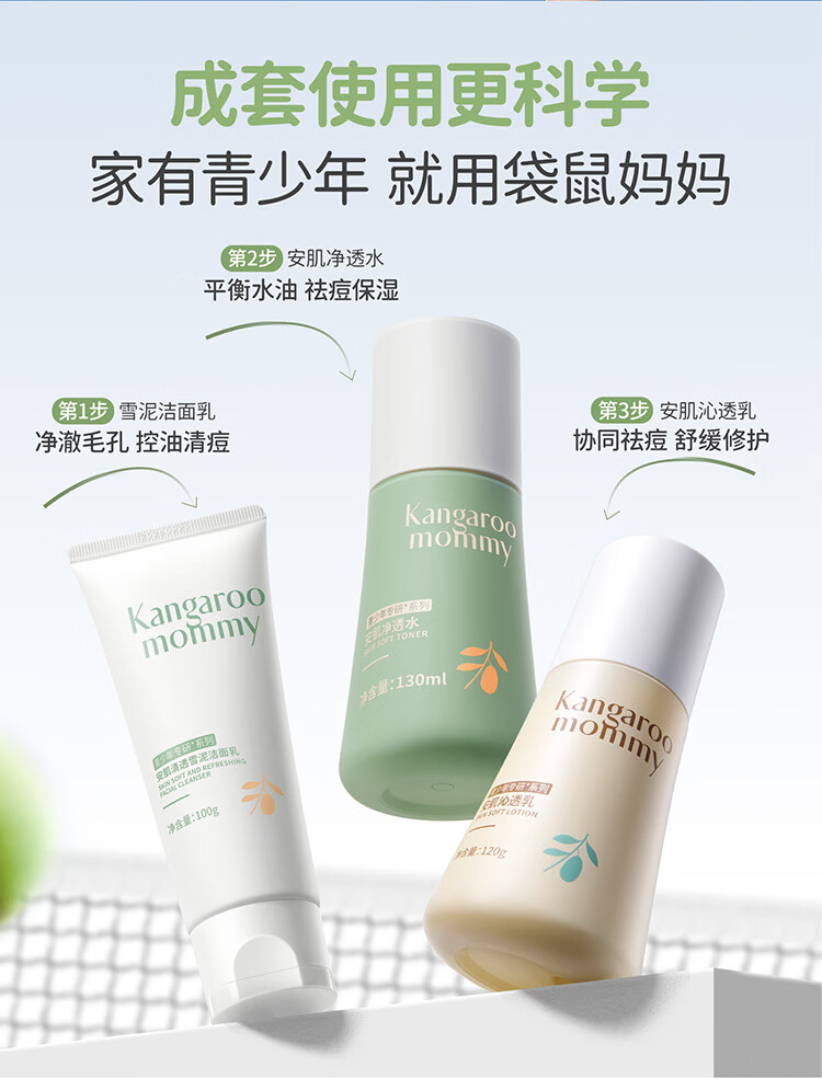 袋鼠妈妈青少年洁水乳三件套护肤组合清爽保湿补水滋润组合男女通用12岁+ 【到手】洁80g+水145ml+乳130g(热卖)