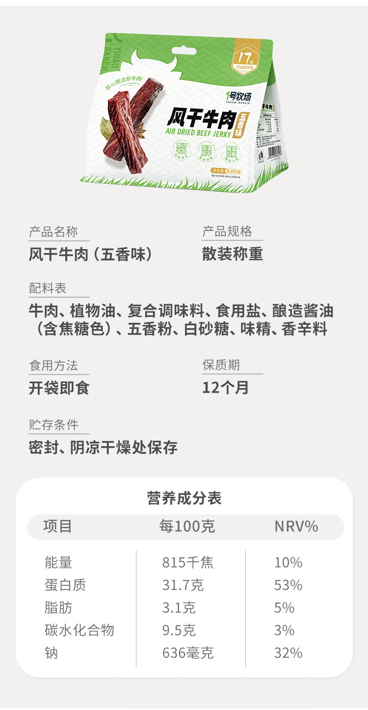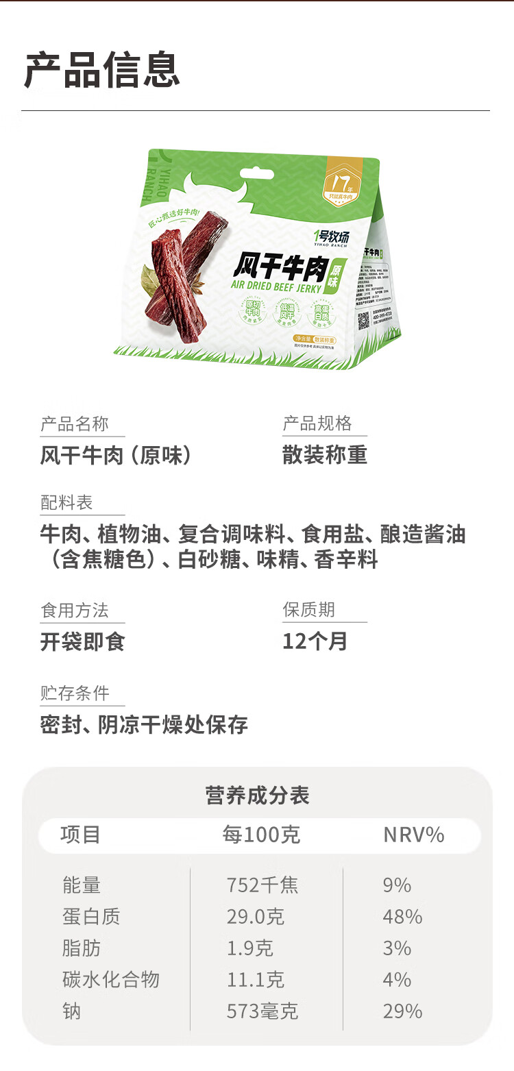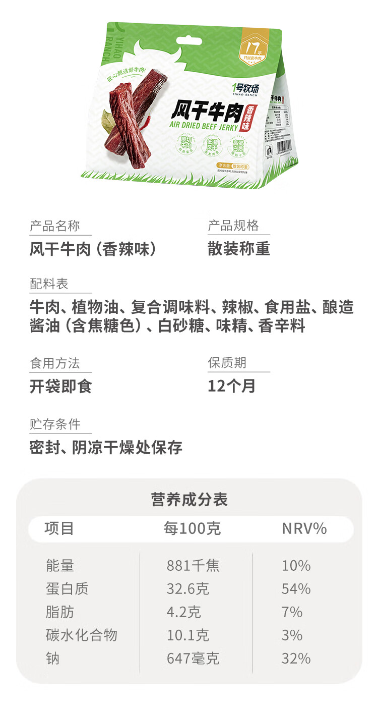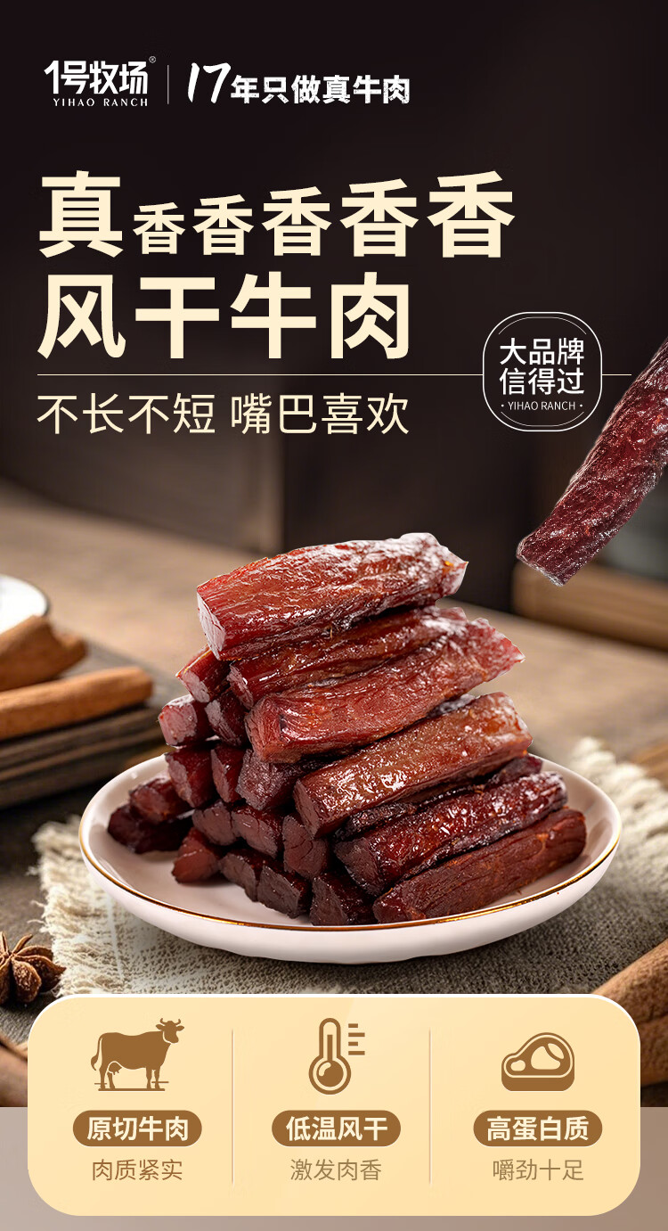 一号牧场 风干牛肉散称400g 香辣 稍软 肉干肉脯 休闲零食 牛肉干