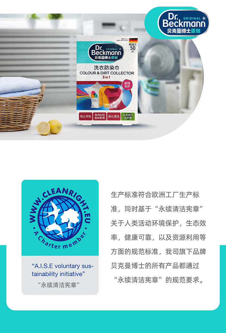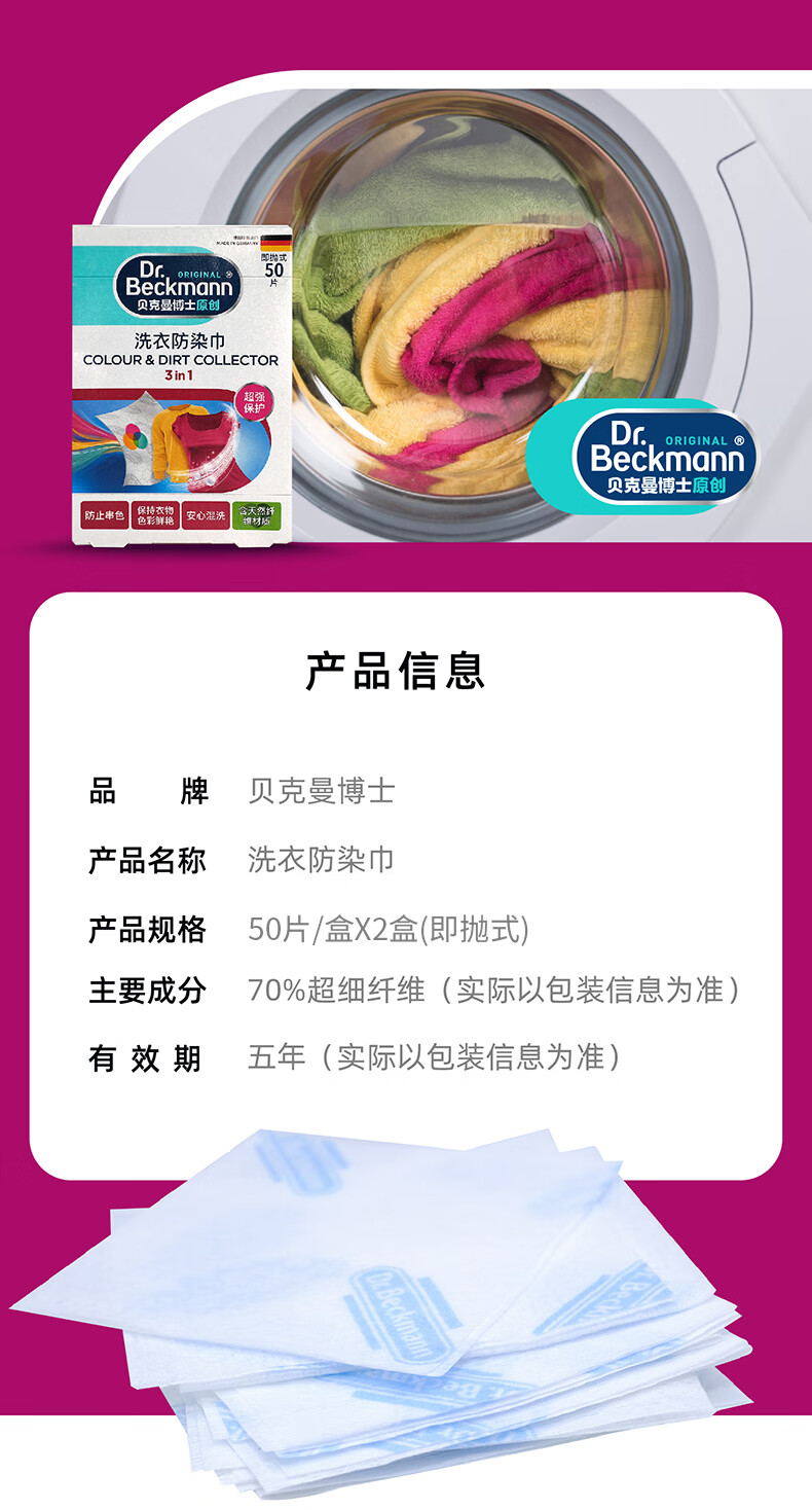 贝克曼博士(Dr.Beckmann)洗衣防染巾100片色母片抗染色吸色片混洗防衣服串色 混洗无忧