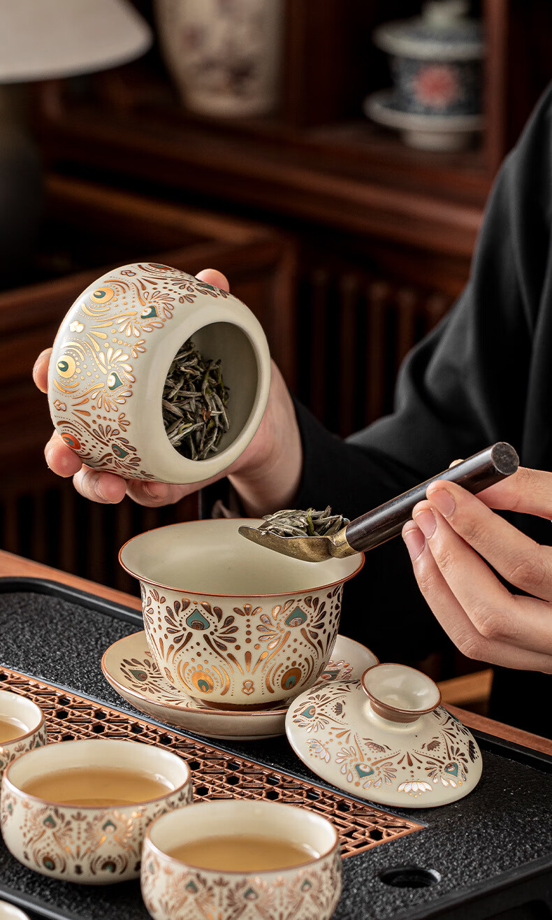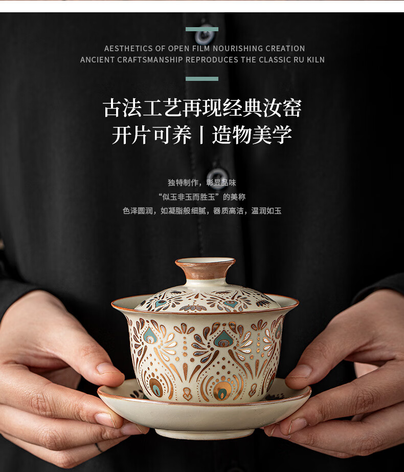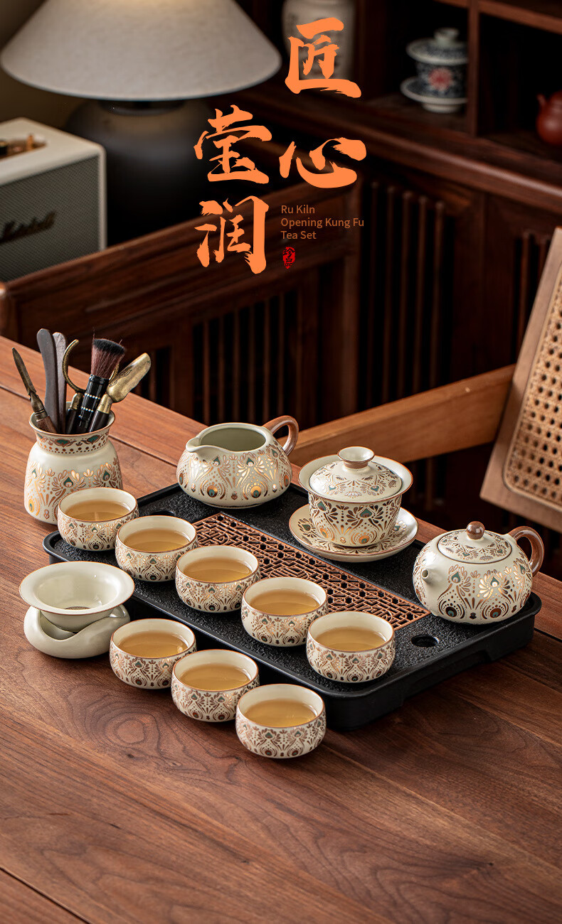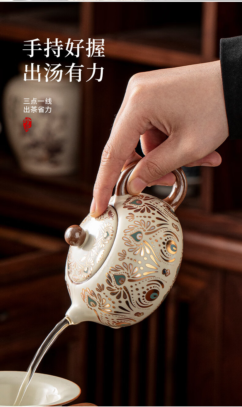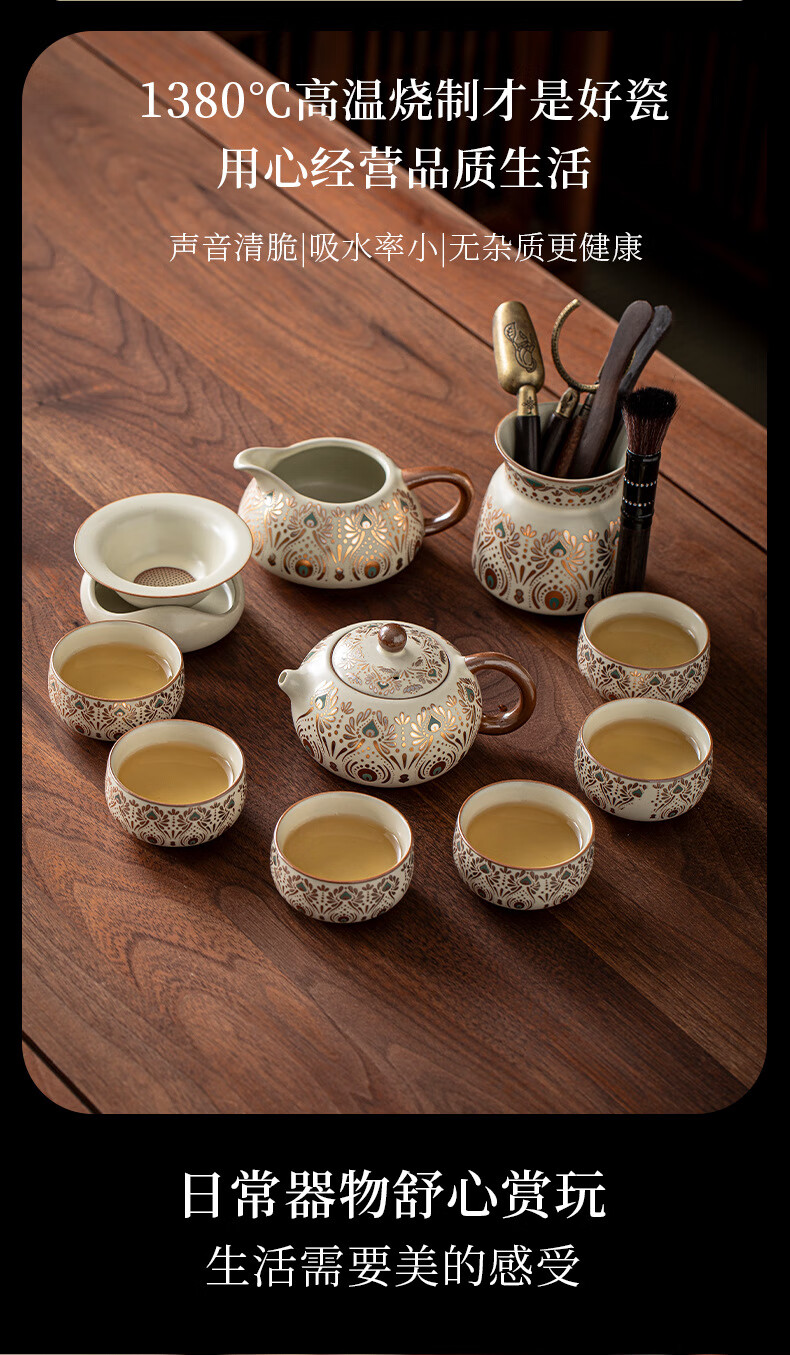 文枝敦煌汝窑功夫茶具套装家用办公室高档盖碗茶杯整套新年节日送礼品 古韵敦煌提梁壶9件套+礼盒